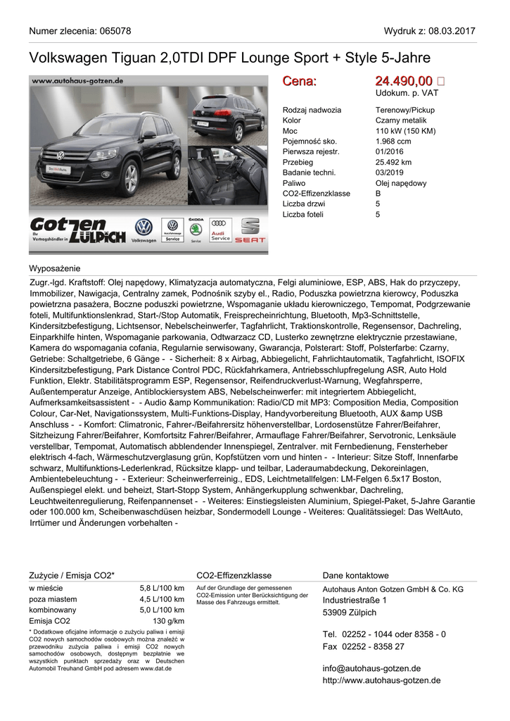 Numer zlecenia: 065078 Wydruk z: 08.03.2017 Volkswagen Tiguan 2,0TDI DPF Lounge Sport + Style 5-Jahre Cena: 24.490,00 Rodzaj nadwozia Kolor Moc Pojemność sko. Pierwsza rejestr. Przebieg Badanie techni. Paliwo CO2-Effizenzklasse Liczba drzwi Liczba foteli Terenowy/Pickup Czarny metalik 110 kW (150 KM) 1.968 ccm 01/2016 25.492 km 03/2019 Olej napędowy B 5 5 Udokum. p. VAT Wyposażenie Zugr.-lgd. Kraftstoff: Olej napędowy, Klimatyzacja automatyczna, Felgi aluminiowe, ESP, ABS, Hak do przyczepy, Immobilizer, Nawigacja, Centralny zamek, Podnośnik szyby el., Radio, Poduszka powietrzna kierowcy, Poduszka powietrzna pasażera, Boczne poduszki powietrzne, Wspomaganie układu kierowniczego, Tempomat, Podgrzewanie foteli, Multifunktionslenkrad, Start-/Stop Automatik, Freisprecheinrichtung, Bluetooth, Mp3-Schnittstelle, Kindersitzbefestigung, Lichtsensor, Nebelscheinwerfer, Tagfahrlicht, Traktionskontrolle, Regensensor, Dachreling, Einparkhilfe hinten, Wspomaganie parkowania, Odtwarzacz CD, Lusterko zewnętrzne elektrycznie przestawiane, Kamera do wspomagania cofania, Regularnie serwisowany, Gwarancja, Polsterart: Stoff, Polsterfarbe: Czarny, Getriebe: Schaltgetriebe, 6 Gänge - - Sicherheit: 8 x Airbag, Abbiegelicht, Fahrlichtautomatik, Tagfahrlicht, ISOFIX Kindersitzbefestigung, Park Distance Control PDC, Rückfahrkamera, Antriebsschlupfregelung ASR, Auto Hold Funktion, Elektr. Stabilitätsprogramm ESP, Regensensor, Reifendruckverlust-Warnung, Wegfahrsperre, Außentemperatur Anzeige, Antiblockiersystem ABS, Nebelscheinwerfer: mit integriertem Abbiegelicht, Aufmerksamkeitsassistent - - Audio & Kommunikation: Radio/CD mit MP3: Composition Media, Composition Colour, Car-Net, Navigationssystem, Multi-Funktions-Display, Handyvorbereitung Bluetooth, AUX & USB Anschluss - - Komfort: Climatronic, Fahrer-/Beifahrersitz höhenverstellbar, Lordosenstütze Fahrer/Beifahrer, Sitzheizung Fahrer/Beifahrer, Komfortsitz Fahrer/Beifahrer, Armauflage Fahrer/Beifahrer, Servotronic, Lenksäule verstellbar, Tempomat, Automatisch abblendender Innenspiegel, Zentralver. mit Fernbedienung, Fensterheber elektrisch 4-fach, Wärmeschutzverglasung grün, Kopfstützen vorn und hinten - - Interieur: Sitze Stoff, Innenfarbe schwarz, Multifunktions-Lederlenkrad, Rücksitze klapp- und teilbar, Laderaumabdeckung, Dekoreinlagen, Ambientebeleuchtung - - Exterieur: Scheinwerferreinig., EDS, Leichtmetallfelgen: LM-Felgen 6.5x17 Boston, Außenspiegel elekt. und beheizt, Start-Stopp System, Anhängerkupplung schwenkbar, Dachreling, Leuchtweitenregulierung, Reifenpannenset - - Weiteres: Einstiegsleisten Aluminium, Spiegel-Paket, 5-Jahre Garantie oder 100.000 km, Scheibenwaschdüsen heizbar, Sondermodell Lounge - Weiteres: Qualitätssiegel: Das WeltAuto, Irrtümer und Änderungen vorbehalten - Zużycie / Emisja CO2* w mieście poza miastem kombinowany Emisja CO2 5,8 L/100 km 4,5 L/100 km 5,0 L/100 km 130 g/km * Dodatkowe oficjalne informacje o zużyciu paliwa i emisji CO2 nowych samochodów osobowych można znaleźć w przewodniku zużycia paliwa i emisji CO2 nowych samochodów osobowych, dostępnym bezpłatnie we wszystkich punktach sprzedaży oraz w Deutschen Automobil Treuhand GmbH pod adresem www.dat.de CO2-Effizenzklasse Dane kontaktowe Auf der Grundlage der gemessenen CO2-Emission unter Berücksichtigung der Masse des Fahrzeugs ermittelt. Autohaus Anton Gotzen GmbH & Co. KG Industriestraße 1 53909 Zülpich Tel. 02252 - 1044 oder 8358 - 0 Fax 02252 - 8358 27 [email protected] http://www.autohaus-gotzen.de Numer zlecenia: 065078 Wydruk z: 08.03.2017 Volkswagen Tiguan 2,0TDI DPF Lounge Sport + Style 5-Jahre Numer zlecenia: 065078 Wydruk z: 08.03.2017 Volkswagen Tiguan 2,0TDI DPF Lounge Sport + Style 5-Jahre