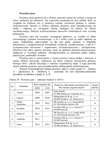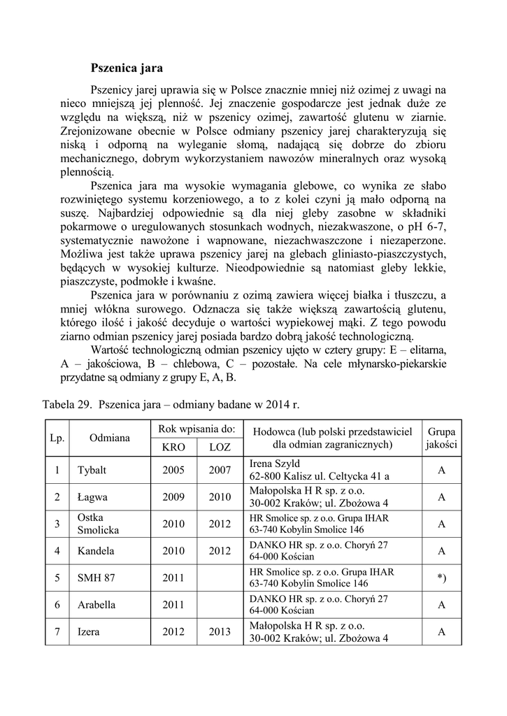 Pszenica jara Pszenicy jarej uprawia się w Polsce znacznie mniej niż ozimej z uwagi na nieco mniejszą jej plenność. Jej znaczenie gospodarcze jest jednak duże ze względu na większą, niż w pszenicy ozimej, zawartość glutenu w ziarnie. Zrejonizowane obecnie w Polsce odmiany pszenicy jarej charakteryzują się niską i odporną na wyleganie słomą, nadającą się dobrze do zbioru mechanicznego, dobrym wykorzystaniem nawozów mineralnych oraz wysoką plennością. Pszenica jara ma wysokie wymagania glebowe, co wynika ze słabo rozwiniętego systemu korzeniowego, a to z kolei czyni ją mało odporną na suszę. Najbardziej odpowiednie są dla niej gleby zasobne w składniki pokarmowe o uregulowanych stosunkach wodnych, niezakwaszone, o pH 6-7, systematycznie nawożone i wapnowane, niezachwaszczone i niezaperzone. Możliwa jest także uprawa pszenicy jarej na glebach gliniasto-piaszczystych, będących w wysokiej kulturze. Nieodpowiednie są natomiast gleby lekkie, piaszczyste, podmokłe i kwaśne. Pszenica jara w porównaniu z ozimą zawiera więcej białka i tłuszczu, a mniej włókna surowego. Odznacza się także większą zawartością glutenu, którego ilość i jakość decyduje o wartości wypiekowej mąki. Z tego powodu ziarno odmian pszenicy jarej posiada bardzo dobrą jakość technologiczną. Wartość technologiczną odmian pszenicy ujęto w cztery grupy: E – elitarna, A – jakościowa, B – chlebowa, C – pozostałe. Na cele młynarsko-piekarskie przydatne są odmiany z grupy E, A, B. Tabela 29. Pszenica jara – odmiany badane w 2014 r. Lp. Odmiana Rok wpisania do: KRO LOZ 1 Tybalt 2005 2007 2 Łagwa 2009 2010 3 Ostka Smolicka 2010 2012 4 Kandela 2010 2012 5 SMH 87 2011 6 Arabella 2011 7 Izera 2012 2013 Hodowca (lub polski przedstawiciel dla odmian zagranicznych) Irena Szyld 62-800 Kalisz ul. Celtycka 41 a Małopolska H R sp. z o.o. 30-002 Kraków; ul. Zbożowa 4 HR Smolice sp. z o.o. Grupa IHAR 63-740 Kobylin Smolice 146 DANKO HR sp. z o.o. Choryń 27 64-000 Kościan HR Smolice sp. z o.o. Grupa IHAR 63-740 Kobylin Smolice 146 DANKO HR sp. z o.o. Choryń 27 64-000 Kościan Małopolska H R sp. z o.o. 30-002 Kraków; ul. Zbożowa 4 Grupa jakości A A A A *) A A 8 KWS Torridon 2012 9 Struna 2013 10 Mandaryna 2014 11 Harenda 2014 *) – Odmiana pszenicy twardej. 2014 KWS Lochow Pl. sp. z o.o. Kondratowice 57-150 Prusy, ul. Słowiańska 5 DANKO HR sp. z o.o. Choryń 27 64-000 Kościan DANKO HR sp. z o.o. Choryń 27 64-000 Kościan Małopolska H R sp. z o.o. 30-002 Kraków; ul. Zbożowa 4 A A A B Tabela 30. Agrotechniczne i polowe warunki prowadzenia doświadczeń w 2014 r. Wyszczególnienie Kompleks glebowy Klasa bonitacyjna gleby pH gleby Zasobność gleby mg/100 g P205 K2 0 Mg Przedplon Data siewu Data zbioru Nawożenie N na poziomie a1 kg/ha N na poziomie a2 kg/ha P205 kg/ha K20 kg/ha Nawożenie dolistne l/ha Krzyżewo Szepietowo Rumejki 2 III b 6,7 4 III a 6,0 4 IV a 5,9 27,0 17,9 7,1 Groch siewny 28.03 29.08 30,5 15,5 7,7 Groch siewny 02.04 04.08 8,7 11,7 8,7 Ziemniaki 01.04 07.08 55 95 60 90 87 127 60 60 73 113 60 90 Forthial – 2 x 1 l. Basfoliar – 2 x 3 l. Plonowit Z II – 1,5 l. Basfoliar 36 – 1,5 l. Sumi Alpha 330 EC – 0,25 l. Herbicydy dawka Sekator 125 OD – 0,15 l. Lintur 70 WG – 150 g Axial EC+Adigor EC – 0,4 +1 l. Eforia 0,65 ZC – 0,3 l. Puma Uniwersal 069 EW – 1 l. Gold + Sekator 125 OD – 1 l. + 0,15 l. Fungicydy dawka Input 460 EC – 1,0 l. Artea 330 EC – 0,5 l. Credo 600 SC – 2 l. Reveller 280 SC – 0,8 l. Input 460 EC – 1 l. Soligor 425 EC – 0,8 l. Cerone 480 SL – 0,75 l. Moddus 250 EC – 0,4 l. Cerone 480 SL – 0,75 l. Insektycydy Antywylegacz poziom a2 Tabela 31. Plon ziarna (dt z ha), ważniejsze cechy i porażenie przez choroby odmian pszenicy jarej w 2014 r., na poziomie a 1. Dojrzałość woskowa **) 58,4 68,7 x x 14,1 98 9,0 44,4 x 7,7 7,8 7,2 Rdza brunatna Masa tysiąca nasion 79,0 Septorioza liści Wyleganie przed zbiorem dni Mączniak Wysokość roślin g % wzorca Skala 90 Odchylenie od wzorca (dt) cm Średnia A2 – A1 (dt) Wzorzec Szepietowo Odmiana Krzyżewo Lp. Choroby Skala 90 1 Tybalt 79,4 53,8 66,6 - 2,1 97 13,0 91 9,0 44,1 206 8,8 7,7 7,3 2 KWS Torridon 73,7 55,9 64,8 - 3,9 94 15,0 90 9,0 42,5 206 7,0 7,0 6,8 3 Harenda 84,0 65,5 74,8 6,0 109 14,3 102 9,0 44,3 206 7,3 7,2 7,5 4 Łagwa 77,4 60,3 68,8 0,1 100 10,6 102 9,0 43,6 206 8,0 6,3 7,0 5 Ostka Smolicka 71,1 56,0 63,6 - 5,2 93 15,9 105 9,0 41,9 206 7,8 6,2 7,5 6 Kandela 75,0 54,9 65,0 - 3,8 95 16,5 97 9,0 43,6 205 8,3 8,0 7,3 7 Arabella 71,3 61,0 -7,8 89 16,0 100 9,0 41,6 204 8,0 5,5 6,5 8 Izera 71,7 53,4 62,6 - 6,2 91 16,8 105 9,0 41,4 204 7,8 6,5 7,8 9 Struna 78,9 56,3 67,6 - 1,1 98 21,2 105 8,2 43,3 205 7,8 6,7 7,5 10 Mandaryna 77,3 53,9 65,6 - 3,1 95 25,4 106 9,0 39,1 205 8,8 6,8 7,5 11 SMH 87 *) 50,9 48,0 49,4 - 19,3 72 11,5 88 6,8 44,9 7,8 6,2 7,0 – Odmiany wzorcowe zaznaczono pogrubioną czcionką. *) – Odmiana pszenicy twardej. **) – Na podstawie Listy Opisowej Odmian COBORU. Rdza brunatna Masa tysiąca nasion Septorioza liści Wyleganie przed zbiorem g Mączniak Wysokość roślin Skala 90 Średnia cm Szepietowo % wzorca Choroby Krzyżewo Odchylenie od wzorca (dt) Tabela 32. Plon ziarna (dt z ha), ważniejsze cechy i porażenie przez choroby odmian pszenicy jarej w 2014 r., na poziomie a 2. Wzorzec 98,4 67,3 82,8 x x 88 9,0 48,5 9,0 8,9 8,4 1 Tybalt 96,9 62,2 79,6 - 3,3 96 84 9,0 47,7 9,0 9,0 8,5 2 KWS Torridon 97,5 62,1 79,8 - 3,0 96 81 9,0 46,2 9,0 8,7 8,3 3 Harenda 100,6 77,5 89,1 6,3 108 92 9,0 46,2 9,0 8,7 8,5 4 Łagwa 89,3 69,5 79,4 - 3,4 96 94 9,0 46,5 9,0 8,3 8,3 5 Ostka Smolicka 87,8 71,2 79,5 - 3,3 96 95 9,0 47,4 8,8 8,3 8,8 6 Kandela 96,5 66,4 81,5 - 1,4 98 93 9,0 46,5 9,0 8,8 8,8 7 Arabella 92,5 77,0 -5,9 93 86 9,0 44,2 9,0 7,5 7,0 8 Izera 90,2 68,6 79,4 - 3,5 96 97 9,0 46,0 8,8 8,7 8,5 9 Struna 101,0 76,5 88,8 5,9 107 95 9,0 45,2 9,0 8,5 8,3 10 Mandaryna 99,9 82,2 91,0 8,2 110 87 9,0 42,2 8,5 8,7 8,8 11 SMH 87 *) 6