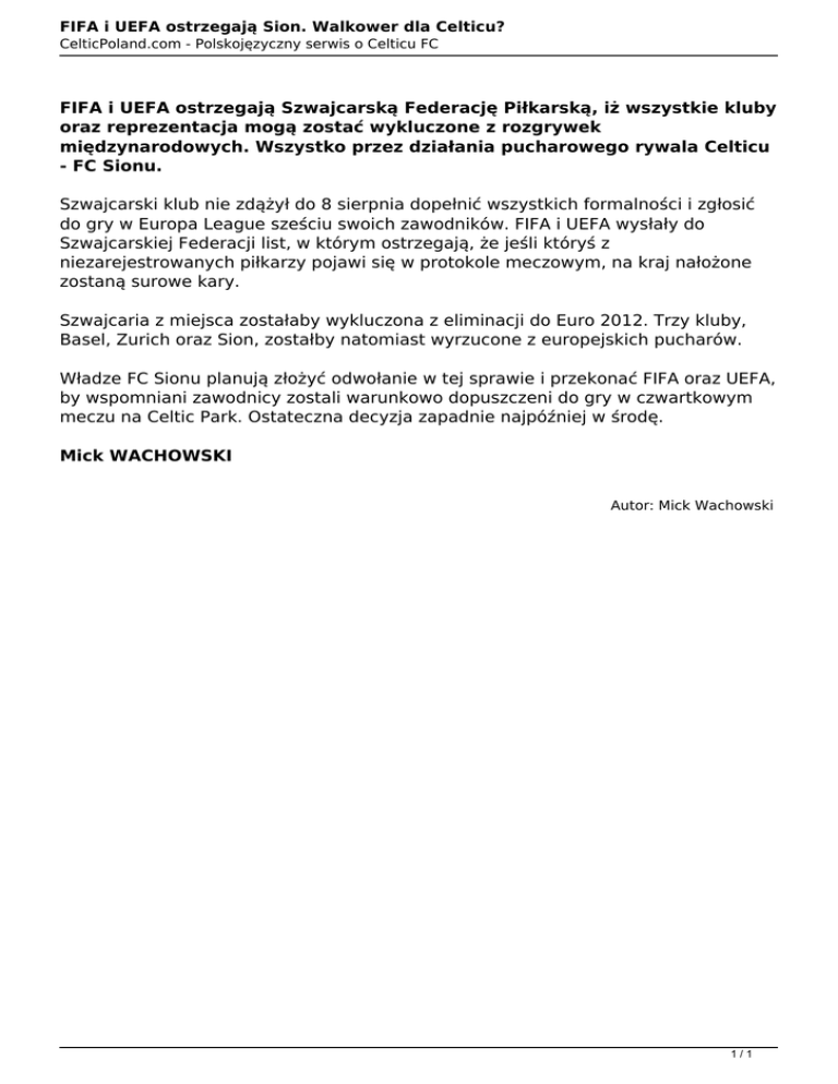 FIFA i UEFA ostrzegają Sion. Walkower dla Celticu? CelticPoland.com - Polskojęzyczny serwis o Celticu FC FIFA i UEFA ostrzegają Szwajcarską Federację Piłkarską, iż wszystkie kluby oraz reprezentacja mogą zostać wykluczone z rozgrywek międzynarodowych. Wszystko przez działania pucharowego rywala Celticu - FC Sionu. Szwajcarski klub nie zdążył do 8 sierpnia dopełnić wszystkich formalności i zgłosić do gry w Europa League sześciu swoich zawodników. FIFA i UEFA wysłały do Szwajcarskiej Federacji list, w którym ostrzegają, że jeśli któryś z niezarejestrowanych piłkarzy pojawi się w protokole meczowym, na kraj nałożone zostaną surowe kary. Szwajcaria z miejsca zostałaby wykluczona z eliminacji do Euro 2012. Trzy kluby, Basel, Zurich oraz Sion, zostałby natomiast wyrzucone z europejskich pucharów. Władze FC Sionu planują złożyć odwołanie w tej sprawie i przekonać FIFA oraz UEFA, by wspomniani zawodnicy zostali warunkowo dopuszczeni do gry w czwartkowym meczu na Celtic Park. Ostateczna decyzja zapadnie najpóźniej w środę. Mick WACHOWSKI Autor: Mick Wachowski 1/1 Powered by TCPDF (www.tcpdf.org)