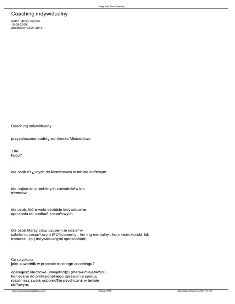 Integralny Tenis Sto³owy Coaching indywidualny Autor: Jerzy Grycan 10.08.2009. Zmieniony 02.01.2016. Coaching indywidualny przyspieszona podró¿ na drodze Mistrzostwa Dla kogo? · dla osób d±¿±cych do Mistrzostwa w tenisie sto³owym; · dla najbardziej ambitnych zawodników lub trenerów; · dla osób, które wol± osobiste indywidualne spotkania od spotkañ zespo³owych; · dla osób którzy chc± uzupe³niæ udzia³ w szkoleniu zespo³owym (FUNdamenty , trening mentalny , kurs instruktorski lub trenerski itp.) indywidualnymi spotkaniami; Co uzyskasz jako zawodnik w procesie rocznego coachingu? opanujesz kluczowe umiejêtno¶ci (meta-umiejêtno¶ci) konieczne do profesjonalnego uprawiania sportu; rozwiniesz swoj± odporno¶æ psychiczn± w tenisie sto³owym; http://integralnytenisstolowy.com Kreator PDF Utworzono 8 March, 2017, 07:48 Integralny Tenis Sto³owy przyjrzysz siê sobie, swoim motywacjom i swoim zasobom; okre¶lisz swoje silne i s³abe strony; dotrzesz do swoich marzeñ sportowych i ¿yciowych; postawisz sobie 'prawid³owo sformu³owane cele'; zbudujesz dla siebie swoj± koncepcjê gry; stworzysz plan dochodzenia do swoich celów (indywidualny plan rocznego szkolenia); przygotujesz dla siebie plan udzia³u w zawodach; opanujesz ró¿ne sposoby radzenia sobie z emocjami podczas treningów i zawodów tenisa sto³owego; przygotujesz dla siebie rytua³y umo¿liwiaj±ce najwy¿sz± jako¶æ Twoich treningów, zawodów i odnowy itd.; uzyskasz sta³e wsparcie w realizacji swoich planów i rozwi±zywaniu bie¿±cych problemów szkoleniowych; Co uzyskasz jako trener w procesie rocznego coachingu? nauczysz siê strategii pracy z zawodnikami, które zapewni± najwy¿sz± jako¶æ treningu, zawodów i odnowy; opanujesz kluczowe umiejêtno¶ci (meta-umiejêtno¶ci) konieczne do profesjonalnego szkolenia; nauczysz siê jak pracowaæ nad odporno¶ci± swoich zawodników; przyjrzysz siê sobie, swoim motywacjom i swoim zasobom; okre¶lisz swoje silne i s³abe strony; dotrzesz do swoich marzeñ sportowych i ¿yciowych; postawisz sobie 'prawid³owo sformu³owane cele'; nauczysz siê jak rozwijaæ koncepcjê gry swoich zawodników; stworzysz plan dochodzenia do swoich celów, plan rocznego treningu; nauczysz siê przygotowywaæ indywidualne roczne plany szkolenia dla swoich zawodników; nauczysz siê przygotowywaæ dla swoich zawodników indywidualne plany udzia³u w zawodach; opanujesz ró¿ne sposoby radzenia sobie z emocjami podczas treningów i zawodów tenisa sto³owego; nauczysz siê ró¿nych sposobów pracy z emocjami swoich zawodników na treningach i zawodach i w procesie odnowy; przygotujesz dla siebie rytua³y umo¿liwiaj±ce najwy¿sz± jako¶æ Twoich treningów, zawodu i odnowy itd.; uzyskasz sta³e wsparcie w realizacji swoich planów i rozwi±zywaniu bie¿±cych problemów szkoleniowych; zbudujesz swoj± koncepcjê szkolenia; zbudujesz swój zespó³ marzeñ; rozpoczniesz budowanie swojego systemu szkolenia; Kiedy i w jakiej formie? cykliczne osobiste spotkania - np. raz na tydzieñ, raz na dwa tygodnie, raz na miesi±c; http://integralnytenisstolowy.com Kreator PDF Utworzono 8 March, 2017, 07:48 Integralny Tenis Sto³owy terminy i godziny do ustalenia; Gdzie spotkania? do ustalenia indywidualnie; w przypadku zorganizowania coachingu indywidualnego dla kilku osób, mo¿liwy jest mój dojazd do dowolnego miejsca w kraju; jest mo¿liwe, aby czê¶æ spotkañ odbywa³a siê w formie telekonferencji; Referencje Wszyscy, którzy uczestnicz± lub uczestniczyli w ca³orocznym szkoleniu potwierdzaj± zdecydowany postêp w swoim rozwoju osobistym; Wiêkszo¶æ zawodników uczestnicz±cych w rocznym cyklu coachingu indywidualnego uzyskuje istotny awans w swoich rankingach (¶wiatowych i krajowych); Poczytaj co powiedzieli inni; Jakie koszty? do negocjacji; Jeste¶ zainteresowany? Zg³o¶ siê on-line ; Zadzwoñ +48 696 557 718+48 696 557 718; Napisz maila: [email protected] Jerzy Grycan P.s. Roczny coaching indywidualny mo¿e Ci przenie¶æ nie tylko sposób uprawiania tenisa sto³owego, ale ca³e Twoje ¿ycie na wy¿szy poziom& Call Send SMS Call from mobile http://integralnytenisstolowy.com Kreator PDF Utworzono 8 March, 2017, 07:48 Integralny Tenis Sto³owy Add to Skype You'll need Skype CreditFree via Skype http://integralnytenisstolowy.com Kreator PDF Utworzono 8 March, 2017, 07:48