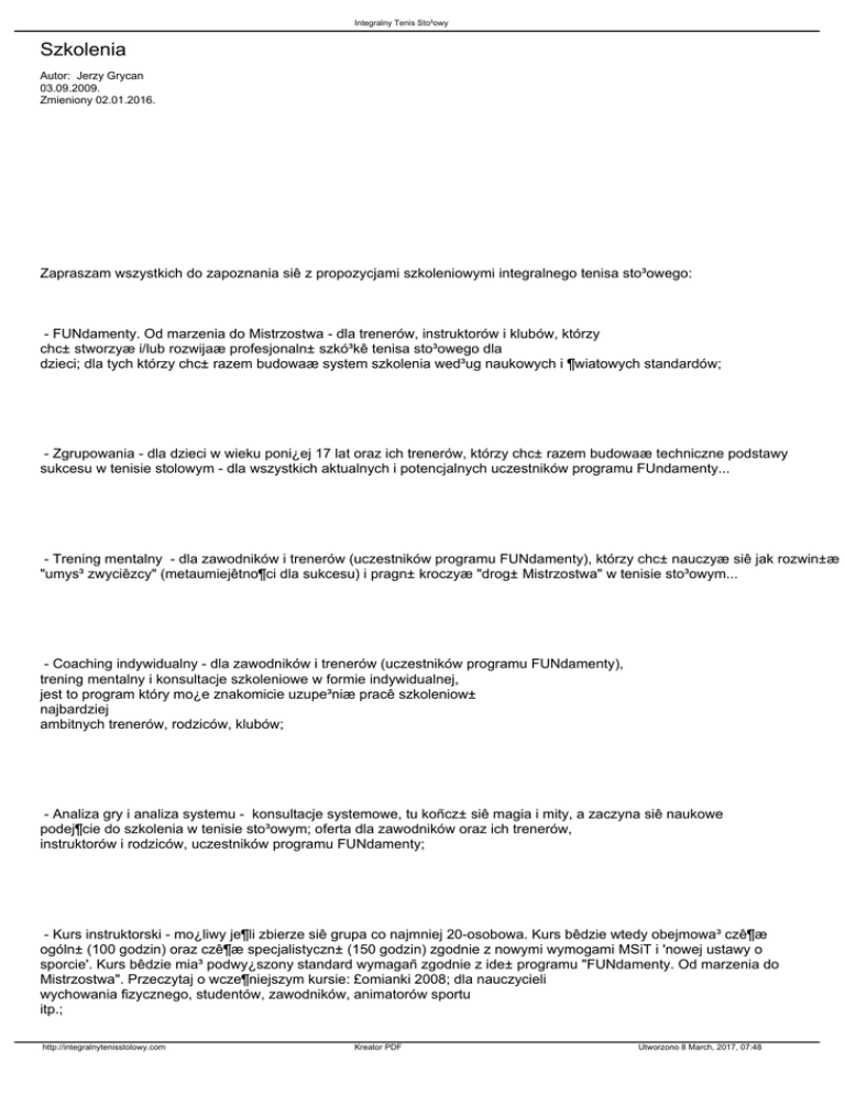 Integralny Tenis Sto³owy Szkolenia Autor: Jerzy Grycan 03.09.2009. Zmieniony 02.01.2016. Zapraszam wszystkich do zapoznania siê z propozycjami szkoleniowymi integralnego tenisa sto³owego: - FUNdamenty. Od marzenia do Mistrzostwa - dla trenerów, instruktorów i klubów, którzy chc± stworzyæ i/lub rozwijaæ profesjonaln± szkó³kê tenisa sto³owego dla dzieci; dla tych którzy chc± razem budowaæ system szkolenia wed³ug naukowych i ¶wiatowych standardów; - Zgrupowania - dla dzieci w wieku poni¿ej 17 lat oraz ich trenerów, którzy chc± razem budowaæ techniczne podstawy sukcesu w tenisie stolowym - dla wszystkich aktualnych i potencjalnych uczestników programu FUndamenty... - Trening mentalny - dla zawodników i trenerów (uczestników programu FUNdamenty), którzy chc± nauczyæ siê jak rozwin±æ "umys³ zwyciêzcy" (metaumiejêtno¶ci dla sukcesu) i pragn± kroczyæ "drog± Mistrzostwa" w tenisie sto³owym... - Coaching indywidualny - dla zawodników i trenerów (uczestników programu FUNdamenty), trening mentalny i konsultacje szkoleniowe w formie indywidualnej, jest to program który mo¿e znakomicie uzupe³niæ pracê szkoleniow± najbardziej ambitnych trenerów, rodziców, klubów; - Analiza gry i analiza systemu - konsultacje systemowe, tu koñcz± siê magia i mity, a zaczyna siê naukowe podej¶cie do szkolenia w tenisie sto³owym; oferta dla zawodników oraz ich trenerów, instruktorów i rodziców, uczestników programu FUNdamenty; - Kurs instruktorski - mo¿liwy je¶li zbierze siê grupa co najmniej 20-osobowa. Kurs bêdzie wtedy obejmowa³ czê¶æ ogóln± (100 godzin) oraz czê¶æ specjalistyczn± (150 godzin) zgodnie z nowymi wymogami MSiT i 'nowej ustawy o sporcie'. Kurs bêdzie mia³ podwy¿szony standard wymagañ zgodnie z ide± programu "FUNdamenty. Od marzenia do Mistrzostwa". Przeczytaj o wcze¶niejszym kursie: £omianki 2008; dla nauczycieli wychowania fizycznego, studentów, zawodników, animatorów sportu itp.; http://integralnytenisstolowy.com Kreator PDF Utworzono 8 March, 2017, 07:48 Integralny Tenis Sto³owy - Studia trenerskie - mo¿liwo¶æ podjêcia studiów pierwszego stopnia w systemie zaocznym (weekendowym) na Wydziale Sportu o specjalizacji tenisa sto³owego (prowadzonej przeze mnie) przy Wy¿szej Szkole Trenerów Sportu w Warszawie; Zapraszam wszystkich, którzy jeszcze nie zakupili pozycji "Integralny tenis sto³owy. Jak sport mo¿e zmieniæ twój ¶wiat na du¿o lepsze miejsce do ¿ycia" do nabycia jej w formie e-booka. Jednocze¶nie zapraszam wszystkich do wspó³pracy na zasadach partnerskich w realizacji idei integralnego rozwoju. Zaproponuj sam wspólne szkolenie, termin, miejsce, program, cenê, pomoc, wsparcie itp. Z pozdrowieniami Jerzy Grycan +48 696 557 718+48 696 557 718 http://www.integralnytenisstolowy.com [email protected] Call Send SMS http://integralnytenisstolowy.com Kreator PDF Utworzono 8 March, 2017, 07:48 Integralny Tenis Sto³owy Call from mobile Add to Skype You'll need Skype CreditFree via Skype http://integralnytenisstolowy.com Kreator PDF Utworzono 8 March, 2017, 07:48