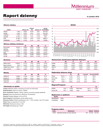 Raport dzienny 21 grudnia 2016 Gł€wne indeksy WIG20 Indeks Zmiana 1D Zmiana 1M obroty Zmiana 1Y PLN/USDm 90 2000 1950 WIG20 1 940 0.82% 10.5% 4.0% 651/153 80 WIG30 2 242 4 216 0.97% 9.9% 7.7% 821/193 70 0.62% 6.1% 19.5% 205/48 mWIG40 sWIG80 14 102 0.22% 1.6% 11.3% 20/4 WIG 51 485 0.70% 8.4% 11.3% 895/211 6 242 0.72% 9.1% 1.4% 210/49 WIGBANKI 1900 60 1850 50 1800 40 1750 Gł€wne indeksy światowe 30 1D 1M 3M 1Y 19 975 0.46% 5.37% 9.19% 15.78% 20 S&P500 2 271 0.36% 3.30% 4.98% 12.35% 10 1650 NASDAQ 5 484 0.49% 2.14% 3.56% 10.36% 11 465 0.33% 7.30% 9.85% 9.21% 0 1600 RTSI$ 1 143 1.10% 12.58% 16.64% 50.54% XU100 77 808 0.84% 3.00% -0.14% 6.11% 1D 1M 3M 1Y 0.11% 1.5% 14.8% 17.4% Polska Ropa (USD/bbl) Węgiel koks.(USD/t) Złoto (USD/OZ) 16/12/16 8/12/16 13/12/16 5/12/16 30/11/16 25/11/16 22/11/16 17/11/16 8/11/16 14/11/16 3/11/16 28/10/16 25/10/16 20/10/16 17/10/16 7/10/16 12/10/16 4/10/16 29/9/16 Rentowność skarbowych papier€w dłużnych Surowce Miedź (USD/t) 26/9/16 DAX 1700 21/9/16 Dow Jones 5 502.0 3M 1Y 2Y 5Y 10Y 1.63% 1.52% 2.01% 2.73% 3.41% 55.6 0.42% 11.2% 15.1% 24.4% Węgry 0.15% 0.25% 0.65% 1.83% 3.26% 256.1 -1.12% -17.1% 24.4% 230.0% Niemcy -0.94% -0.83% -0.80% -0.52% 0.25% 1 136.5 0.36% -6.3% -14.3% 5.2% USA 0.51% 0.90% 1.22% 2.04% 2.56% 1D 1M 3M 1Y Najbardziej aktywne akcje Waluty 1D 1M % obrot€w obroty (PLN/USD) 124.40 1.14% 6.6% 9.1% 59/14 PKN Orlen 84.77 -2.75% 12.5% 7.7% 49/11 -4.6% KGHM 92.29 2.81% 11.3% 7.6% 49/11 3.9% PGE 10.58 4.03% 12.1% 6.7% 43/10 USD/PLN 4.2360 -0.18% 1.5% 9.9% 8.7% Pekao EUR/PLN 4.4096 -0.06% -0.4% 2.6% 3.7% EUR/USD 1.0410 0.12% -1.8% -6.7% USD/HUF 298.83 -0.07% 2.5% 8.2% Wygrani/Przegrani Informacje ze sp€łek 1D 1D Trakcja Najtańsza oferta w konsorcjum za 527 mln PLN brutto PGNiG 5.62 6.04% PKN Orlen 84.77 -2.75% Elektrobudowa Aneks do umowy z KGHM Tauron PE 2.97 4.58% Lotos 39.70 -1.73% Echo Investment Wypłata I transzy zaliczki na poczet przyszłej dywidendy Murapol Kupno nieruchomości w Wieliczce 778 mieszkań Polnord Przydział obligacji za 30 mln PLN Wydarzenia w sp€łkach Sp€łka Wydarzenie Rank Progress Przedwstępna umowa zakupu gruntu WORKSERV NWZ Wirtualna Polska Polityka dywidendowa (min. 1 PLN na akcję i max 70% zysku) HYPERION NWZ Pelion Odpis na poziomie 9.7 mln PLN PKN Orlen Planowane zmiany w RN CD Projekt Aktualizacja gry "Gwint" Prognozy makro Godz. 16:00 Wydarzenie Sprzedaż dom‚w na rynku wt‚rnym Informacje dotyczące powiązań Millennium DM ze sp‚łką, będącą przedmiotem niniejszego raportu oraz pozostałe informacje, wymagane przez Rozporządzenie RM z dnia 19.X.2005 roku umieszczone zostały na ostatniej stronie raportu. Będzie Ostatnio US 5.5 mln 5.6 mln Informacje ze sp€łek Trakcja Najtańsza oferta w konsorcjum za 527 mln PLN brutto Konsorcjum Trakcji i hiszpańskiej Comsy złożyło najtańszą ofertę za 527 mln PLN brutto w przetargu PKP PLK na wykonanie rob‚t budowlanych w obszarze LCS Łowicz, odcinek Sochaczew - Żychlin i odcinek Placencja - Łowicz gł‚wny. W przetargu złożone zostało sześć ofert, z czego druga pod względem ceny należała do konsorcjum Strabagu, Budimeksu i ZUE (za 548.6 mln PLN brutto). Najdroższa oferta należała do konsorcjum włoskiego Impreza Pizzarotti i francuskiej TSO i opiewała na 750.3 mln PLN. Elektrobudowa Aneks do umowy z KGHM Sp‚łka podpisała aneks do umowy z KGHM Polska Miedź S.A. dotyczący modernizacji rozdzielni 6kV GSE w Hucie Miedzi Głog‚w wraz z powiązaniami z systemem elektroenergetycznym. Na mocy aneksu termin zakończenia przedmiotu umowy został określony na dzień 30 grudnia br., zaś dodatkowo rozszerzony został zakres umowy o roboty dodatkowe, wynagrodzenia wzrosło do 25.53 mln PLN 2.60 mln EUR netto. Echo Investment Wypłata I transzy zaliczki na poczet przyszłej dywidendy Zarząd zdecydował o wypłacie I transzy zaliczki na poczet przyszłej dywidendy za rok obrotowy 2016, płatnej w dniu 29 grudnia br., w wysokości 284.8 mln PLN, tj. 0.69 PLN na akcję. W listopadzie zarząd sp‚łki podjął decyzję o przeznaczeniu 350.8 mln PLN na wypłatę zaliczki dywidendowej za rok 2016 (0.85 PLN na akcję). Dzień prawa do zaliczki ustalono na 21 grudnia, a zaliczka miała zostać wypłacona do końca grudnia 2017 r. w kilku transzach. Murapol Kupno nieruchomości w Wieliczce 778 mieszkań Sp‚łka z grupy Murapol nabyła za 9 mln PLN netto działkę o powierzchni prawie 12.5 ha w podkrakowskiej Wieliczce. W ramach inwestycji planowana jest realizacja 16 budynk‚w z 778 mieszkaniami o łącznej powierzchni użytkowej ok. 35 tys. m kw. Podpisana umowa zakupu działki w Wieliczce jest związana ze spełnieniem warunku wynikającego z umowy przedwstępnej z 22 grudnia 2015 roku jakim było otrzymanie pozwolenia na budowę inwestycji na nabytym gruncie. Sp‚łka podała, że inwestycja związana jest z realizacją IV etapu projektu deweloperskiego Kr‚lewskie Tarasy, w ramach kt‚rego dotychczas zrealizowano trzy etapy obejmujące 8 blok‚w z 375 mieszkaniami. Polnord Przydział obligacji za 30 mln PLN Sp‚łka poinformowała o dokonaniu w dniu 20 grudnia br. przydziału trzyletnich obligacji zwykłych na okaziciela serii NS4 o łącznej wartości nominalnej 30 mln PLN. Rank Progress Przedwstępna umowa zakupu gruntu Sp‚łka Progress VII Sp. z o.o. (50% zależna) podpisała z bankiem BZ BWK przedwstępną umowę dotyczącą nabycia 65% udział‚w zabudowanej nieruchomości we Wrocławiu (przy ulicach Wejherowskiej oraz Białowieskiej) za 25 mln PLN netto (plus VAT). Rank Progress S.A. jest posiadaczem 35% udział‚w w opisanej Nieruchomości i wraz z partnerem Sp‚łką "Central Fund of Immovables" sp. z o.o., kt‚ra w sp‚łce Progress VII Sp. z o.o. nabyła 50% udział‚w, planuje na wrocławskiej nieruchomości uruchomienie projektu deweloperskiego związanego z zabudową mieszkaniową, biurowo-hotelową i usługową pod nazwą "Marina Park". Strony zobowiązały się zawrzeć umowę przyrzeczoną 