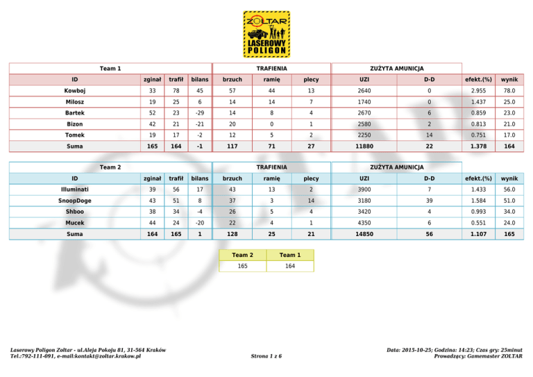 Team 1 TRAFIENIA ZUŻYTA AMUNICJA ID zginał trafił bilans