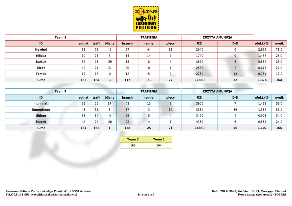 Team 1 TRAFIENIA ZUŻYTA AMUNICJA ID zginał trafił bilans brzuch ramię plecy UZI D-D efekt.(%) wynik Kowboj 33 78 45 57 44 13 2640 0 2.955 78.0 Milosz 19 25 6 14 14 7 1740 0 1.437 25.0 Bartek 52 23 -29 14 8 4 2670 6 0.859 23.0 Bizon 42 21 -21 20 0 1 2580 2 0.813 21.0 Tomek 19 17 -2 12 5 2 2250 14 0.751 17.0 Suma 165 164 -1 117 71 27 11880 22 1.378 164 Team 2 TRAFIENIA ZUŻYTA AMUNICJA ID zginał trafił bilans brzuch ramię plecy UZI D-D efekt.(%) wynik Illuminati 39 56 17 43 13 2 3900 7 1.433 56.0 SnoopDoge 43 51 8 37 3 14 3180 39 1.584 51.0 Shboo 38 34 -4 26 5 4 3420 4 0.993 34.0 Mucek 44 24 -20 22 4 1 4350 6 0.551 24.0 Suma 164 165 1 128 25 21 14850 56 1.107 165 Laserowy Poligon Zoltar - ul.Aleja Pokoju 81, 31-564 Kraków Tel.:792-111-091, e-mail:[email protected] Team 2 Team 1 165 164 Strona 1 z 6 Data: 2015-10-25; Godzina: 14:23; Czas gry: 25minut Prowadzący: Gamemaster ZOLTAR Team 1 TRAFIENIA ZUŻYTA AMUNICJA ID zginał trafił bilans brzuch ramię plecy UZI D-D efekt.(%) wynik Kowboj 27 68 41 56 36 9 3300 6 2.057 68.0 Bartek 27 39 12 29 10 5 3300 62 1.160 39.0 Milosz 24 34 10 25 24 8 2250 1 1.510 34.0 Tomek 22 26 4 19 7 1 3060 0 0.850 26.0 Bizon 46 21 -25 17 3 2 3330 23 0.626 21.0 Suma 146 188 42 146 80 25 15240 92 1.226 188 Team 2 TRAFIENIA ZUŻYTA AMUNICJA ID zginał trafił bilans brzuch ramię plecy UZI D-D efekt.(%) wynik SnoopDoge 47 58 11 42 16 15 1440 126 3.704 58.0 Illuminati 40 44 4 33 12 6 2760 40 1.571 44.0 Mucek 52 28 -24 24 1 3 3720 29 0.747 28.0 Shboo 49 16 -33 15 2 0 3420 16 0.466 16.0 Suma 188 146 -42 114 31 24 11340 211 1.264 146 Laserowy Poligon Zoltar - ul.Aleja Pokoju 81, 31-564 Kraków Tel.:792-111-091, e-mail:[email protected] Team 1 Team 2 188 146 Strona 2 z 6 Data: 2015-10-25; Godzina: 15:03; Czas gry: 25minut Prowadzący: Gamemaster ZOLTAR Drużyny Miejsce Laserowy Poligon Zoltar - ul.Aleja Pokoju 81, 31-564 Kraków Tel.:792-111-091, e-mail:[email protected] Nazwa Rozgrywki 1 2 Suma Team 1 164 188 352 Team 2 165 146 311 Strona 3 z 6 Data: 2015-10-25 Prowadzący: Gamemaster ZOLTAR Zestawienie wg wyniku Miejsce TRAFIENIA ZUŻYTA AMUNICJA ID zginał trafił bilans brzuch ramię plecy UZI D-D efekt.(%) wynik Kowboj 72.00 175.20 103.20 135.60 96.00 26.40 7128.00 7.20 2.455 175.20 SnoopDoge 108.00 130.80 22.80 94.80 22.80 34.80 5544.00 198.00 2.278 130.80 Illuminati 94.80 120.00 25.20 91.20 30.00 9.60 7992.00 56.40 1.491 120.00 4 Bartek 94.80 74.40 -20.40 51.60 21.60 10.80 7164.00 81.60 1.027 74.40 5 Milosz 51.60 70.80 19.20 46.80 45.60 18.00 4788.00 1.20 1.478 70.80 6 Mucek 115.20 62.40 -52.80 55.20 6.00 4.80 9684.00 42.00 0.642 62.40 7 Shboo 104.40 60.00 -44.40 49.20 8.40 4.80 8208.00 24.00 0.729 60.00 8 Tomek 49.20 51.60 2.40 37.20 14.40 3.60 6372.00 16.80 0.808 51.60 9 Bizon 105.60 50.40 -55.20 44.40 3.60 3.60 7092.00 30.00 0.708 50.40 Laserowy Poligon Zoltar - ul.Aleja Pokoju 81, 31-564 Kraków Tel.:792-111-091, e-mail:[email protected] Strona 4 z 6 Data: 2015-10-25 Prowadzący: Gamemaster ZOLTAR Zestawienie wg bilansu Miejsce TRAFIENIA ZUŻYTA AMUNICJA ID zginał trafił bilans brzuch ramię plecy UZI D-D efekt.(%) wynik Kowboj 72.00 175.20 103.20 135.60 96.00 26.40 7128.00 7.20 2.455 175.20 Illuminati 94.80 120.00 25.20 91.20 30.00 9.60 7992.00 56.40 1.491 120.00 SnoopDoge 108.00 130.80 22.80 94.80 22.80 34.80 5544.00 198.00 2.278 130.80 4 Milosz 51.60 70.80 19.20 46.80 45.60 18.00 4788.00 1.20 1.478 70.80 5 Tomek 49.20 51.60 2.40 37.20 14.40 3.60 6372.00 16.80 0.808 51.60 6 Bartek 94.80 74.40 -20.40 51.60 21.60 10.80 7164.00 81.60 1.027 74.40 7 Shboo 104.40 60.00 -44.40 49.20 8.40 4.80 8208.00 24.00 0.729 60.00 8 Mucek 115.20 62.40 -52.80 55.20 6.00 4.80 9684.00 42.00 0.642 62.40 9 Bizon 105.60 50.40 -55.20 44.40 3.60 3.60 7092.00 30.00 0.708 50.40 Laserowy Poligon Zoltar - ul.Aleja Pokoju 81, 31-564 Kraków Tel.:792-111-091, e-mail:[email protected] Strona 5 z 6 Data: 2015-10-25 Prowadzący: Gamemaster ZOLTAR Zestawienie wg efektywności Miejsce TRAFIENIA ZUŻYTA AMUNICJA ID zginał trafił bilans brzuch ramię plecy UZI D-D efekt.(%) wynik Kowboj 72.00 175.20 103.20 135.60 96.00 26.40 7128.00 7.20 2.455 175.20 SnoopDoge 108.00 130.80 22.80 94.80 22.80 34.80 5544.00 198.00 2.278 130.80 Illuminati 94.80 120.00 25.20 91.20 30.00 9.60 7992.00 56.40 1.491 120.00 4 Milosz 51.60 70.80 19.20 46.80 45.60 18.00 4788.00 1.20 1.478 70.80 5 Bartek 94.80 74.40 -20.40 51.60 21.60 10.80 7164.00 81.60 1.027 74.40 6 Tomek 49.20 51.60 2.40 37.20 14.40 3.60 6372.00 16.80 0.808 51.60 7 Shboo 104.40 60.00 -44.40 49.20 8.40 4.80 8208.00 24.00 0.729 60.00 8 Bizon 105.60 50.40 -55.20 44.40 3.60 3.60 7092.00 30.00 0.708 50.40 9 Mucek 115.20 62.40 -52.80 55.20 6.00 4.80 9684.00 42.00 0.642 62.40 Laserowy Poligon Zoltar - ul.Aleja Pokoju 81, 31-564 Kraków Tel.:792-111-091, e-mail:[email protected] Strona 6 z 6 Data: 2015-10-25 Prowadzący: Gamemaster ZOLTAR