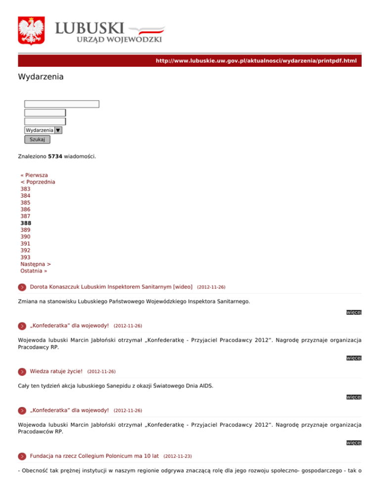 http://www.lubuskie.uw.gov.pl/aktualnosci/wydarzenia/printpdf.html Wydarzenia Wydarzenia ▼ Szukaj Znaleziono 5734 wiadomości. « Pierwsza < Poprzednia 383 384 385 386 387 388 389 390 391 392 393 Następna > Ostatnia » Dorota Konaszczuk Lubuskim Inspektorem Sanitarnym [wideo] (2012-11-26) Zmiana na stanowisku Lubuskiego Państwowego Wojewódzkiego Inspektora Sanitarnego. więcej „Konfederatka” dla wojewody! (2012-11-26) Wojewoda lubuski Marcin Jabłoński otrzymał „Konfederatkę - Przyjaciel Pracodawcy 2012”. Nagrodę przyznaje organizacja Pracodawcy RP. więcej Wiedza ratuje życie! (2012-11-26) Cały ten tydzień akcja lubuskiego Sanepidu z okazji Światowego Dnia AIDS. więcej „Konfederatka” dla wojewody! (2012-11-26) Wojewoda lubuski Marcin Jabłoński otrzymał „Konfederatkę - Przyjaciel Pracodawcy 2012”. Nagrodę przyznaje organizacja Pracodawców RP. więcej Fundacja na rzecz Collegium Polonicum ma 10 lat (2012-11-23) - Obecność tak prężnej instytucji w naszym regionie odgrywa znaczącą rolę dla jego rozwoju społeczno- gospodarczego - tak o działalności Fundacji mówi wojewoda lubuski Marcin Jabłoński. więcej „Konfederatka" również dla pracodawcy z Gorzowa! (2012-11-22) Nagrody Pracodawców RP rozdane. Wśród laureatów znalazł się wojewoda Marcin Jabłoński i Zbigniew Rudowicz, prezes ZM Mestil z Gorzowa Wielkopolskiego. więcej Konkurs "Społecznik Roku" rozstrzygnięty [wideo] (2012-11-22) Kapituła konkursu w tym roku zwycięzców wybierała spośród 16 osób i instytucji, działających na rzecz najbardziej potrzebujących. więcej XX-lecie Fundacji „Serce na dłoni” (2012-11-22) 22 listopada w gorzowskim teatrze odbyła się uroczystość z okazji jubileuszu działalności Fundacji „Serce na dłoni”. Udział w uroczystości wziął wicewojewoda Jan Świrepo. więcej O przyszłości mediów publicznych w Warszawie (2012-11-22) Wojewoda Marcin Jabłoński wziął udział w konferencji „Media publiczne w społeczeństwie demokratycznym. Europa i Polska”. Konferencję zorganizowała Organizacja Pracodawców RP i Związek Pracodawców Mediów Publicznych. więcej Lubuscy żołnierze w Weimarskiej Grupie Bojowej Unii Europejskiej (2012-11-21) W Wędrzynie trwają międzynarodowe manewry „Common Challenge 12”. Ćwiczeniom żołnierzy przyglądali się Minister Obrony Narodowej, Dowódca Wojsk Lądowych, Szef Sztabu Generalnego Wojska Polskiego, przedstawiciele ambasad Francji i Niemiec oraz 20 attache wojskowych krajów Unii Europejskiej. więcej « Pierwsza < Poprzednia 383 384 385 386 387 388 389 390 391 392 393 Następna > Ostatnia »