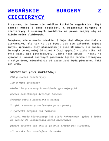 WEGAŃSKIE CIECIERZYCY BURGERY Z Przyznam, że dawno nie robiłam kotletów wegańskich. Zbyt dawno! Muszę i chcę częściej. A wegańskie burgery z ciecierzycy i suszonych pomidorów na pewno znajdą się na liście moich ulubionych. Popękane, ale w środku miękkie ;) Moje zbyt długo siedziały w piekarniku, ale tak to już bywa, jak się człowiek zajmie innymi sprawami. Niby planowałam je piec 50 minut, ale myślę, że mogły co najmniej 10 minut krócej spędzić w piekarniku. Aż tyle czasu nie potrzebowały. Jedno jest pewne – jeśli je wykonacie, aromat suszonych pomidorów będzie bardzo intensywny w całym domu, niezależnie od czasu jaki będą pieczone. Taki ich urok. Składniki (8-9 kotletów): 250 g suchej ciecierzycy 100 g mąki gryczanej około 150 g suszonych pomidorów (pokrojonych) pęczek posiekanego świeżego koperku średnia cebula pokrojona w kostkę 2 ząbki czosnku przeciśnięte przez praskę 1 łyżeczka oregano lub tymianku 2 łyżki masła klarowanego lub oleju kokosowego na koniec do „obtaczania przed pieczeniem) (plus 1 łyżka pieprz cayenne lub chilli (u mnie prawie pół łyżeczki) sól morska lub himalajska do smaku Przygotowanie Ciecierzycę płuczemy i moczymy przez noc. Następnego dnia zalewamy namoczone nasiona świeżą filtrowaną lub źródlaną wodą i gotujemy do miękkości. Cebulkę szklimy delikatnie na rozgrzanym maśle lub oleju, ale nie rumienimy. Po kilku minutach dodajemy przeciśnięty przez praskę czosnek. Mieszamy drewnianą łyżką, smażąc delikatnie jeszcze przez chwilę. Następnie dodajemy ugotowaną ciecierzycę i mieszamy całość. Możemy przy tym rozgnieść nieco nasiona. Do malaksera lub blendera wrzucamy wszystkie składniki i miksujemy na dość zwartą masę. Na koniec wyrabiamy jeszcze ciasto ręką, aby mieć pewność, że składniki się dobrze wymieszały. Rozgrzewamy piekarnik do 180 st.C, a blachę wykładamy papierem do pieczenia. Na patelni (tej samej, na której szklona była cebula) roztapiamy trochę oleju kokosowego lub masła klarowanego. Formujemy w dłoniach kotlety, które następnie obtaczamy w roztopionym tłuszczu. Gotowe wegańskie burgery kładziemy na papierze. Pieczemy przez około 40 minut (bądź mniej/więcej). Odwracamy je w trakcie pieczenia, aby zapiekły się z obu stron. Takie wegańskie burgery nadają się również jako podstawa do kanapek :) Obowiązkowo z dużą ilością warzyw. Ja jednego kotleta owinęłam sałatą, w środku natomiast znalazło się awokado, cebula, pomidor, ogórek kwaszony bezglutenowy. Ekstra zestawienie smakowe. i ketchup I jeszcze ciekawostki na temat ciecierzycy („Odżywianie dla zdrowia” Paul Pitchford): „(…) wpływa korzystnie na trzustkę, żołądek i serce (sama kształtem nieco przypomina serce); zawiera więcej żelaza niż inne warzywa strączkowe; jest również cennym źródłem tuszczów nienasyconych. Istnieje wiele rodzajów ciecierzycy w rozmaitych wielkościach i kolorach (czerwona, biała, czarna, brązowa).” Smacznego! :)