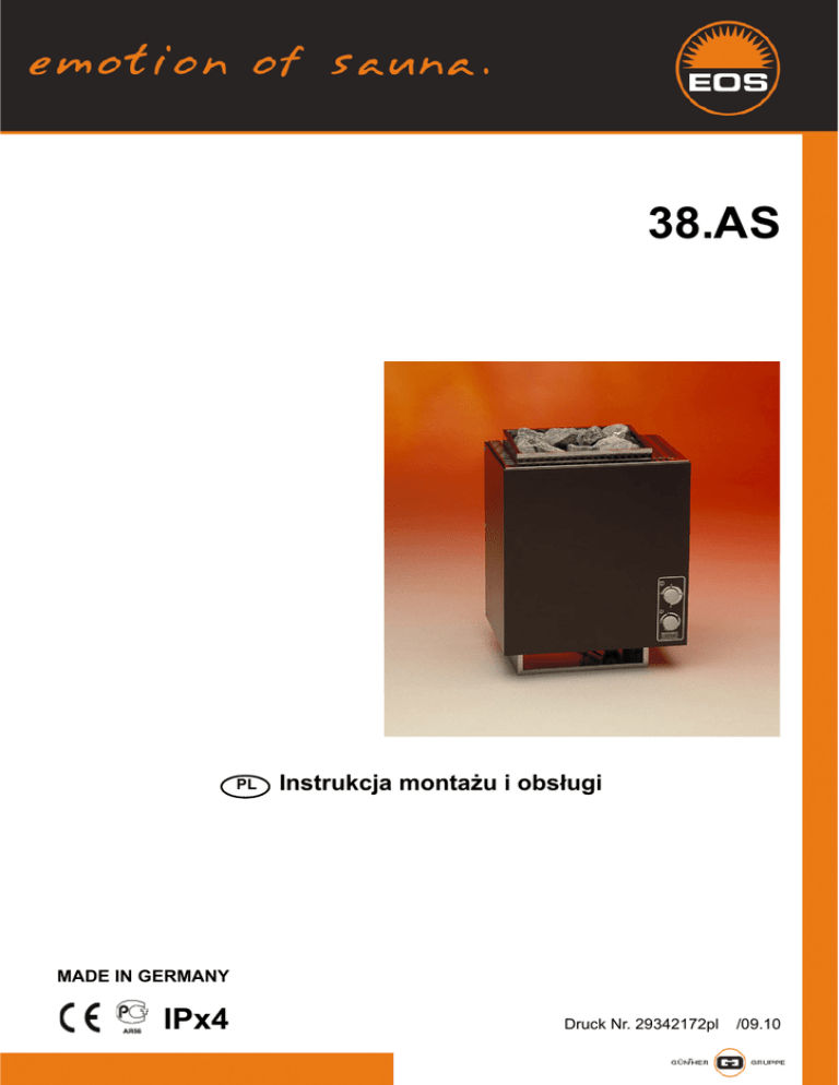 38.AS PL Instrukcja montażu i obsługi MADE IN GERMANY IPx4 Druck Nr. 29342172pl D /09.10 1 Polski Spis tresci Użytkowanie zgodnie z przeznaczeniem ................................................................3 Wskazówki ogólne ..................................................................................................3 Ważne wskazówki...................................................................................................4 Podłączenie elektryczne .........................................................................................5 Przykład podłączenia sauny ...................................................................................6 Montaż 38 AS – piec naścienny ..............................................................................7 Dane techniczne .....................................................................................................7 Odstępy minimalne ...........................................................................................7 Montaż czujnika ................................................................................................8 Podłączenie elektryczne przez elektryka: ...............................................................9 Wyłącznik bezpieczeństwa .....................................................................................9 Uruchomienie ........................................................................................................10 Kamienie do sauny ...............................................................................................11 Konserwacja i utrzymanie .....................................................................................11 Adres serwisowy: ..................................................................................................13 Gwarancja .............................................................................................................13 Procedura realizacji przesyłek zwrotnych (RMA) – wskazówki dotyczące wszystkich przesyłek zwrotnych.....................................................................14 2 PL Szanowni Klienci! razem z grzejnikiem do sauny.) Nabyte przez Was urządzenie techniczne o wysokiej jakości zapewni Wam zadowolenie z kąpieli w saunie przez wiele lat. Urządzenie grzejne zostało wykonane i sprawdzone zgodnie z obowiązującymi europejskimi normami bezpieczeństwa i wyprodukowane w zakładzie produkcyjnym przy spełnieniu normy jakościowej DIN EN ISO 9001:2000. Montaż wyłącznika dźwigienkowego i jego przyłączenie do sieci elektrycznej należy przeprowadzić zgodnie z instrukcją montażu dołączoną do tego elementu. Do Państwa informacji przygotowano obszerną instrukcję montażu i obsługi. Prosimy o zwrócenie szczególnej uwagi na ważne wskazówki i informacje dotyczące podłączenia elektrycznego. Życzymy Państwu pobudzającego wypoczynku i pełnej przeżyć kąpieli w saunie. Prosimy o sprawdzenie na początku, czy urządzenie grzejne do sauny dotarło do Państwa bez uszkodzeń. Uszkodzenia w transporcie należy zgłosić niezwłocznie u spedytora lub w firmie dokonującej dostawy. Użytkowanie zgodnie z przeznaczeniem Grzejnik do sauny jest przeznaczony wyłącznie do ogrzewania kabiny sauny, w połączeniu z odpowiednim sterownikiem. Jakikolwiek inny sposób używania jest niezgodny z przeznaczeniem! Użytkowanie zgodnie z przeznaczeniem obejmuje przestrzeganie warunków eksploatacji, konserwacji i naprawy. Producent nie ponosi odpowiedzialności za szkody wynikające z użytkowania niezgodnego z przeznaczeniem i zmian wykonanych na własną rękę; wyłączne ryzyko w tym zakresie ponosi osoba odpowiedzialna. Grzejniki saunowe, z wyjątkiem przeznaczonych do użytku domowego, muszą być wyposażone w element zabezpieczający przez przykryciem wg normy DIN EN 60335-2-53. Zależnie od typu grzejnika saunowego odpowiednim rozwiązaniem może być wyłącznik dźwigienkowy typu I lub typu II zamontowany nad grzejnikiem. (Wyłącznik dźwigienkowy nie jest dostarczany Wskazówki ogólne Prosimy o zwrócenie uwagi, że optymalny klimat sauny uzyskuje się przez właściwe wzajemne ustawienie dopływu i odpływu powietrza w kabinie, urządzenia grzejnego oraz przyrządu sterującego. Prosimy o uwzględnienie danych i informacji podanych przez dostawcę sauny. Urządzenie grzejne ogrzewa kabinę sauny przez podgrzane powietrze konwekcyjne. Świeże powietrze jest przy tym zasysane z otworu dolotowego i po podgrzaniu unosi się do góry (konwekcja) a następnie krąży w kabinie. Część zużytego powietrza wypierana jest na zewnątrz przez otwór odpływowy w kabinie. W ten sposób tworzy się typowy dla sauny klimat, w którym temperatura osiągająca ok. 110°C bezpośrednio pod sufitem sauny obniża się poprzez spadek temperatury w kabinie do 30-40°C w pobliżu podłogi. Stąd nie jest rzeczą nadzwyczajną, jeżeli np. czujnik temperatury nad piecem wskazuje 110°C, a termometr zamontowany na ścianie ok. 20-25 cm poniżej sufitu sauny pokazuje tylko 85°C. Temperatura kąpieli przy maks. nastawieniu temperatury waha się z reguły w rejonie górnej ławki do leżenia między 80°C a 90°C. Prosimy o zwrócenie uwagi na fakt, że temperatura w kabinie osiąga najwyższą wartość zawsze nad urządzeniem grzejnym i tam też wg danych instrukcji montażowej dla przyrządów sterujących należy umieścić czujnik temperatury i ogranicznik bezpieczeństwa. Przy pierwszym nagrzaniu może wytworzyć się lekki zapach pochodzący z ulatniania się substancji z materiałów użytych do procesów produkcyjnych. Prosimy o przewietrzenie kabiny po wykonaniu tej czynności a przed kąpielą w saunie, PL 3 Ważne wskazówki Przy nieumiejętnym montażu istnieje niebezpieczeństwo pożaru! Prosimy o dokładne zapoznanie się z instrukcją montażu. Szczególnie należy uwzględnić informacje dotyczące wymiarów i niżej podane wskazówki. • Urządzenie ni