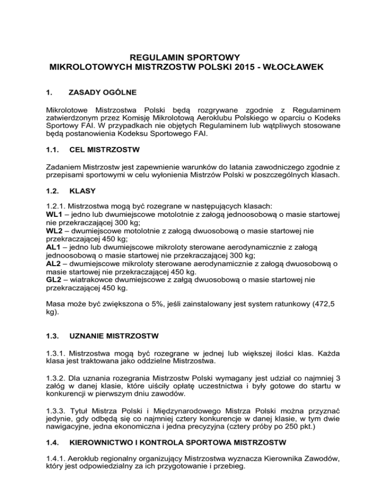 REGULAMIN SPORTOWY MIKROLOTOWYCH MISTRZOSTW POLSKI 2015 - WŁOCŁAWEK 1. ZASADY OGÓLNE Mikrolotowe Mistrzostwa Polski będą rozgrywane zgodnie z Regulaminem zatwierdzonym przez Komisję Mikrolotową Aeroklubu Polskiego w oparciu o Kodeks Sportowy FAI. W przypadkach nie objętych Regulaminem lub wątpliwych stosowane będą postanowienia Kodeksu Sportowego FAI. 1.1. CEL MISTRZOSTW Zadaniem Mistrzostw jest zapewnienie warunków do latania zawodniczego zgodnie z przepisami sportowymi w celu wyłonienia Mistrzów Polski w poszczególnych klasach. 1.2. KLASY 1.2.1. Mistrzostwa mogą być rozegrane w następujących klasach: WL1 – jedno lub dwumiejscowe motolotnie z załogą jednoosobową o masie startowej nie przekraczającej 300 kg; WL2 – dwumiejscowe motolotnie z załogą dwuosobową o masie startowej nie przekraczającej 450 kg; AL1 – jedno lub dwumiejscowe mikroloty sterowane aerodynamicznie z załogą jednoosobową o masie startowej nie przekraczającej 300 kg; AL2 – dwumiejscowe mikroloty sterowane aerodynamicznie z załogą dwuosobową o masie startowej nie przekraczającej 450 kg. GL2 – wiatrakowce dwumiejscowe z załgą dwuosobową o masie startowej nie przekraczającej 450 kg. Masa może być zwiększona o 5%, jeśli zainstalowany jest system ratunkowy (472,5 kg). 1.3. UZNANIE MISTRZOSTW 1.3.1. Mistrzostwa mogą być rozegrane w jednej lub większej ilości klas. Każda klasa jest traktowana jako oddzielne Mistrzostwa. 1.3.2. Dla uznania rozegrania Mistrzostw Polski wymagany jest udział co najmniej 3 załóg w danej klasie, które uiściły opłatę uczestnictwa i były gotowe do startu w konkurencji w pierwszym dniu zawodów. 1.3.3. Tytuł Mistrza Polski i Międzynarodowego Mistrza Polski można przyznać jedynie, gdy odbędą się co najmniej cztery konkurencje w danej klasie, w tym dwie nawigacyjne, jedna ekonomiczna i jedna precyzyjna (cztery próby po 250 pkt.) 1.4. KIEROWNICTWO I KONTROLA SPORTOWA MISTRZOSTW 1.4.1. Aeroklub regionalny organizujący Mistrzostwa wyznacza Kierownika Zawodów, który jest odpowiedzialny za ich przygotowanie i przebieg. 1.4.2. Do kompetencji Kierownika Sportowego należy: a) ustalanie kolejności i sposobu rozgrywania konkurencji, b) wyznaczanie tras zawodów, punktów kontroli, określanie szczegółowych zadań zgodnie z założeniami niniejszego regulaminu, c) wydawanie zarządzeń nieobjętych niniejszym regulaminem. 1.4.3. Aeroklub regionalny organizujący Mistrzostwa wyznacza Sędziego Głównego oraz Sędziów Zawodów. 1.4.4. Kontrolę i nadzór nad stroną sportową pełni Komisja Sportowa w składzie: Kierownik Sportowy, Sędzia Główny oraz Sędziowie Zawodów. 1.4.5. Każdy członek Komisji Sportowej ma prawo do kontroli załogi przed startem lub po locie celem sprawdzenia przestrzegania Regulaminu Mistrzostw. Kontrola musi być dokonywana w sposób nie wpływający na przygotowanie się zawodników do lotu. 1.5. OPŁATA WPISOWA Opłata wpisowa pokrywa co najmniej koszty: a) oznakowania zawodników i ich mikrolotów; b) organizacji, przeprowadzenia i oceniania konkurencji Mistrzostw; c) zestawu materiałów dla każdego zawodnika takich jak zdjęcia do identyfikacji, mapy do konkurencji; d) użytkowania lotniska i przestrzeni powietrznej; e) miejsca kempingowego, korzystania z urządzeń sanitarnych. 1.6. PISMO ORGANIZACYJNO – WYKONAWCZE 1.6.1. Pismo organizacyjno – wykonawcze zawiera co najmniej następujące informacje: a) dokładny termin i miejsce rozgrywania Mistrzostw; b) kalendarium Mistrzostw; c) imienny wykaz Komisji Sportowej i Kierownika zawodów; d) wysokość opłaty wpisowej. 1.6.2. Pismo jest rozsyłane do aeroklubów regionalnych nie później niż 30 dni przed datą rozpoczęcia Mistrzostw. 1.7. KWALIFIKACJE I ZDOLNOŚĆ ZAWODNIKÓW DO LOTU 1.7.1. Piloci uczestniczący w Mistrzostwach powinni posiadać wystarczający poziom umiejętności, żeby sprostać wymaganiom zawodów rangi Mistrzostw Polski, posiadać ważne ubezpieczenie w zakresie OC użytkownika statku powietrznego, NNW załogi, legitymować się ważnym świadectwem kwalifikacji lub ważną licencją pilota, aktualnym orzeczeniem lotniczo-lekarskim Ponadto powinni posiadać licencję sportową wydaną przez Aeroklub Polski (w przypadku obcokrajowców licencję sportową wydaną przez właściwy aeroklub krajowy). 1.7.2. Nawigatorzy muszą mieć ukończone 14 lat. 1.7.3. Zawodnicy nie mogą startować do konkurencji będąc pod wpływem środków dopingujących lub gdy ich kondycja fizyczna lub psychiczna uniemożliwia bezpieczne wykonanie lotu. 1.8. MIKROLOTY I ICH WYPOSAŻENIE 1.8.1. Mikroloty i pozostałe wyposażenie używane przez zawodników musi mieć osiągi i sprawność techniczną odpowiednią do wzięcia udziału w zawodach. Wymagany jest rzeczywisty zasięg lotu nie mniejszy niż 200 km. 1.8.2. Każdy mikrolot musi mieć ważne pozwolenie na wykonywanie lotów. 1.8.3. Podczas Mistrzostw mikrolot powinien wykonywać loty jako pojedyncza jednostka konstrukcyjna używająca tego samego zestawu elementów, który był zastosowany w pierwszym dniu zawodów, jednakże możliwa jest zmiana śmigieł pod warunkiem, że nie zostanie przekroczona masa startowa mikrolotu. 1.8.4. Numery startowe przydzielone zawodnikom przez organizatora powinny być umieszczone po obu stronach kadłuba. 1.8.5. Załogi są zobowiązane do posiadania mapników, kanistrów na paliwo, urządzeń GPS oraz rejestratorów lotu. 1.9. URZĄDZENIA ELEKTRONICZNE I POMOC Z ZEWNĄTRZ 1.9.1. Korzystanie z VOR, GPS i podobnych elektronicznych nawigacyjnych podczas rozgrywania konkurencji jest zakazane. urządzeń 1.9.2. Kierownictwo Mikrolotowych Mistrzostw Polski będzie używało do kontroli indywidualnych rezultatów z lotów nawigacyjnych urządzenia rejestrujące lot (rejestratory GPS) będące na wyposażeniu każdego mikrolotu. 1.9.3. GPS oraz rejestratory lotu zabierane będą jedynie w zaplombowanych przez organizatora opakowaniach uniemożliwiających korzystan