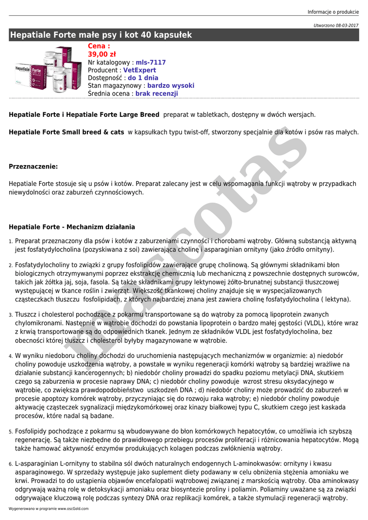 Informacje o produkcie Utworzono 08-03-2017 Hepatiale Forte małe psy i kot 40 kapsułek Cena : 39,00 zł Nr katalogowy : mls-7117 Producent : VetExpert Dostępność : do 1 dnia Stan magazynowy : bardzo wysoki Średnia ocena : brak recenzji Hepatiale Forte i Hepatiale Forte Large Breed preparat w tabletkach, dostępny w dwóch wersjach. s Hepatiale Forte Small breed & cats w kapsułkach typu twist-off, stworzony specjalnie dla kotów i psów ras małych. co ta Przeznaczenie: Hepatiale Forte stosuje się u psów i kotów. Preparat zalecany jest w celu wspomagania funkcji wątroby w przypadkach niewydolności oraz zaburzeń czynnościowych. Hepatiale Forte - Mechanizm działania Preparat przeznaczony dla psów i kotów z zaburzeniami czynności i chorobami wątroby. Główną substancją aktywną jest fosfatydylocholina (pozyskiwana z soi) zawierająca cholinę i asparaginian ornityny (jako źródło ornityny). 2. Fosfatydylocholiny to związki z grupy fosfolipidów zawierające grupę cholinową. Są głównymi składnikami błon biologicznych otrzymywanymi poprzez ekstrakcję chemicznią lub mechaniczną z powszechnie dostępnych surowców, takich jak żółtka jaj, soja, fasola. Są także składnikami grupy lektynowej żółto-brunatnej substancji tłuszczowej występującej w tkance roślin i zwierząt. Większość tkankowej choliny znajduje się w wyspecjalizowanych cząsteczkach tłuszczu fosfolipidach, z których najbardziej znana jest zawiera cholinę fosfatydylocholina ( lektyna). 3. Tłuszcz i cholesterol pochodzące z pokarmu transportowane są do wątroby za pomocą lipoprotein zwanych chylomikronami. Następnie w wątrobie dochodzi do powstania lipoprotein o bardzo małej gęstości (VLDL), które wraz z krwią transportowane są do odpowiednich tkanek. Jednym ze składników VLDL jest fosfatydylocholina, bez obecności której tłuszcz i cholesterol byłyby magazynowane w wątrobie. 4. W wyniku niedoboru choliny dochodzi do uruchomienia następujących mechanizmów w organizmie: a) niedobór choliny powoduje uszkodzenia wątroby, a powstałe w wyniku regeneracji komórki wątroby są bardziej wrażliwe na działanie substancji kancerogennych; b) niedobór choliny prowadzi do spadku poziomu metylacji DNA, skutkiem czego są zaburzenia w procesie naprawy DNA; c) niedobór choliny powoduje wzrost stresu oksydacyjnego w wątrobie, co zwiększa prawdopodobieństwo uszkodzeń DNA ; d) niedobór choliny może prowadzić do zaburzeń w procesie apoptozy komórek wątroby, przyczyniając się do rozwoju raka wątroby; e) niedobór choliny powoduje aktywację cząsteczek sygnalizacji międzykomórkowej oraz kinazy białkowej typu C, skutkiem czego jest kaskada procesów, które nadal są badane. 5. Fosfolipidy pochodzące z pokarmu są wbudowywane do błon komórkowych hepatocytów, co umożliwia ich szybszą regenerację. Są także niezbędne do prawidłowego przebiegu procesów proliferacji i różnicowania hepatocytów. Mogą także hamować aktywność enzymów produkujących kolagen podczas zwłóknienia wątroby. 6. L-asparaginian L-ornityny to stabilna sól dwóch naturalnych endogennych L-aminokwasów: ornityny i kwasu asparaginowego. W sprzedaży występuje jako suplement diety podawany w celu obniżenia stężenia amoniaku we krwi. Prowadzi to do ustąpienia objawów encefalopatii wątrobowej związanej z marskością wątroby. Oba aminokwasy odgrywają ważną rolę w detoksykacji amoniaku oraz biosyntezie proliny i poliamin. Poliaminy uważane są za związki odgrywające kluczową rolę podczas syntezy DNA oraz replikacji komórek, a także stymulacji regeneracji wątroby. m as 1. Wygenerowano w programie www.oscGold.com Suplementacja ornityną zwiększa wytrzymałość blizny i odkładanie się kolagenu w modelach zwierzęcych. W badaniach in vitro, in vivo oraz w organach perfundowanych wykazano, że synteza moczniku z amoniaku jest ograniczona przez endogenną ornitynę, która może farmakologicznie pobudzać powstawanie mocznika w stopniu większym niż amoniak. Podawanie LOLA w wysokich dawkach redukuje wysokie stężenie amoniaku we krwi wywołane zarówno chlorkiem amonu, spożyciem białek, a także występujące jako powikłanie kliniczne w marskości wątroby. W stanach zdrowia oraz przy odpowiedniej diecie, L-ornitya i L-asparaginian są syntezowane de novo w dostatecznych ilościach. W stanach chorobowych, uszkodzeniu tkanek, niewydolności narządów, nadmiernym metabolizmie, w okresie wzrastania, ciąży lub braku enzymów cyklu mocznikowego, dieta powinna być suplementowana L-asparaginianem i L-ornityną. Przegląd dostępnych badań wykazuje, że istnieją dowody, wynikające z fizjologii, uzasadniające stosowanie diety suplementowanej L-asparaginianem i L-ornityną, w zależności od fizjologicznego, metabolicznego, czy patologicznego stanu pacjenta. W stanach niedoboru ornityny, codzienna suplementacja LOLA powinna być wystarczająca do uzyskania odpowiedniego stężenia ornityny w tkankach, co zapobiega hiperamonemii poposiłkowej, a także do stymulacji regeneracji tkanek (Sikorska i wsp., 2010). Skład: co ta s 7. Nasiona oleiste, owoce oleiste i ich produkty pochodne. Fosfolipidy (phospholipidum ex soja) zawierające fosfatydylocholinę. Ornityna w postaci L-asparginianu L-ornityny Dawkowanie: HepatialeForte 1 tabletka na 15 kg masy ciała m as ● HepatialeForte Large Breed ● 1 tabletka na 25 kg masy ciała Tabletki podawać w całości lub rozkruszone, przed albo w trakcie posiłku. Jeżeli dawka dobowa przewiduje podanie kilku tabletek, można aplikować je 2 lub 3 razy w ciągu doby. HepatialeForte small breed & cats (kapsułki twist-off) ● ● Koty: 1 kapsułka dziennie Psy: 1 kapsułka na 5 kg masy ciała dziennie. Zawartość kapsułki twist-off można podać w całości do jamy ustnej lub wymieszać z karmą.