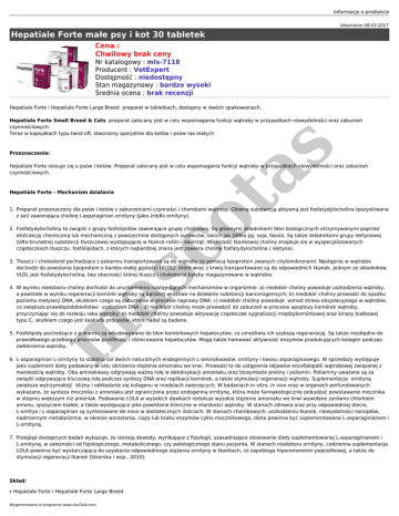 Informacje o produkcie Utworzono 08-03-2017 Hepatiale Forte małe psy i kot 30 tabletek Cena : Chwilowy brak ceny Nr katalogowy : mls-7118 Producent : VetExpert Dostępność : niedostępny Stan magazynowy : bardzo wysoki Średnia ocena : brak recenzji Hepatiale Forte i Hepatiale Forte Large Breed preparat w tabletkach, dostępny w dwóch opakowaniach. s Hepatiale Forte Small Breed & Cats preparat zalecany jest w celu wspomagania funkcji wątroby w przypadkach niewydolności oraz zaburzeń czynnościowych. Teraz w kapsułkach typu twist-off, stworzony specjalnie dla kotów i psów ras małych Przeznaczenie: Hepatiale Forte - Mechanizm działania co ta Hepatiale Forte stosuje się u psów i kotów. Preparat zalecany jest w celu wspomagania funkcji wątroby w przypadkach niewydolności oraz zaburzeń czynnościowych. 1. Preparat przeznaczony dla psów i kotów z zaburzeniami czynności i chorobami wątroby. Główną substancją aktywną jest fosfatydylocholina (pozyskiwana z soi) zawierająca cholinę i asparaginian ornityny (jako źródło ornityny). 2. Fosfatydylocholiny to związki z grupy fosfolipidów zawierające grupę cholinową. Są głównymi składnikami błon biologicznych otrzymywanymi poprzez ekstrakcję chemicznią lub mechaniczną z powszechnie dostępnych surowców, takich jak żółtka jaj, soja, fasola. Są także składnikami grupy lektynowej żółto-brunatnej substancji tłuszczowej występującej w tkance roślin i zwierząt. Większość tkankowej choliny znajduje się w wyspecjalizowanych cząsteczkach tłuszczu fosfolipidach, z których najbardziej znana jest zawiera cholinę fosfatydylocholina ( lektyna). m as 3. Tłuszcz i cholesterol pochodzące z pokarmu transportowane są do wątroby za pomocą lipoprotein zwanych chylomikronami. Następnie w wątrobie dochodzi do powstania lipoprotein o bardzo małej gęstości (VLDL), które wraz z krwią transportowane są do odpowiednich tkanek. Jednym ze składników VLDL jest fosfatydylocholina, bez obecności której tłuszcz i cholesterol byłyby magazynowane w wątrobie. 4. W wyniku niedoboru choliny dochodzi do uruchomienia następujących mechanizmów w organizmie: a) niedobór choliny powoduje uszkodzenia wątroby, a powstałe w wyniku regeneracji komórki wątroby są bardziej wrażliwe na działanie substancji kancerogennych; b) niedobór choliny prowadzi do spadku poziomu metylacji DNA, skutkiem czego są zaburzenia w procesie naprawy DNA; c) niedobór choliny powoduje wzrost stresu oksydacyjnego w wątrobie, co zwiększa prawdopodobieństwo uszkodzeń DNA ; d) niedobór choliny może prowadzić do zaburzeń w procesie apoptozy komórek wątroby, przyczyniając się do rozwoju raka wątroby; e) niedobór choliny powoduje aktywację cząsteczek sygnalizacji międzykomórkowej oraz kinazy białkowej typu C, skutkiem czego jest kaskada procesów, które nadal są badane. 5. Fosfolipidy pochodzące z pokarmu są wbudowywane do błon komórkowych hepatocytów, co umożliwia ich szybszą regenerację. Są także niezbędne do prawidłowego przebiegu procesów proliferacji i różnicowania hepatocytów. Mogą także hamować aktywność enzymów produkujących kolagen podczas zwłóknienia wątroby. 6. L-asparaginian L-ornityny to stabilna sól dwóch naturalnych endogennych L-aminokwasów: ornityny i kwasu asparaginowego. W sprzedaży występuje jako suplement diety podawany w celu obniżenia stężenia amoniaku we krwi. Prowadzi to do ustąpienia objawów encefalopatii wątrobowej związanej z marskością wątroby. Oba aminokwasy odgrywają ważną rolę w detoksykacji amoniaku oraz biosyntezie proliny i poliamin. Poliaminy uważane są za związki odgrywające kluczową rolę podczas syntezy DNA oraz replikacji komórek, a także stymulacji regeneracji wątroby. Suplementacja ornityną zwiększa wytrzymałość blizny i odkładanie się kolagenu w modelach zwierzęcych. W badaniach in vitro, in vivo oraz w organach perfundowanych wykazano, że synteza moczniku z amoniaku jest ograniczona przez endogenną ornitynę, która może farmakologicznie pobudzać powstawanie mocznika w stopniu większym niż amoniak. Podawanie LOLA w wysokich dawkach redukuje wysokie stężenie amoniaku we krwi wywołane zarówno chlorkiem amonu, spożyciem białek, a także występujące jako powikłanie kliniczne w marskości wątroby. W stanach zdrowia oraz przy odpowiedniej diecie, L-ornitya i L-asparaginian są syntezowane de novo w dostatecznych ilościach. W stanach chorobowych, uszkodzeniu tkanek, niewydolności narządów, nadmiernym metabolizmie, w okresie wzrastania, ciąży lub braku enzymów cyklu mocznikowego, dieta powinna być suplementowana L-asparaginianem i L-ornityną. 7. Przegląd dostępnych badań wykazuje, że istnieją dowody, wynikające z fizjologii, uzasadniające stosowanie diety suplementowanej L-asparaginianem i L-ornityną, w zależności od fizjologicznego, metabolicznego, czy patologicznego stanu pacjenta. W stanach niedoboru ornityny, codzienna suplementacja LOLA powinna być wystarczająca do uzyskania odpowiedniego stężenia ornityny w tkankach, co zapobiega hiperamonemii poposiłkowej, a także do stymulacji regeneracji tkanek (Sikorska i wsp., 2010). Skład: ● Hepatiale Forte i Hepatiale Forte Large Breed Wygenerowano w programie www.oscGold.com Fosfolipidy (phospholipidum ex soja) zawierające fosfatydylocholinę ornityna w postaci L-asparginianu L-ornityny ● HepatialeForte Small Breed & Cats Nasiona oleiste, owoce oleiste i ich produkty pochodne. Fosfolipidy (phospholipidum ex soja) zawierające fosfatydylocholinę ornityna w postaci L-asparginianu L-ornityny Dawkowanie: ● ● HepatialeForte - 1 tabletka na 15 kg masy ciała HepatialeForte Large Breed - 1 tabletka na 25 kg masy ciała Tabletki podawać w całości lub rozkruszone, przed albo w trakcie posiłku. Jeżeli dawka dobowa przewiduje podanie kilku tabletek, można aplikować je 2 lub 3 razy w ciągu doby. ● HepatialeForte Small Br