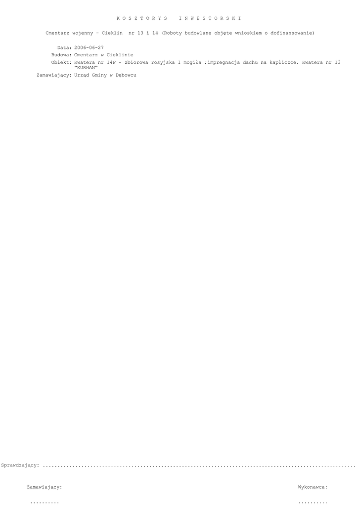 K O S Z T O R Y S Cmentarz wojenny - Cieklin I N W E S T O R S K I nr 13 i 14 (Roboty budowlane objęte wnioskiem o dofinansowanie) Data: 2006-06-27 Budowa: Cmentarz w Cieklinie Obiekt: Kwatera nr 14F - zbiorowa rosyjska 1 mogiła ;impregnacja dachu na kapliczce. Kwatera nr 13 "KURHAN" Zamawiający: Urząd Gminy w Dębowcu Sprawdzający: ........................................................................................................... Zamawiający: Wykonawca: .......... .......... Zbiór: Kurhan wojenny Cieklin Zuzia (C) DataComp 1994-2004 Cmentarz wojenny - Cieklin nr 13 i 14 (Roboty budowlane objęte wnioskiem o dofinansowanie) 27/06/06 Kosztorys Opis pozycji podstawy nakładów wyliczenie ilości robót Jedn. Norma Ilość Cena Wartość Robocizna Materiały Sprzęt 1 Roboty budowlane (zbiorowa mogiła - 1szt.) 1.001 KNR 201/109/4 Ręczne ścinanie i karczowanie, krzaki i podszycia gęste ( powierzchnia - 100 m2) R= 0,955 M= 1,000 S= 1,000 0,01 Razem robocizna: r-g 624 ha 5,9592 Razem: Razem (z narzutami): Wartość pozycji: 1.002 KNR 201/111/2 Oczyszczenie terenu z pozostałości po wykarczowaniu, drobne gałęzie, korzenie, kora i wrzos z wywiezieniem R= 0,955 M= 1,000 S= 1,000 100 m2 Razem robocizna: r-g 0,032 3,056 Ciągnik kołowy 37 kW (50 KM) (1) m-g 0,0107 1,07 Przyczepa skrzyniowa 3.5·t m-g 0,0107 1,07 Razem: Razem (z narzutami): Wartość pozycji: 1.003 KNR 401/212/2 Roboty rozbiórkowe, elementy betonowe niezbrojone, grubości ponad 15·cm (demontaŜ istniejącego fragmenu grobu) 5 m3 Razem robocizna: r-g 16,18 80,9 Razem: Razem (z narzutami): Wartość pozycji: 1.004 KNR 401/102/3 Wykopy wąskoprzestrzenne nieumocnione o szerokości dna do 1,5·m w gruncie suchym lub wilgotnym, głębokość do 1,5·m, grunt kategorii IV ( wykopy pod cokoły betonowe) 4,1 m3 Razem robocizna: r-g 2,71 11,111 Razem: Razem (z narzutami): Wartość pozycji: 1.005 KNR 202/1801/2 Cokoły z fundamentami betonowe 0.20x0.30·m ( betonowanie cokołu) 52 m Razem robocizna: r-g 2,3222 120,7544 Beton zwykły z kruszywa naturalnego B-10 (mieszanka betonowa) m3 0,2266 11,7832 Deski iglaste obrzynane klasa III, grubości 19-25·mm m3 0,0064 0,3328 Gwoździe budowlane okrągłe gołe kg 0,08 4,16 Listwy i łaty iglaste klasa II m3 0,00113 0,05876 Zaprawa cementowa M15 (m.100) m3 0,0092 0,4784 Środek transportowy (1) m-g 0,0232 1,2064 Materiały inne (Materiały) % 1,5 Razem: Razem (z narzutami): Wartość pozycji: 1.006 KNR 202/290/4 (1) Zbrojenie konstrukcji monolitycznych budowli, pręty stalowe okrągłe Ŝebrowane, Fi 12·mm 0,1 t Razem robocizna: r-g 47,75 4,775 Pręty Ŝebrowane skośnie do zbrojenia betonu Fi·do 7·mm t 1,002 0,1002 Prościarka automatyczna do prętów Fi·4-10·mm m-g 4,8 0,48 NoŜyce elektro-mechaniczne do prętów Fi·40·mm m-g 6,4 0,64 Giętarka mechaniczna do prętów zbrojeniowych Fi·40·mm m-g 5,4 0,54 Wyciąg m-g 1 0,1 Środek transportowy (1) m-g 1,8 0,18 Materiały inne (Materiały) % 1,5 Razem: Razem (z narzutami): Wartość pozycji: strona nr 2 Zbiór: Kurhan wojenny Cieklin Zuzia (C) DataComp 1994-2004 Cmentarz wojenny - Cieklin nr 13 i 14 (Roboty budowlane objęte wnioskiem o dofinansowanie) 27/06/06 Opis pozycji Jedn. Norma Ilość Cena Wartość podstawy nakładów Robocizna Materiały Sprzęt wyliczenie ilości robót 1.007 KNR 202/290/3 (1) Zbrojenie konstrukcji monolitycznych budowli, pręty stalowe okrągłe gładkie, Fi do 7·mm 0,050 t Razem robocizna: r-g 39,82 1,991 Pręt stalowy okrągły gładki zbrojeniowy do Fi·7·mm St0S t 1,002 0,0501 Materiały inne (Materiały) % 1,5 Prościarka automatyczna do prętów Fi·4-10·mm m-g 4,03 0,2015 NoŜyce elektro-mechaniczne do prętów Fi·40·mm m-g 5,31 0,2655 Giętarka mechaniczna do prętów zbrojeniowych Fi·40·mm m-g 4,51 0,2255 Wyciąg m-g 0,81 0,0405 Środek transportowy (1) m-g 1,44 0,072 Razem: Razem (z narzutami): Wartość pozycji: 1.008 KNR 401/214/3 Przygotowanie masy betonowej, beton Ŝwirowy B-15 4,1 m3 Razem robocizna: r-g 2,26 9,266 Cement portlandzki zwykły "35" bez dodatków kg 279 1 143,9 Piasek do betonów zwykłych m3 0,445 1,8245 Woda m3 0,26 1,066 świr do betonów zwykłych wielofrakcyjny m3 0,766 3,1406 Betoniarka wolnospadowa elektryczna m-g 1,39 5,699 Materiały inne (Materiały) % 2 Razem: Razem (z narzutami): Wartość pozycji: 1.009 KNBK 1/718/1 PrzewoŜenie taczkami betonu przez narzucenie łopatą i rozładowanie przez przechylenie na odległość do 30m w poziomie 4,1 m3 Razem robocizna: r-g 2,02 8,282 Razem: Razem (z narzutami): Wartość pozycji: 1.010 KNR 202/2111/13 (1) Cokoliki o wysokości do 20·cm (ułoŜenie kamieni ma fundamentach i pryzm wewnątrz grobów) 13 m Razem robocizna: r-g 1,31 17,03 Elementy kamienne m 1,03 13,39 Zaprawa cementowa M12 (m.80) m3 0,007 0,091 Materiały inne (Materiały) % 1,5 Wyciąg szybowy z napędem elektrycznym 1.5·t m-g 0,09 1,17 Razem: Razem (z narzutami): Wartość pozycji: 1.011 KNR 201/307/4 Roboty ziemne z przewozem gruntu taczkami, odspojenie i przewóz na odległość do 10·m, kategoria gruntu V-VI ( transport hałdowanej ziemi na mogiłę zbiorową) R= 0,955 M= 1,000 S= 1,000 4,5 m3 Razem robocizna: r-g 5,03 21,61643 Razem: Razem (z narzutami): Wartość pozycji: 1.012 KNR 201/314/3 Ręczne formowanie nasypów z ziemi leŜącej na odkładzie, kategoria gruntu V-VI ( formowanie pryzmy na grobie) R= 0,955 M= 1,000 S= 1,000 4,5 m3 Razem robocizna: r-g 0,32 1,3752 Razem: Razem (z narzutami): Wartość pozycji: 1.013 KNR 401/1207/2 (1) Malowanie farbami olejnymi pasów (cokołów) o wysokości do 20·cm, 2-krotne -ANALOGIA ( konserwacja elementów kamiennych) 26 m Razem robocizna: r-g 0,168 4,368 Środek gruntujący dm3 0,19231 5 Materiały inne (Materiały) % 2 Razem: Razem (z narzutami): Wartość pozycji: strona nr 3 Zbiór: Kurhan wojenny Cieklin Zuzia (C) DataComp 1994-2004 Cmentarz wojenny - Cieklin nr 13 i 14 (Roboty budowlane objęte wnioskiem o dofinansowanie) 27/06/06 Opis pozycji Jedn. Norma Ilość Cena Wart