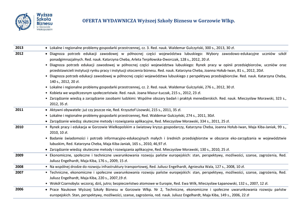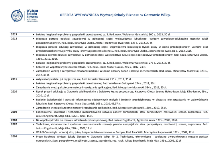 OFERTA WYDAWNICZA Wyższej Szkoły Biznesu w Gorzowie Wlkp. 2013 2012 Lokalne i regionalne problemy gospodarki przestrzennej, cz. 3. Red. nauk. Waldemar Gulczyński, 300 s., 2013, 30 zł. Diagnoza potrzeb edukacji zawodowej w północnej części województwa lubuskiego: Wybory zawodowo-edukacyjne uczniów szkół ponadgimnazjalnych. Red. nauk. Katarzyna Cheba, Arleta Terpiłowska-Dworczak, 128 s., 2012, 20 zł. • Diagnoza potrzeb edukacji zawodowej w północnej części województwa lubuskiego: Rynek pracy w opinii przedsiębiorców, uczniów oraz przedstawicieli instytucji rynku pracy i instytucji otoczenia biznesu. Red. nauk. Katarzyna Cheba, Joanna Hołub-Iwan, 81 s., 2012, 20zł. • Diagnoza potrzeb edukacji zawodowej w północnej części województwa lubuskiego z perspektywy przedsiębiorców. Red. nauk. Katarzyna Cheba, 140 s., 2012, 20 zł. • Lokalne i regionalne problemy gospodarki przestrzennej, cz. 2. Red. nauk. Waldemar Gulczyński, 276 s., 2012, 30 zł. • Kobieta we współczesnym społeczeństwie. Red. nauk. Joana Mazur-Łuczak, 215 s., 2012, 23 zł. • Zarządzanie wiedzą a zarządzanie zasobami ludzkimi: Wspólne obszary badań i praktyk menedżerskich. Red. nauk. Mieczysław Morawski, 323 s., 2012, 35 zł. 2011 • • 2010 • 2009 • 2008 2007 • • 2006 • Aktywni obywatele: już czy jeszcze nie, Red. Krzysztof Lisowski, 215 s., 2011, 35 zł. Lokalne i regionalne problemy gospodarki przestrzennej, Red. Waldemar Gulczyński, 274 s., 2011, 30zł. Zarządzanie wiedzą: skuteczne metody i rozwiązania aplikacyjne, Red. Mieczysław Morawski, 334 s., 2011, 25 zł. Rynek pracy i edukacja w Gorzowie Wielkopolskim a światowy kryzys gospodarczy, Katarzyna Cheba, Joanna Hołub-Iwan, Maja Kiba-Janiak, 99 s., 2010, 10 zł. Badanie świadomości i potrzeb informacyjno-edukacyjnych małych i średnich przedsiębiorstw w obszarze eko-zarządzania w województwie lubuskim, Red. Katarzyna Cheba, Maja Kiba-Janiak, 165 s., 2010, 46,97 zł. Zarządzanie wiedzą: skuteczne metody i rozwiązania aplikacyjne, Red. Mieczysław Morawski, 130 s., 2010, 25 zł. Ekonomiczne, społeczne i techniczne uwarunkowania rozwoju państw europejskich: stan, perspektywy, możliwości, szanse, zagrożenia, Red. Juliusz Engelhardt, Maja Kiba, 176 s., 2009, 15 zł. Na wspólnej drodze do rozwoju infrastruktury transportowej, Red. Juliusz Engelhardt, Agnieszka Wala, 127 s., 2008, 10 zł. Techniczne, ekonomiczne i społeczne uwarunkowania rozwoju państw europejskich: stan, perspektywy, możliwości, szanse, zagrożenia, Red. Juliusz Engelhardt, Maja Kiba, 220 s., 2007,19 zł. Wokół Czarnobyla: wczoraj, dziś, jutro; bezpieczeństwo atomowe w Europie, Red. Ewa Wilk, Mieczysław Łapanowski, 132 s., 2007, 12 zł. Prace Naukowe Wyższej Szkoły Biznesu w Gorzowie Wlkp. Nr 2, Techniczne, ekonomiczne i społeczne uwarunkowania rozwoju państw europejskich. Stan, perspektywy, możliwości, szanse, zagrożenia, red. nauk. Juliusz Engelhardt, Maja Kiba, 149 s., 2006, 22 zł OFERTA WYDAWNICZA Wyższej Szkoły Biznesu w Gorzowie Wlkp. 2005 2004 2003 2002 2001 2000 1999 1998 • Marketing sukcesu - partnering, J.S. Ławicki, 205 s., 2005, 45 zł • Ochrona zasobów naturalnych województwa lubuskiego. Walory przyrodnicze regionu (materiały z konferencji), 103 s., 2005, 15 zł • Prace Naukowe Wyższej Szkoły Biznesu w Gorzowie Wlkp. Nr 1, Techniczne, ekonomiczne i społeczne uwarunkowania rozwoju państw europejskich. Stan, perspektywy, możliwości, szanse, zagrożenia, red. nauk. Juliusz Engelhardt, Maja Kiba, 222 s., 2005, 26 zł • O zarządzaniu słów kilka, II edycja, Maciej Cieślicki, 171 s., 2004, 17,40 zł • Techniczne, ekonomiczne i społeczne uwarunkowania rozwoju państw europejskich. Stan, perspektywy, możliwości, szanse, zagrożenia, zagrożenia (materiały z konferencji), red. nauk. Engelhardt Juliusz, 271 s., 2004, 28 zł Recykling - gospodarka odpadami i jej wpływ na ochronę środowiska naturalnego Ziemi Lubuskiej (materiały z konferencji), 104 s., 2004, 14 zł • Techniczne i ekonomiczne uwarunkowania rozwoju państw Europy Środkowo-Wschodniej: stan, perspektywy, możliwości, szanse, zagrożenia (materiały z konferencji), red. nauk. Engelhardt Juliusz, 276 s., 2003, 28 zł • Jakość środowiska naturalnego w województwie lubuskim w przededniu wejścia do Unii Europejskiej (materiały z konferencji), 73 s., 2003, 10 zł • Partnering – nowa jakość w kontaktach z klientami, J.S. Ławicki, 142 s., 2003, 26 zł • Kierunki rozwoju państw Europy Środkowo-Wschodniej: stan, perspektywy, możliwości, zagrożenia (materiały z konferencji), red. nauk. Engelhardt Juliusz, 189 s., 2002, 35 zł • Wpływ turystyki na ochronę środowiska naturalnego Ziemi Lubuskiej w kontekście rozwiązań Unii Europejskiej (materiały z konferencji), 81 s., 2002, 15 zł • Gospodarowanie zasobami naturalnymi województwa lubuskiego w kontekście europejskiej polityki ekologicznej – II edycja (materiały z konferencji), 87 s., 2001, 10 zł • Podstawy wiedzy o Unii Europejskiej, Ruszkowski Janusz, 99 s., 2001, 18 zł • Polskie przedsiębiorstwo w integrującej się Europie (materiały z konferencji), red. nauk. Jagoda Henryk, 289 s., 2001, 20 zł • O zarządzaniu słów kilka, Cieślicki Maciej, 226 s., 2001, 20 zł Podstawy marketingu, praca zbiorowa pod red. Garczarczyk Józef, Michalak Adolf, Perenc Józef, 328 s., 2001, 30 zł Gospodarowanie zasobami naturalnymi województwa lubuskiego w kontekście europejskiej polityki ekologicznej (materiały z konferencji), 103 s., 2000, 10 zł Edukacja ekologiczna w świadomości społecznej w aspekcie wejścia Polski do Unii Europejskiej (materiały z seminarium), 47 s., 1999, 10 zł Podstawy i zasady działania Unii Europejskiej, 64 s., 1998, 10 zł