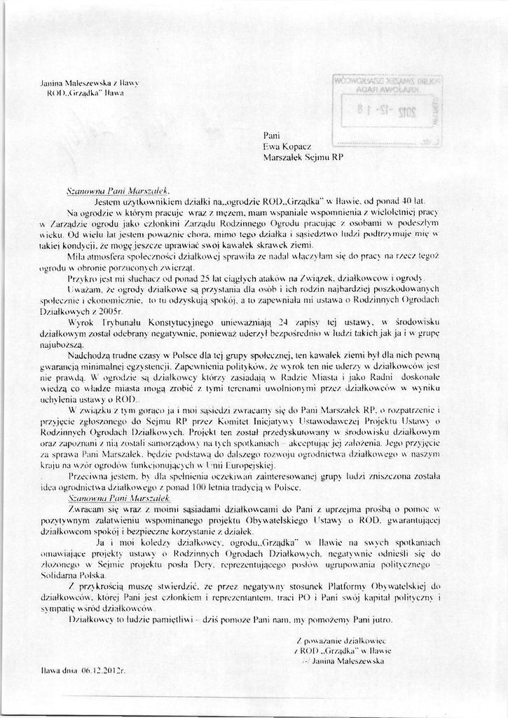 Janina Maliszewska z Iławy KOf>..Grządka" Iława Pani Ewa Kopacz Marszałek Sejmu RP Szanowna Pani Marszałek. Jestem użytkownikiem działki na,,ogrodzie ROD..Grządka" w Iławie, od ponad 40 lat. Na ogrodzie w którym pracuje wraz z mężem, mam wspaniale wspomnienia z wieloletniej pracy w Zarządzie ogrodu jako członkini Zarządu Rodzinnego Ogrodu pracując z osobami w podeszłym wieku. Od wielu lat jestem poważnie chora, mimo tego działka i sąsiedztwo ludzi podtrzymuje mię w takiej kondycji, że mogę jeszcze uprawiać swoi kawałek skrawek ziemi. Miła atmosfera społeczności działkowej sprawiła ze nadal włączyłam się do pracy na rzecz tegoż ogrodu vv obronie porzuconych zwierząt. Przy kro jest mi słuchacz od ponad 25 lat ciągłych ataków na Związek, działkowców i ogrody. Uważam, że ogrody działkowe są przystania dla osób i ich rodzin najbardziej poszkodowanych społecznie i ekonomicznie, to tu odzyskują spokój, a to zapewniała mi ustawa o Rodzinnych Ogrodach Działkowych z 2005r. Wyrok Trybunału Konstytucyjnego unieważniają 24 zapisy tej ustawy. w środowisku działkowym został odebrany negatywnie, ponieważ uderzył bezpośrednio w ludzi takich jak ja i w grupę najuboższą. Nadchodzą trudne czasy w Polsce dla tej grupy społecznej, ten kawałek ziemi był dla nich pewną gwarancją minimalnej egzystencji. Zapewnienia polityków, że wyrok ten nie uderzy w działkowców jest nie prawdą. W ogrodzie są działkowcy którzy zasiadają w Radzie Miasta i jako Radni doskonale wiedzą co władze miasta mogą zrobić z tymi terenami uwolnionymi przez działkowców w wyniku uchylenia ustawy o ROD. % związku z tym gorąco ja i moi sąsiedzi zwracamy się do Pani Marszałek RP, o rozpatrzenie i przyjęcie zgłoszonego do Sejmu RP przez Komitet Inicjatywy Ustawodawczej Projektu Ustawy o Rodzinnych Ogrodach Działkowych. Projekt ten został przedyskutowany w środowisku działkowym oraz zapoznani z nią zostali samorządowy na ty ch spotkaniach akceptując jej założenia. Jego przyjęcie za sprawa Pani Marszałek, będzie podstawą do dalszego rozwoju ogrodnictwa działkowego w naszym kraju na wzór ogrodów funkcjonujących w l m i Europejskiej. Przeciwna jestem, by dla spełnienia oczekiwań zainteresowanej grupy ludzi zniszczona została idea ogrodnictwa działkowego z ponad 100 letnia tradycją w Polsce. Szanowna Pani Marszałek. Zwracam się wraz. z moimi sąsiadami działkowcami do Pani z uprzejma prośbą o pomoc w pozytywnym załatwieniu wspominanego projektu Obywatelskiego Ustawy o ROD. gwarantującej działkowcom spokój i bezpieczne korzystanie z. działek. Ja i moi koledzy działkowcy, ogrodu.,Grządka" w Iławie na swych spotkaniach omawiające projekty ustawy o Rodzinnych Ogrodach Działkowych, negatywnie odnieśli się do złożonego w Sejmie projektu posła Dery. reprezentującego posłów ugrupowania politycznego Solidarna Polska. Z przykrością muszę stwierdzić, ze przez negatywny stosunek Platformy Obywatelskiej do działkowców, której Pani jest członkiem i reprezentantem, traci PO i Pani swój kapitał polityczny i sympatię wśród działkowców Działkowcy to ludzie pamiętliwi dziś pomoże Pani nam. my pomożemy Pani jutro. Z poważanie działkowiec / ROD „Grządka" w Iławie /- Janina Makszewska Iława dnia 06.12.2012r.