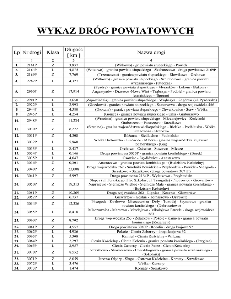 WYKAZ DRÓG POWIATOWYCH Lp Nr drogi Klasa Długość [ km ] 1. 2. 3. 1 2161P 2164P 2169P 2 Z L Z 3 3,937 4,875 7,769 4. 2262P L 4,327 5. 2900P Z 17,914 6. 7. 8 9 2901P 2922P 2944P 2945P L L L L 3,650 2,993 4,580 4,254 10. 2948P Z 11,234 11. 3030P Z 8,222 12. 3031P Z 4,308 13. 3032P L 5,960 14. 15. 16. 17. 3033P 3034P 3035P 3036P L L L Z 8,437 0,146 4,647 0,301 18. 3040P Z 23,008 19. 3041P Z 5,997 20. 3050P Z 19,313 21. 22. 3051P 3052P Z Z 10,269 6,737 23. 3054P Z 12,336 24. 3055P L 8,418 25. 3060P Z 8,702 26. 27. 28. 29. 30. 3061P 3062P 3063P 3064P 3065P Z L L L L 4,557 4,926 5,308 2,297 2,957 31. 3070P Z 8,552 32. 33. 34. 3071P 3072P 3073P Z L L 8,059 3,476 1,474 Nazwa drogi 4 (Witkowo) - gr. powiatu słupeckiego - Powidz (Witkowo) - granica powiatu słupeckiego - Skubarczewo - droga powiatowa 2169P (Trzemeszno) - granica powiatu słupeckiego - Słowikowo - Orchowo (Witkowo) - granica powiatu słupeckiego - Szemborowo - granica powiatu wrzesińskiego - (Otoczna) (Pyzdry) - granica powiatu słupeckiego - Myszaków - Łukom - Bukowe Augustynów - Drzewce -Nowa Wieś - Trąbczyn - Podbiel - granica powiatu konińskiego - (Sporne) (Zapowiednia) - granica powiatu słupeckiego - Wrąbczyn - Zagórów (ul. Pyzderska) (Gozdowo) - granica powiatu słupeckiego - Samarzewo - droga wojewódzka 466 (Otoczna) - granica powiatu słupeckiego - Chwałkowice - Staw - Wólka (Gonice) - granica powiatu słupeckiego - Unia - Graboszewo (Września) - granica powiatu słupeckiego - Młodziejewice - Kościanki Graboszewo - Paruszewo - Strzałkowo (Strzelno) - granica województwa wielkopolskiego - Bielsko - Podbielsko - Wólka Orchowska - Orchowo Różanna - Siedluchno - Podbielsko Wólka Orchowska - Linówiec - Mlecze - granica województwa kujawsko pomorskiego - (Gaj) Orchowo - Osówiec - Suszewo - Mlecze Droga powiatowa 3033P - granica powiatu konińskiego - (Borek) Osówiec - Szydłówiec - Anastazewo Anastazewo - granica powiatu konińskiego - (Budzisław Kościelny) Droga wojewódzka 262 - Smolniki Powidzkie - Przybrodzin - Powidz - Niezgoda Sierakowo - Strzałkowo (droga powiatowa 3071P) Droga powiatowa 2164P - Wylatkowo - Przybrodzin Słupca (ul. Pułaskiego, Plac Szkolny, ul. Traugutta) - Piotrowice - Giewartów Naprusewo - Siernicze Wielkie - Siernicze Małe - granica powiatu konińskiego (Budzisław Kościelny) Droga wojewódzka 262 - Lipnica - Kosewo - Giewartów Giewartów - Gostuń - Tomaszewo - Ostrowite Niezgoda - Kochowo - Mieczownica - Doły - Tumidaj - Szyszłowo - granica powiatu konińskiego - (Dobrosołowo) Mieczownica - Marcewo - Młodojewo - Młodojewo Parcele - droga wojewódzka 263 Droga wojewódzka 263 - Żelazków - Pokoje - Kamień - granica powiatu konińskiego (Kozarzew) Droga powiatowa 3060P - Rozalin - droga krajowa 92 Pokoje - Cienin Zaborny - droga krajowa 92 Kamień - Cienin Kościelny - Wilczna Cienin Kościelny - Cienin Kolonia - granica powiatu konińskiego - (Przyjma) Cienin Zaborny - Cienin Perze - Cienin Kościelny Strzałkowo - Skarboszewo - Chwalibogowo - granica powiatu wrzesińskiego (Sokolniki) Janowo Olędry - Skąpe - Ostrowo Kościelne - Kornaty - Strzałkowo Wólka - Kornaty Kornaty - Sierakowo 35. 36. 37. 38. 39. 40. 41. 42. 43. 44. 45. 46. 3074P 3075P 3076P 3077P 3078P 3080P 3081P 3082P 3083P 3084P 3085P 3086P L L L L L Z Z L L Z Z L 3,433 3,920 3,096 4,845 5,493 5,893 5,314 4,792 8,540 5,294 6,559 0,564 47. 3090P Z 20,492 48. 3091P Z 6,770 49. 3092P Z 2,384 50. 3093P Z 6,311 51. 52. 53. 54. 3094P 3095P 3096P 3097P Z L Z Z 2,846 4,836 0,518 2,851 Łącznie 338,694 km Sierakowo - Słomczyce - Piotrowice Szemborowo - Brudzewo - droga wojewódzka 260 Brudzewo - Chwałkowice Droga krajowa 92 - Krępkowo - Graboszewo Graboszewo - Chwalibogowo - Wierzbocice (droga wojewódzka 466) Słupca (ul. Słowackiego, ul. Pyzderska) - Kotunia - Kąty - droga wojewódzka 466 Samarzewo - Dąbrowa - droga wojewódzka 466 Kąty - Dziedzice - Ciążeń Wierzbno - Kowalewo Opactwo - Wola Koszucka Parcele - Wacławów Droga krajowa 92 - Wola Koszucka Parcele - Wola Koszucka - Lądek Droga krajowa 92 - Wacławów - Sługocin Wacławów - granica powiatu konińskiego - Chrusty Słupca (ul. Zagórowska) - Wierzbno - Jaroszyn - Ląd - Zagórów (ul. Słupecka, ul. Okólna, ul. Berdychów) - Imielno - Łukom - Huta Łukomska - granica powiatu wrzesińskiego - (Gizałki) Zagórów (ul. Konińska) - Oleśnica - Skokum - Kopojno - granica powiatu konińskiego - (Rzgów) Zagórów (ul. Kaliska) - Drzewce Droga powiatowa 2900P - Grabina - Łazińsk Pierwszy - granica powiatu pleszewskiego - (Orlina Mała) Oleśnica - Trąbczyn Trąbczyn - Osiny - Michalinów Trąbczyński - droga powiatowa 3093P - (Grabina) Droga powiatowa 2900P - granica powiatu konińskiego - (Rzgów) Droga powiatowa 2900P - Szetlewek - granica powiatu konińskiego - (Grodziec)