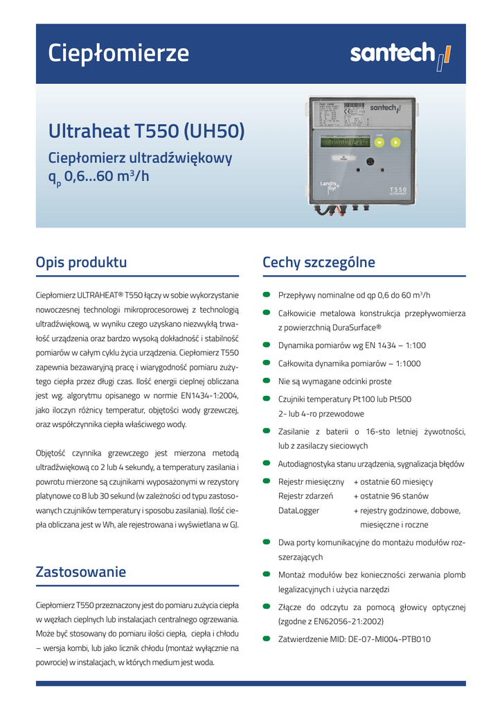 Ciepłomierze Ultraheat T550 (UH50) Ciepłomierz ultradźwiękowy qp 0,6…60 m3/h Opis produktu Cechy szczególne Ciepłomierz ULTRAHEAT® T550 łączy w sobie wykorzystanie Przepływy nominalne od qp 0,6 do 60 m3/h nowoczesnej technologii mikroprocesorowej z technologią Całkowicie metalowa konstrukcja przepływomierza ultradźwiękową, w wyniku czego uzyskano niezwykłą trwałość urządzenia oraz bardzo wysoką dokładność i stabilność pomiarów w całym cyklu życia urządzenia. Ciepłomierz T550 z powierzchnią DuraSurface® Dynamika pomiarów wg EN 1434 – 1:100 zapewnia bezawaryjną pracę i wiarygodność pomiaru zuży- Całkowita dynamika pomiarów – 1:1000 tego ciepła przez długi czas. Ilość energii cieplnej obliczana Nie są wymagane odcinki proste jest wg. algorytmu opisanego w normie EN1434-1:2004, Czujniki temperatury Pt100 lub Pt500 jako iloczyn różnicy temperatur, objętości wody grzewczej, oraz współczynnika ciepła właściwego wody. Objętość czynnika grzewczego jest mierzona metodą 2- lub 4-ro przewodowe Zasilanie z baterii o 16-sto letniej żywotności, lub z zasilaczy sieciowych ultradźwiękową co 2 lub 4 sekundy, a temperatury zasilania i Autodiagnostyka stanu urządzenia, sygnalizacja błędów powrotu mierzone są czujnikami wyposażonymi w rezystory Rejestr miesięczny + ostatnie 60 miesięcy platynowe co 8 lub 30 sekund (w zależności od typu zastoso- Rejestr zdarzeń wanych czujników temperatury i sposobu zasilania). Ilość cie- DataLogger pła obliczana jest w Wh, ale rejestrowana i wyświetlana w GJ. + ostatnie 96 stanów + r ejestry godzinowe, dobowe, miesięczne i roczne Dwa porty komunikacyjne do montażu modułów roz- Zastosowanie szerzających Montaż modułów bez konieczności zerwania plomb legalizacyjnych i użycia narzędzi Ciepłomierz T550 przeznaczony jest do pomiaru zużycia ciepła w węzłach cieplnych lub instalacjach centralnego ogrzewania. Może być stosowany do pomiaru ilości ciepła, ciepła i chłodu – wersja kombi, lub jako licznik chłodu (montaż wyłącznie na powrocie) w instalacjach, w których medium jest woda. Złącze do odczytu za pomocą głowicy optycznej (zgodne z EN62056-21:2002) Zatwierdzenie MID: DE-07-MI004-PTB010 Dane techniczne Dokładność pomiaru Klasa środowiskowa Klasa 2 wg normy EN 1434 Czujnik temperatury A, M1, E1 do stosowania wewnątrz budynków, wg PN EN 1434) Typ Pt500 lub Pt100 zgodne z normą EN 60751 Zakres temperatur: 0…180°C Różnica temperatur ∆T 3 K do 150 K Przelicznik wskazujący Temperatura magazynowania: -20 do 60° C Temperatura otoczenia: od 5 do 55° C Wilgotność: < 93% względna Klasa ochronności: IP 54 wg z EN 60529 Zakres pomiaru temperatur 2…180° C Różnica temperatur ∆T2 3 K do 120 K Próg czułości ∆T 0,2 K Zasilanie (alternatywnie) Bateria litowa, żywotność: 6, 11 lub 16 lat Moduł zasilania sieciowego 24 VDC,110 VAC, 230 VAC Przetwornik przepływu Zakres przepływu qp 0,6 m3/h…qp 60 m3/h Miejsce montażu na powrocie lub zasilaniu Kierunek montażu dowolny Odcinki proste inst. nie są wymagane Dynamika pomiarów 1:100 Zakres temperatur 10…130° C Temperatura maks. 150° C (przez 2000 h/rok) Przepływ maksymalny 2,8 x qp Ciśnienie nominalne PN16 – wyk. gwintowane PN25 – wyk. kołnierzowe Klasa ochronności Klasa bezpieczeństwa Przy zasilaniu 110/230VAC II wg z EN 61558 Przy zasilaniu 24 V ACDC III wg z EN 61558 IP54 lub IP65 wg EN 60529 IP65 zabezpiecza nadajniki przed wilgocią z kondensacji pary wodnej w układach chłodniczych Moduły komunikacyjne Łączenie modułów Ciepłomierze T550 są standardowo wyposażone w inter- Ciepłomierz T550 wyposażony jest w dwa niezależne fejs optyczny. Ponadto, w celu umożliwienia zdalnego od- gniazda na moduły komunikacyjne. Oba sterowane są od- czytu wskazań, licznik T550 wyposażony jest w 2 porty do dzielnymi procesorami. Dzięki temu istnieje pełna dowol- montażu modułów komunikacyjnych. ność jednoczesnego korzystania z dostępnych modułów CE/CV – Moduł impulsowy (impulsy: ilość ciepła / objętość komunikacyjnych, zgodnie z ich opisem co nie blokuje do- / stan pracy urządzenia / rejestr taryfowy 1 / rejestr tary- stępu do licznika przez złącze optyczne. fowy 2, izolowane, bez odbić) . CL – Moduł analogowy (bierna 20 mA pętla prądowa. Dla niektórych modułów, producent zastrzega sobie pra- MB G4 – Moduł komunikacyjny M-bus. wo do wskazania preferowanego gniazda. Korzystając MI G4 – Moduł komunikacyjny M-bus, 2 wejścia impulsowe. z modułów z wejściami impulsowymi, należy pamiętać, że AM - Moduł analogowy 0/4…20 mA. możliwe jest zaprogramowanie nastaw tylko dla 2 wejść RM – Moduł do komunikacji radiowej 433 MHz z dwoma impulsowych. Z tego powodu nie można podłączyć 4 do- wejściami impulsowymi. datkowych wodomierzy. W przypadku, gdy w obydwu RF – Moduł do komunikacji radiowej 868 MHz z protoko- gniazdach zostaną zastosowane moduły z wejściami im- łem otwartym OMS T1. pulsowymi, do których zostaną podłączone 4 wodomie- RS485 – MBUS i ModBus RTU, 2 wejścia impulsowe. rze, licznik będzie stosował nastawy tylko dla wejść wo- GM – Moduł GSM/GPRS z dwoma wejściami impulsowy- domierzowych na module zainstalowanym w gnieździe 1. mi, do odczytu ciepłomierzy za pomocą transmisji GSM. W przypadku, gdy podłączamy 2 wodomierze z nadajni- LON Works FTT-10A – do budowy sieci inteligentnych. kami impulsów, możemy je połączyć z dowolnym jednym BacNet – HAN. modułem z gniazda 1 lub 2. ® Ciepłomierze Dane techniczne Małe ciepłomierze Wymiary i rodzaje Duże ciepłomierze z przyłączem gwintowym alternatywna opcja montażu Całkowita długość 110 mm Nr zam. qp m3/h PN bar a b GW dn UH50x45 3.5 16 260 51 1¼“ 25 UH50x47 3.5 25 260 51 1¼“ 25 UH50x50 6 16 260 51 1¼“ 25 UH50x60 10 16 300 48 2“ 40 Całkowita długość 130 mm Duże ciepłomierze z przyłączem kołnierzowym Całkowita długo