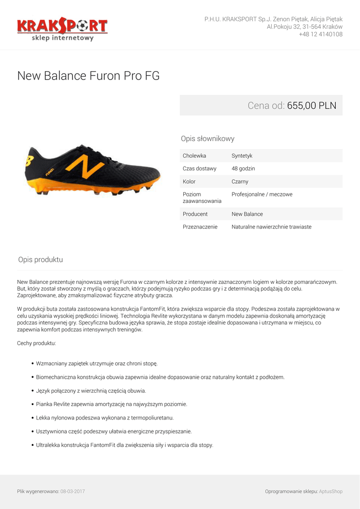 P.H.U. KRAKSPORT Sp.J. Zenon Piętak, Alicja Piętak Al.Pokoju 32, 31-564 Kraków +48 12 4140108 New Balance Furon Pro FG Cena od: 655,00 PLN Opis słownikowy Cholewka Syntetyk Czas dostawy 48 godzin Kolor Czarny Poziom zaawansowania Profesjonalne / meczowe Producent New Balance Przeznaczenie Naturalne nawierzchnie trawiaste Opis produktu New Balance prezentuje najnowszą wersję Furona w czarnym kolorze z intensywnie zaznaczonym logiem w kolorze pomarańczowym. But, który został stworzony z myślą o graczach, którzy podejmują ryzyko podczas gry i z determinacją podążają do celu. Zaprojektowane, aby zmaksymalizować fizyczne atrybuty gracza. W produkcji buta została zastosowana konstrukcja FantomFit, która zwiększa wsparcie dla stopy. Podeszwa została zaprojektowana w celu uzyskania wysokiej prędkości liniowej. Technologia Revlite wykorzystana w danym modelu zapewnia doskonałą amortyzację podczas intensywnej gry. Specyficzna budowa języka sprawia, że stopa zostaje idealnie dopasowana i utrzymana w miejscu, co zapewnia komfort podczas intensywnych treningów. Cechy produktu: Wzmacniany zapiętek utrzymuje oraz chroni stopę. Biomechaniczna konstrukcja obuwia zapewnia idealne dopasowanie oraz naturalny kontakt z podłożem. Język połączony z wierzchnią częścią obuwia. Pianka Revlite zapewnia amortyzację na najwyższym poziomie. Lekka nylonowa podeszwa wykonana z termopoliuretanu. Usztywniona część podeszwy ułatwia energiczne przyspieszanie. Ultralekka konstrukcja FantomFit dla zwiększenia siły i wsparcia dla stopy. Plik wygenerowano: 08-03-2017 Oprogramowanie sklepu: AptusShop P.H.U. KRAKSPORT Sp.J. Zenon Piętak, Alicja Piętak Al.Pokoju 32, 31-564 Kraków +48 12 4140108 Warianty produktu Plik wygenerowano: 08-03-2017 40 655,00 PLN 40.5 655,00 PLN 41 655,00 PLN 42 655,00 PLN 42.5 655,00 PLN 43 655,00 PLN 44 655,00 PLN Oprogramowanie sklepu: AptusShop P.H.U. KRAKSPORT Sp.J. Zenon Piętak, Alicja Piętak Al.Pokoju 32, 31-564 Kraków +48 12 4140108 44.5 655,00 PLN Galeria Plik wygenerowano: 08-03-2017 Powered by TCPDF (www.tcpdf.org) Oprogramowanie sklepu: AptusShop