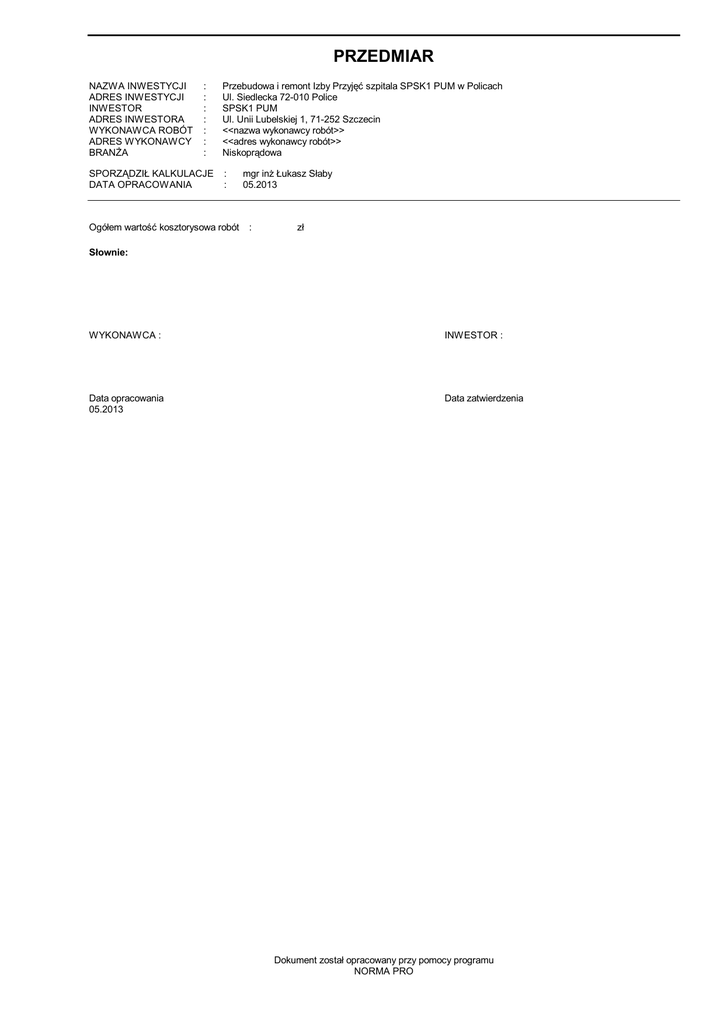 PRZEDMIAR NAZWA INWESTYCJI ADRES INWESTYCJI INWESTOR ADRES INWESTORA WYKONAWCA ROBÓT ADRES WYKONAWCY BRANŻA : : : : : : : SPORZĄDZIŁ KALKULACJE DATA OPRACOWANIA Przebudowa i remont Izby Przyjęć szpitala SPSK1 PUM w Policach Ul. Siedlecka 72-010 Police SPSK1 PUM Ul. Unii Lubelskiej 1, 71-252 Szczecin <<nazwa wykonawcy robót>> <<adres wykonawcy robót>> Niskoprądowa : : Ogółem wartość kosztorysowa robót mgr inż Łukasz Słaby 05.2013 : zł Słownie: WYKONAWCA : INWESTOR : Data opracowania 05.2013 Data zatwierdzenia Dokument został opracowany przy pomocy programu NORMA PRO Kosztorys Szpital Police branza niskopradowa Lp. Podstawa 1 1 KNNR 5 d.1 1209-09 2 KNNR 5 d.1 0114-08 3 KNNR 5 d.1 0301-12 4 KNNR 5 d.1 0302-01 5 KNNR 5 d.1 1207-07 6 KNNR 5 d.1 0102-01 7 KNNR 5 d.1 0203-01 8 KNNR 5 d.1 1208-05 9 KNNR 5 d.1 0209-02 10 KNNR 5 d.1 1208-01 11 KNNR 5 d.1 0502-01 12 KNNR 5 d.1 0502-01 13 KNNR 5 d.1 0306-04 14 KNNR 5 d.1 0306-04 15 KNNR 5 d.1 0306-04 16 KNNR 5 d.1 0406-01 17 KNNR 5 d.1 0406-03 18 KNR AL-01 d.1 0109-01 PRZEDMIAR Opis i wyliczenia j.m. System przyzywowy Przebijanie otworów śr. 25 mm o długości do 10 cm w ścianach lub stropach z be- otw. tonu 10 otw. Przepusty rurowe hermetyczne w ścianie z rur o śr.do 36 mm szt. 10 szt. Przygotowanie podłoża pod osprzęt instalacyjny mocowany na zaprawie cemento- szt. wej lub gipsowej - wykonanie ślepych otworów w podłożu betonowym 6 szt. Puszki instalacyjne podtynkowe pojedyncze o śr.do 60 mm szt. 6 szt. Wykucie bruzd dla rur RKLG18, RS22 w betonie m 133 m Rury winidurowe karbowane (giętkie) o śr.do 19 mm układane p.t. w gotowych bruzdach w betonie 133 m Przewody kabelkowe o łącznym przekroju żył do 7.5 mm2 wciągane do rur m 27+10+7+15+10+10+14+10+18+12 m Zaprawianie bruzd - ręczne przygotowanie zaprawy cementowo-wapiennej m3 0.03*0.03*133 m3 Przewody kabelkowe o łącznym przekroju żył do 12.5 mm2 układane w gotowych korytkach i na drabinkach bez mocowania 15+28+5 m Zaprawianie bruzd o szerokości do 25 mm m 133 m m m Oprawy oświetleniowe przykręcane (zwykłe) - analogia montaż salowy opraw sys- kpl. temowych z elektroniką- systemu Meden-Opt 2 kpl. Oprawy oświetleniowe przykręcane (zwykłe) - analogia montaż salowy opraw sys- kpl. temowych z elektroniką- systemu Meden-Opt 2 kpl. Łączniki krzyżowe, dwubiegunowe podtynkowe w puszce instalacyjnej - analogia montaż przycisków przywoławczo-odwoławczych- systemu Meden-Opt 2 szt. Łączniki krzyżowe, dwubiegunowe podtynkowe w puszce instalacyjnej - analogia montaż przycisków przywoławczych z manipulatorem- systemu Meden-Opt 3 szt. Łączniki krzyżowe, dwubiegunowe podtynkowe w puszce instalacyjnej - analogia montaż przycisku sznurkowego- systemu Meden-Opt 1 szt. Aparaty elektryczne o masie do 2.5 kg -analogia montaż wyświetlacza LCD szt. 0 szt. Aparaty elektryczne o masie do 10 kg-analogia montaż zasilacza- systemu Meden-Opt 1 szt. Montaż akumulatora bezobsługowego o poj. do 10 Ah Wyszczególnienie robót: 1. Montaż akumulatora bezobsługowego. 2 szt. -2- Norma PRO Wersja 4.23 Licencja: 18309 dla SPSK1 szt. szt. szt. szt. szt. Poszcz Razem 10.000 RAZEM 10.000 10.000 RAZEM 10.000 6.000 RAZEM 6.000 6.000 RAZEM 6.000 133.000 RAZEM 133.000 133.000 RAZEM 133.000 133.000 RAZEM 133.000 0.120 RAZEM 0.120 48.000 RAZEM 48.000 133.000 RAZEM 133.000 2.000 RAZEM 2.000 2.000 RAZEM 2.000 2.000 RAZEM 2.000 3.000 RAZEM 3.000 1.000 RAZEM 1.000 0.000 RAZEM 0.000 1.000 RAZEM 1.000 2.000 RAZEM 2.000 Kosztorys Szpital Police branza niskopradowa Lp. Podstawa 19 KNNR 5 d.1 0209-01 20 KNNR 5 d.1 0406-01 21 KNNR 5 d.1 1203-08 22 KNR 5-02 d.1 1501-02 23 KNR 5-06 d.1 1614-02 2 2.1 2.2 24 KNR AT-14 d.2.2 0110-04 25 KNR 7-08 d.2.2 0512-01 26 KNR AT-14 d.2.2 0107-05 27 KNR AT-14 d.2.2 0107-05 28 KNR 5-08 d.2.2 0309-06 29 KNNR 5 d.2.2 1203-08 30 KNR AL-01 d.2.2 0116-04 31 KNR AL-01 d.2.2 0116-04 2.3 32 KNNR 5 d.2.3 1209-10 33 KNNR 5 d.2.3 0114-08 34 KNNR 5 d.2.3 1105-08 35 KNNR 5 d.2.3 1207-07 36 KNNR 5 d.2.3 0102-01 PRZEDMIAR Opis i wyliczenia Przewody kabelkowe o łącznym przekroju żył do 7.5 mm2 układane w gotowych korytkach i na drabinkach bez mocowania 2 j.m. m m Aparaty elektryczne o masie do 2.5 kg - analogia montaż centrali systemowej- sys- szt. temu Meden-Opt 1 szt. Podłączenie przewodów kabelkowych o przekroju żyły do 2.5 mm2 pod zaciski lub szt.żył bolce (podłączenie zasilania zasilacza i centrali systemowej) 3 szt.żył Przedzwonienie żył kabla z parami symetrycznymi - do 20 par odc. 1 odc. Sprawdzenie i uruchomienie linii dozorowych o 20 punktach szt. 1 szt. Instalacja okablowania strukturalnego LAN Demontaż istniejącego punktu dystrybucyjnego PD Montaż punktu dystrybucyjnego PD Montaż wyposażenia szaf dystrybucyjnych 19" - listwa zasilająca szt. 1 szt. Obróbka końców kabli sygnalizac.oraz przew.kabelkowych i kompensacyjnych o ilości żył do 7 obrobka kabli FTP kat. 6a. 26 końc. końc. Montaż gniazd RJ45 w gnieździe abonenckim lub panelu - dodatek za przygotowa- szt. nie i montaż etykiet opisowych gniazda 26 szt. Montaż gniazd RJ45 w gnieździe abonenckim lub panelu - dodatek za przygotowa- szt. nie i montaż etykiet opisowych gniazda 13 szt. Montaż do gotowego podłoża gniazd wtyczkowych bryzgoszczelnych 2-bieg.z uziemieniem przykręcanych 16A/2.5mm2 z podłączeniem 1 szt. Montaż dodatkowego wyposażenia systemu alarmowego - giętka osłona kablowa z szt. tworzywa sztucznego - analogia montaż kabli krosowy Patchcordów 13 szt. Montaż dodatkowego wyposażenia systemu alarmowego - giętka osłona kablowa z szt. tworzywa sztucznego - analogia montaż kabli krosowy Patchcordów 13 szt. Okablowanie strukturalne pionowe i poziome Przebijanie otworów śr. 40 mm o długości do 20 cm w ścianach lub stropach z be- otw. tonu 15 otw. Przepusty rurowe hermetyczne w ścianie z rur o śr.do 36 mm szt. 15 szt. Korytka o szerokości do 200 mm przykręcane do gotowych otworów m 50 m Wykucie bruzd dla rur RKLG18, RS22 w betonie m