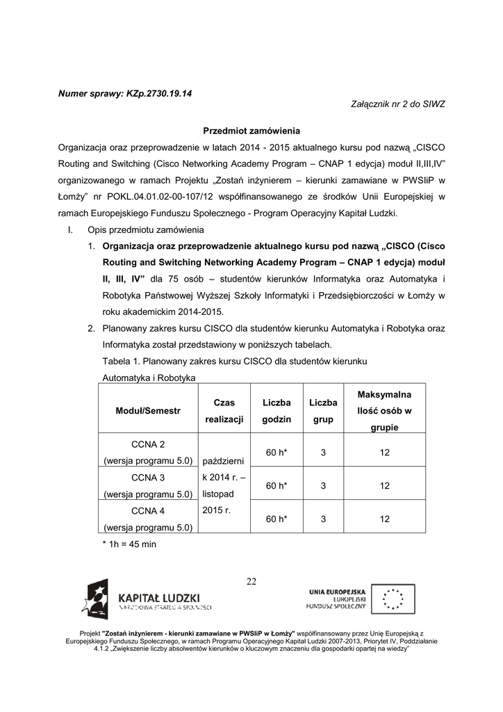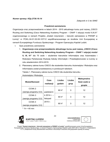 Numer sprawy: KZp.2730.19.14 Załącznik nr 2 do SIWZ Przedmiot zamówienia Organizacja oraz przeprowadzenie w latach 2014 - 2015 aktualnego kursu pod nazwą „CISCO Routing and Switching (Cisco Networking Academy Program – CNAP 1 edycja) moduł II,III,IV” organizowanego w ramach Projektu „Zostań inżynierem – kierunki zamawiane w PWSIiP w Łomży” nr POKL.04.01.02-00-107/12 współfinansowanego ze środków Unii Europejskiej w ramach Europejskiego Funduszu Społecznego - Program Operacyjny Kapitał Ludzki. I. Opis przedmiotu zamówienia 1. Organizacja oraz przeprowadzenie aktualnego kursu pod nazwą „CISCO (Cisco Routing and Switching Networking Academy Program – CNAP 1 edycja) moduł II, III, IV” dla 75 osób – studentów kierunków Informatyka oraz Automatyka i Robotyka Państwowej Wyższej Szkoły Informatyki i Przedsiębiorczości w Łomży w roku akademickim 2014-2015. 2. Planowany zakres kursu CISCO dla studentów kierunku Automatyka i Robotyka oraz Informatyka został przedstawiony w poniższych tabelach. Tabela 1. Planowany zakres kursu CISCO dla studentów kierunku Automatyka i Robotyka Moduł/Semestr Maksymalna Czas Liczba Liczba realizacji godzin grup 60 h* 3 12 60 h* 3 12 60 h* 3 12 CCNA 2 (wersja programu 5.0) październi CCNA 3 k 2014 r. – (wersja programu 5.0) listopad CCNA 4 2015 r. (wersja programu 5.0) Ilość osób w grupie * 1h = 45 min 22 Projekt "Zostań inżynierem - kierunki zamawiane w PWSIiP w Łomży" współfinansowany przez Unię Europejską z Europejskiego Funduszu Społecznego, w ramach Programu Operacyjnego Kapitał Ludzki 2007-2013, Priorytet IV, Poddziałanie 4.1.2 „Zwiększenie liczby absolwentów kierunków o kluczowym znaczeniu dla gospodarki opartej na wiedzy” ** łączna ilość godzin kursu przeznaczona dla kierunku Automatyka i Robotyka wynosi 540 godzin Tabela 2. Planowany zakres kursu CISCO Exploration dla studentów kierunku Informatyka Moduł/Semestr Maksymalna Czas Liczba Liczba realizacji godzin grup 60 h* 4 12 60 h 4 12 CCNA 3 październik (wersja programu 5.0) 2014 r. – CCNA 4 listopad (wersja programu 5.0) 2015 r. Ilość osób w grupie * 1h = 45 min ** łączna ilość godzin kursu przeznaczona dla kierunku Informatyka wynosi 480 godzin 3. Kurs musi być prowadzony przez Akademię Cisco, posiadającą odpowiednie certyfikaty i wykwalifikowaną kadrę. 4. Miejscem odbycia kursu ma być Akademia Cisco w siedzibie zamawiającego Państwowa Wyższa Szkoła Informatyki i Przedsiębiorczości w Łomży, ul. Akademicka 1 lub ul. Akademicka 14. 5. Szkolenie „CISCO Routing and Switching (Cisco Networking Academy Program – CNAP 1 edycja) moduł II,III,IV” powinny być przeprowadzane w laboratorium i w systemie Netspace Akademii Sieci Cisco Państwowej Wyższej Szkoły Informatyki i Przedsiębiorczości (ul. Akademicka 1 lub 14, 18-400 Łomża). Zamawiający dysponuje wystarczającym wyposażeniem laboratorium do prowadzenie zajęć zgodnie z programem Cisco Networking Academy i aktualną wersją 5.0 szkolenia CCNA Routing and Switching. 6. Dni oraz godziny realizacji kursu muszą być uzgodnione z osobą odpowiedzialną za organizację kursów i staży, Panem Adrianem Sokołowskim w celu uniknięcia zdublowania godzin kursu z godzinami realizacji obowiązkowych zajęć studentów i 23 Projekt "Zostań inżynierem - kierunki zamawiane w PWSIiP w Łomży" współfinansowany przez Unię Europejską z Europejskiego Funduszu Społecznego, w ramach Programu Operacyjnego Kapitał Ludzki 2007-2013, Priorytet IV, Poddziałanie 4.1.2 „Zwiększenie liczby absolwentów kierunków o kluczowym znaczeniu dla gospodarki opartej na wiedzy” mogą obejmować nie więcej niż 6 godzin dziennie dla jednej grupy; zaleca się aby cały kurs był zrealizowany w terminie od października 2014 r. do 30 listopad 2015 r. 7. Szkolenia prowadzone będą w języku polskim w oparciu o aktualny kurs CISCO Routing and Switching wersja 5.0 (przygotowująca do międzynarodowego egzaminu certyfikującego Cisco 200 – 120 CCNA), według ścieżki Akademii Cisco 8. Wykonawca zapewni materiały szkoleniowe w języku polskim lub angielskim, odpowiadające zakresowi merytorycznemu poszczególnych szkoleń w postaci skryptów, podręczników umożliwiających samodzielną naukę realizowanych treści programowych szkolenia, które po zakończeniu szkolenia przekazuje Wykonawca każdemu z kursantów na własność, 9. Kurs będzie realizowany w formie wykładów, laboratoriów, konsultacji oraz tzw. samokształcenia, 10. Zamawiający zastrzega sobie zmniejszenie liczby studentów przystępujących do kursu nie wpłynie to jednak na zmniejszenie liczby grup; ostateczna liczba uczestników kursu będzie podana w trakcie ustalania harmonogramu kursu, 11. Warunkiem otrzymania imiennego certyfikatu potwierdzającego nabytą wiedzę i umiejętności ze zdanych egzaminów oraz zaświadczenie o ukończeniu kursu po jego zakończeniu będzie uczestnictwo w zajęciach oraz przystąpienie do każdego egzaminu wewnętrznego (każdego modułu/semestru), 12. Oferent zobowiązany jest do oznaczania dokumentów, pomieszczeń, materiałów edukacyjnych, zaświadczeń, certyfikatów: logo i nazwą projektu, logo PO KL, UE, EFS wraz z tekstami opisującymi zaangażowanie środków UE w projekt zgodne z Wytycznymi dotyczącymi oznaczania projektów w ramach Programu Operacyjnego Kapitał Ludzki, 13. Wykonawca będzie prowadził dokumentację kursu, tj.: a) dziennik zajęć edukacyjnych zawierający listę obecności, wymiar godzin i tematy zajęć edukacyjnych, zgodnie z wzorem opracowanym przez osobę odpowiedzialną za organizację kursów i staży wymienioną w pkt.15, b) zbierze oświadczenia o zgodzie na przetwarzanie danych osobowych, 24 Projekt "Zostań inżynierem - kierunki zamawiane w PWSIiP w Łomży" współfinansowany przez Unię Europejską z Europejskiego Funduszu Społecznego, w ramach Programu Operacyjnego Kapitał Ludzki 2007-2013, Priorytet IV, Poddzia