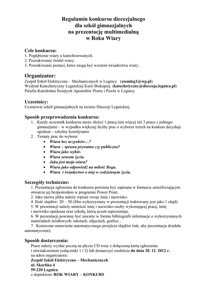 Regulamin konkursu diecezjalnego dla szkół gimnazjalnych na prezentację multimedialną w Roku Wiary Cele konkursu: 1. Pogłębienie wiary u katechizowanych. 2. Poszukiwanie źródeł wiary. 3. Poszukiwanie postaci, które mogą być wzorem świadectwa wiary. Organizator: Zespół Szkół Elektryczno – Mechanicznych w Legnicy ([email protected]) Wydział Katechetyczny Legnickiej Kurii Biskupiej ([email protected]) Parafia Katedralna Świętych Apostołów Piotra i Pawła w Legnicy Uczestnicy: Uczniowie szkół gimnazjalnych na terenie Diecezji Legnickiej. Sposób przeprowadzenia konkursu: 1. Każdy uczestnik konkursu może złożyć 1 pracę (nie więcej niż 3 prace z jednego gimnazjum) – w wypadku większej liczby prac o wyborze trzech na konkurs decyduje opiekun – szkolny koordynator 2. Tematy prac do wyboru: Wiara bez uczynków…? Wiara – sprawa prywatna czy publiczna? Wiara jako wybór. Wiara sensem życia. Jaka jest moja wiara? Wiara jako odpowiedź na miłość Boga. Wiara i świadectwo o niej w codziennym życiu. Szczegóły techniczne: 1. Prezentacja zgłoszona do konkursu powinna być zapisana w formacie umożliwiającym otwarcie jej bezpośrednio w programie Power Point. 2. Jako nazwę pliku należy wpisać swoje imię i nazwisko. 4. Ilość slajdów: 20 – 30 (film wykorzystany w prezentacji traktowany jest jako 1 slajd). 5. W prezentacji należy umieścić imię i nazwisko osoby wykonującej pracę, imię i nazwisko opiekuna oraz szkołę, którą uczeń reprezentuje. 6. W prezentacji powinny być zawarte w formie bibliografii informacje o wykorzystanych materiałach źródłowych: tekstach, zdjęciach, grafice… 7. Konieczne ustawienie automatycznego przejścia slajdów (tak, aby prezentacja działała automatycznie). Sposób dostarczenia: Prace należy wysłać pocztą na płycie CD wraz z dołączoną kartą zgłoszenia i oświadczeniem (załączniki 1 i 2) lub dostarczyć osobiście do dnia 20. 12. 2012 r. na adres organizatora: Zespół Szkół Elektryczno – Mechanicznych ul. Skarbka 4 59-220 Legnica z dopiskiem: ROK WIARY – KONKURS Prace zgłoszone na konkurs pozostają do dyspozycji organizatora! Ocena prac: zostanie dokonana przez komisję konkursową, w skład której będą wchodzić osoby oceniające prace pod względem merytorycznym, estetycznym i formalnym. Oceniane będą wyłącznie prace tworzone przez uczniów samodzielnie, pod kierunkiem opiekuna. Etapy konkursu: I - wyłonienie spośród złożonych prac prezentacji finałowych do 15. 01.2013 r. II - wyłonienie przez Komisję Konkursową laureatów – przyznanie I, II, III miejsca oraz wyróżnień Wyniki konkursu: zostaną ogłoszone na stronie zespołu Szkół Elektryczno-Mechanicznych w Legnicy oraz Wydziału Katechetycznego Legnickiej Kurii Biskupiej. Nagrodzone i wyróżnione szkoły zostaną poinformowane, a laureaci z opiekunami otrzymają zaproszenie na uroczystość wręczenia nagród po 10. 02. 2013 r. Kryteria oceniania: Zgodność treści prezentacji z wybranym tematem Poprawność merytoryczna informacji zamieszczonych w prezentacji Przejrzysty i uporządkowany układ prezentacji (obraz, tekst, muzyka, film) Adekwatność wykorzystanych narzędzi i efektów do przedstawianych treści Innowacyjność i kreatywność w podejściu do tematu Stopień trudności użytych technik Ogólne wrażenia estetyczne Postanowienia końcowe: Ocenione zostaną tylko prace nadesłane w terminie wraz z wypełnionymi załącznikami (kartą zgłoszenia i oświadczeniem) Ocena komisji konkursowej jest ostateczna i nie podlega odwołaniom Nagrodzeni uczestnicy wraz z opiekunami przyjeżdżają na koszt własny Kontakt: Ks. Ireneusz Kościk – 797-871-864 Helena Sokołowska – 781-284-047 Paweł Zadrożny -792-663-681 Załączniki: 1. Karta zgłoszenia 2. Oświadczenie Karta zgłoszenia: Konkurs na prezentację multimedialną ROK WIARY Imię i nazwisko : ………………………………………………………………. Nazwa Szkoły:………………………………………………………………….. ………………………………………………………………………………….. Klasa:…………………………………………………………………………… Adres zamieszkania:……………………………………………………………. ………………………………………………………………………………….. Telefon kontaktowy: …………………………………………………………… e-mail: ………………………………………………………………………….. Wybrany temat prezentacji: …………………………………………………….. …………………………………………………………………………………… Imię i nazwisko opiekuna ……………………………………………………….. Pieczęć szkoły: Podpis opiekuna: Oświadczenie Oświadczam, że jestem autorem nadesłanej na Konkurs prezentacji multimedialnej . Wyrażam zgodę na przetwarzanie moich danych osobowych przez Organizatora Konkursu. Zgadzam się na wykorzystywanie nadesłanej przeze mnie prezentacji do celów Organizatora. Miejscowość, dnia ……………………………… Podpis uczestnika konkursu: ………………………….. Podpis rodzica: ………………………..