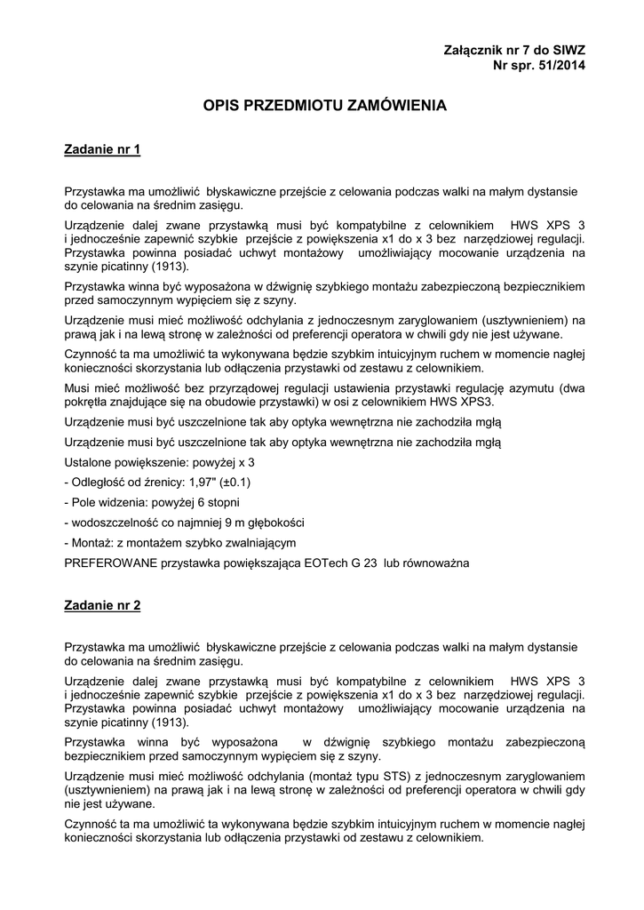 Załącznik nr 7 do SIWZ Nr spr. 51/2014 OPIS PRZEDMIOTU ZAMÓWIENIA Zadanie nr 1 Przystawka ma umożliwić błyskawiczne przejście z celowania podczas walki na małym dystansie do celowania na średnim zasięgu. Urządzenie dalej zwane przystawką musi być kompatybilne z celownikiem HWS XPS 3 i jednocześnie zapewnić szybkie przejście z powiększenia x1 do x 3 bez narzędziowej regulacji. Przystawka powinna posiadać uchwyt montażowy umożliwiający mocowanie urządzenia na szynie picatinny (1913). Przystawka winna być wyposażona w dźwignię szybkiego montażu zabezpieczoną bezpiecznikiem przed samoczynnym wypięciem się z szyny. Urządzenie musi mieć możliwość odchylania z jednoczesnym zaryglowaniem (usztywnieniem) na prawą jak i na lewą stronę w zależności od preferencji operatora w chwili gdy nie jest używane. Czynność ta ma umożliwić ta wykonywana będzie szybkim intuicyjnym ruchem w momencie nagłej konieczności skorzystania lub odłączenia przystawki od zestawu z celownikiem. Musi mieć możliwość bez przyrządowej regulacji ustawienia przystawki regulację azymutu (dwa pokrętła znajdujące się na obudowie przystawki) w osi z celownikiem HWS XPS3. Urządzenie musi być uszczelnione tak aby optyka wewnętrzna nie zachodziła mgłą Urządzenie musi być uszczelnione tak aby optyka wewnętrzna nie zachodziła mgłą Ustalone powiększenie: powyżej x 3 - Odległość od źrenicy: 1,97" (±0.1) - Pole widzenia: powyżej 6 stopni - wodoszczelność co najmniej 9 m głębokości - Montaż: z montażem szybko zwalniającym PREFEROWANE przystawka powiększająca EOTech G 23 lub równoważna Zadanie nr 2 Przystawka ma umożliwić błyskawiczne przejście z celowania podczas walki na małym dystansie do celowania na średnim zasięgu. Urządzenie dalej zwane przystawką musi być kompatybilne z celownikiem HWS XPS 3 i jednocześnie zapewnić szybkie przejście z powiększenia x1 do x 3 bez narzędziowej regulacji. Przystawka powinna posiadać uchwyt montażowy umożliwiający mocowanie urządzenia na szynie picatinny (1913). Przystawka winna być wyposażona w dźwignię szybkiego bezpiecznikiem przed samoczynnym wypięciem się z szyny. montażu zabezpieczoną Urządzenie musi mieć możliwość odchylania (montaż typu STS) z jednoczesnym zaryglowaniem (usztywnieniem) na prawą jak i na lewą stronę w zależności od preferencji operatora w chwili gdy nie jest używane. Czynność ta ma umożliwić ta wykonywana będzie szybkim intuicyjnym ruchem w momencie nagłej konieczności skorzystania lub odłączenia przystawki od zestawu z celownikiem. Musi mieć możliwość bez przyrządowej regulacji ustawienia przystawki regulację azymutu (dwa pokrętła znajdujące się na obudowie przystawki) w osi z celownikiem HWS XPS3. Urządzenie musi być uszczelnione tak aby optyka wewnętrzna nie zachodziła mgłą Ustalone powiększenie: powyżej x 3 - Odległość od źrenicy: 2.2" (±0.1) - Pole widzenia: powyżej 6 stopni - wodoszczelność co najmniej 9 m głębokości - Montaż: Pierścień 34 mm ze z montażem szybko zwalniającym zintegrowanym, ząbkowanym adapterem PREFEROWANE przystawka powiększająca EOTech G 33 STS lub równoważna do użytku