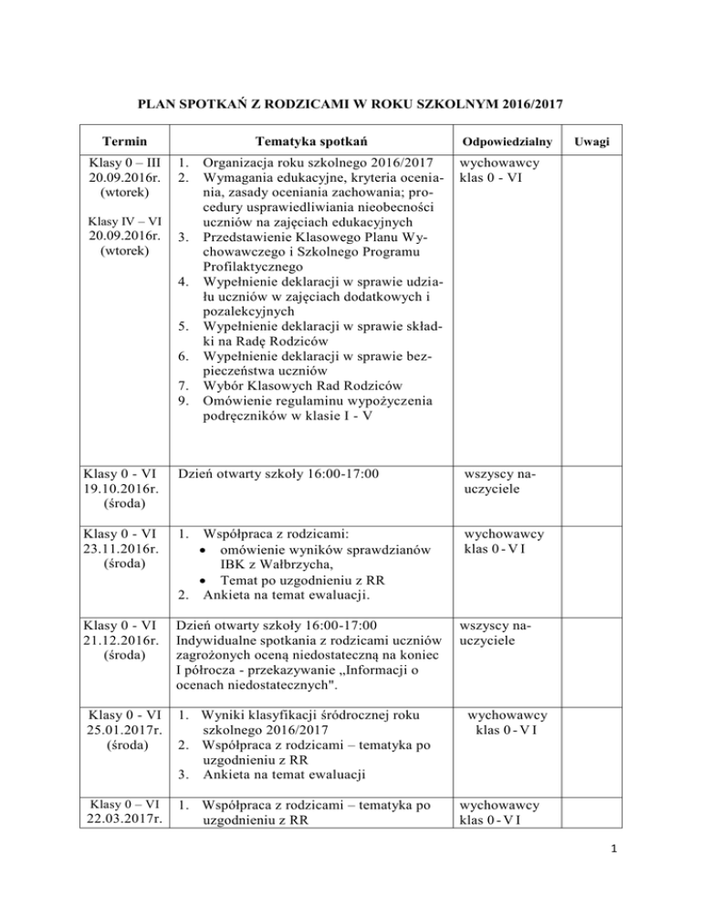 PLAN SPOTKAŃ Z RODZICAMI W ROKU SZKOLNYM 2016/2017 Tematyka spotkań Termin Klasy 0 – III 20.09.2016r. (wtorek) Klasy IV – VI 20.09.2016r. (wtorek) 1. 2. Organizacja roku szkolnego 2016/2017 Wymagania edukacyjne, kryteria oceniania, zasady oceniania zachowania; procedury usprawiedliwiania nieobecności uczniów na zajęciach edukacyjnych 3. Przedstawienie Klasowego Planu Wychowawczego i Szkolnego Programu Profilaktycznego 4. Wypełnienie deklaracji w sprawie udziału uczniów w zajęciach dodatkowych i pozalekcyjnych 5. Wypełnienie deklaracji w sprawie składki na Radę Rodziców 6. Wypełnienie deklaracji w sprawie bezpieczeństwa uczniów 7. Wybór Klasowych Rad Rodziców 9. Omówienie regulaminu wypożyczenia podręczników w klasie I - V Odpowiedzialny wychowawcy klas 0 - VI Klasy 0 - VI 19.10.2016r. (środa) Dzień otwarty szkoły 16:00-17:00 wszyscy nauczyciele Klasy 0 - VI 23.11.2016r. (środa) 1. Współpraca z rodzicami: omówienie wyników sprawdzianów IBK z Wałbrzycha, Temat po uzgodnieniu z RR 2. Ankieta na temat ewaluacji. wychowawcy klas 0 - V I Klasy 0 - VI 21.12.2016r. (środa) Dzień otwarty szkoły 16:00-17:00 Indywidualne spotkania z rodzicami uczniów zagrożonych oceną niedostateczną na koniec I półrocza - przekazywanie „Informacji o ocenach niedostatecznych". Klasy 0 - VI 25.01.2017r. (środa) 1. Wyniki klasyfikacji śródrocznej roku szkolnego 2016/2017 2. Współpraca z rodzicami – tematyka po uzgodnieniu z RR 3. Ankieta na temat ewaluacji Klasy 0 – VI 1. Współpraca z rodzicami – tematyka po uzgodnieniu z RR 22.03.2017r. Uwagi wszyscy nauczyciele wychowawcy klas 0 - V I wychowawcy klas 0 - V I 1 (środa) Klasy 0 - VI 26.04.2017r. (środa) Klasy 0 – VI 17.05.2017r. (środa) 2. Ankieta na temat ewaluacji Dzień otwarty szkoły 16:00-17:00 wszyscy nauczyciele Współpraca z rodzicami-tematyka po uzgodnieniu z RR 2. Omówienie wyników w nauce oraz zachowania uczniów 3. Powiadomienie rodziców o grożących uczniom ocenach niedostatecznych na zakończenie roku szkolnego- przekazanie „Informacji" o ocenach niedostatecznych". 4. Ankieta na temat ewaluacji wychowawcy klas 0-VI 1. wychowawcy klas IV-VI 2