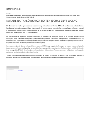 KMP OPOLE Źródło: http://www.opole.policja.gov.pl/opo/kmp-opole/aktualnosci/5615,Napadl-na-taksowkarza-bo-ten-jechal-zbyt-wolno.html Wygenerowano: Środa, 8 marca 2017, 08:48 NAPADŁ NA TAKSÓWKARZA BO TEN JECHAŁ ZBYT WOLNO Na 2 miesiące został tymczasowo aresztowany mieszkaniec Opola. 37-latek zaatakował taksówkarza i próbował zabrać mu saszetkę z pieniędzmi. W zatrzymaniu napastnika pomogli ochroniarze z jednej z podoposkich firm. Zatrzymany był już w przeszłości karany za podobne przestępstwa. Za napad może mu teraz grozić do 15 lat więzienia. Do zdarzenia doszło w połowie listopada kilka minut po godzinie 8:00. Policjanci ustalili, że do taksówki w Opolu wsiadł mężczyzna, który zamówił kurs do jednej z podopolskich miejscowości. Gdy podróż dobiegła końca, pasażer nagle rzucił się na taksówkarza. Napastnik dusił kierowcę i próbował wyrwać mu saszetkę z utargiem. Ten broniąc się zaczął wciskać klakson. Na pomoc przybiegło mu dwóch pracowników z pobliskiej firmy. Na miejsce przyjechali również policjanci, którzy zatrzymali 37-letniego napastnika. Pracujący na miejscu mundurowi ustalili, że zatrzymany mieszkaniec Opola był już wcześniej karany za podobne przestępstwa. Funkcjonariusze ustalili również, że tego samego dnia 37-latek ukradł swojemu koledze kurtkę z dokumentami. Podczas rozmowy z policjantami powiedział, że zaatakował taksówkarza, bo ten...jechał zbyt wolno. 37-latek usłyszał zarzut usiłowania rozboju oraz kradzieży do których się przyznał. W związku z tym, że działał w warunkach recydywy grozi mu do 15 lat więzienia. Sąd na wniosek prokuratora tymczasowo aresztował go na 2 miesiące. Ocena: 0/5 (0) Tweetnij