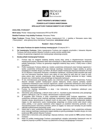 SKRÓT PROSPEKTU INFORMACYJNEGO PIONEER ELASTYCZNEGO INWESTOWANIA SPECJALISTYCZNY FUNDUSZ INWESTYCYJNY OTWARTY zwany dalej „Funduszem” Skrót nazwy: Pioneer Elastycznego Inwestowania SFIO lub PEI SFIO Siedziba Funduszu i kraj siedziby Funduszu: Warszawa, Polska Organ Funduszu: Pioneer Pekao Towarzystwo Funduszy Inwestycyjnych S.A., z siedzibą w Warszawie zwane dalej „Towarzystwem”, adres głównej strony internetowej Towarzystwa: www.pioneer.com.pl Rozdział I - Dane o Funduszu 1. Data wpisu Funduszu do rejestru funduszy inwestycyjnych: 23 sierpnia 2011 r. 2. Cel inwestycyjny Funduszu: Celem inwestycyjnym Funduszu jest osiąganie przychodów z lokowania Aktywów Funduszu oraz wzrost wartości Aktywów Funduszu w wyniku wzrostu wartości lokat. Fundusz nie gwarantuje osiągnięcia celu inwestycyjnego wskazanego powyżej. 3. Zasady polityki inwestycyjnej Funduszu 3.1. 3.2. 3.3. 3.4. 3.5. 3.6. 3.7. 3.8. 3.9. Fundusz dąży do osiągania dodatniej średniej rocznej stopy zwrotu w długoterminowym horyzoncie inwestycyjnym poprzez odpowiedni dobór lokat wchodzących w skład portfela inwestycyjnego oraz elastyczną politykę inwestycyjną. Fundusz nie gwarantuje osiągnięcia dodatniej stopy zwrotu, o której mowa w zdaniu poprzednim. Portfel inwestycyjny Funduszu składa się z tytułów uczestnictwa emitowanych przez fundusze zagraniczne i tytułów uczestnictwa emitowanych przez instytucje wspólnego inwestowania mające siedzibę za granicą posiadających charakter akcyjny czyli takich, dla których polityka inwestycyjna dopuszcza lokowanie nie mniej niż 2/3 aktywów w instrumenty finansowe o charakterze udziałowym, rozumiane przede wszystkim jako akcje oraz inne instrumenty finansowe, których cena zależy od ceny jednej lub wielu akcji (np. prawa do akcji, prawa poboru akcji, warranty subskrypcyjne, kwity depozytowe, kontrakty terminowe na akcje i indeksy akcyjne) oraz z instrumentów rynku pieniężnego lub depozytów bankowych. W celu minimalizowania potencjalnego spadku oraz zmienności wartości Jednostki Uczestnictwa, Fundusz aktywnie zarządza ryzykiem inwestycyjnym poprzez elastyczną zmianę proporcji pomiędzy tytułami uczestnictwa emitowanymi przez fundusze zagraniczne, tytułami uczestnictwa emitowanymi przez instytucje wspólnego inwestowania mające siedzibę za granicą posiadające charakter akcyjny oraz instrumentami rynku pieniężnego i depozytami bankowymi. Fundusz nie inwestuje bezpośrednio w akcje i inne instrumenty o charakterze udziałowym poza wymienionymi w pkt 3.2. Instrumenty rynku pieniężnego, o których mowa w pkt 3.2., rozumiane są jako instrumenty rynku pieniężnego zgodnie z definicją art. 2 pkt. 21) Ustawy i denominowane w walucie polskiej. W przypadku lokat Funduszu w tytuły uczestnictwa emitowane przez fundusze zagraniczne i tytuły uczestnictwa emitowane przez instytucje wspólnego inwestowania mające siedzibę za granicą posiadające charakter akcyjny denominowane w walutach innych niż złoty polski, Fundusz może podejmować działania mające na celu ograniczanie ryzyka inwestycyjnego związanego ze zmianą kursów walut obcych wobec waluty polskiej, w tym poprzez zawieranie umów mających za przedmiot instrumenty pochodne, w tym niewystandaryzowane instrumenty pochodne, jednak ze względu na naturę tych transakcji nie jest możliwe całkowite wyeliminowanie powyższego ryzyka. Udział lokat w tytuły uczestnictwa emitowane przez fundusze zagraniczne i tytuły uczestnictwa emitowane przez instytucje wspólnego inwestowania mające siedzibę za granicą posiadające charakter akcyjny nie może przekroczyć 50% wartości Aktywów Funduszu. Udział lokat w instrumenty rynku pieniężnego i depozyty bankowe, może wynieść do 100% wartości Aktywów Funduszu. Dobór do portfela inwestycyjnego Funduszu poszczególnych rodzajów instrumentów finansowych oraz ich wzajemne proporcje w portfelu Funduszu są uzależnione od decyzji zarządzającego Funduszem. 1 3.10. Dobór do portfela inwestycyjnego Funduszu tytułów uczestnictwa emitowanych przez fundusze zagraniczne i tytułów uczestnictwa emitowanych przez instytucje wspólnego inwestowania mających siedzibę za granicą posiadających charakter akcyjny, dokonywany jest z uwzględnieniem następujących czynników: a) warunków ekonomicznych w poszczególnych regionach świata i sytuacji na rynkach instrumentów finansowych z tych regionów, b) oceny potencjału wzrostu gospodarczego w poszczególnych regionach świata oraz krajach znajdujących się w tych regionach, c) oceny potencjału wzrostu wartości lokat Funduszu dających ekspozycję na rynki akcji z poszczególnych regionów świata, d) oceny płynności i bezpieczeństwa, e) celu inwestycyjnego, f) zasad dywersyfikacji określonych w pkt 3.7. 3.11. Dobór do portfela inwestycyjnego Funduszu instrumentów rynku pieniężnego i depozytów bankowych, dokonywany jest z uwzględnieniem następujących czynników: a) ryzyka stopy procentowej, b) ryzyka płynności danego instrumentu finansowego, c) ryzyka związanego z wypłacalnością emitentów tych instrumentów, d) celu inwestycyjnego, e) zasad dywersyfikacji określonych w pkt 3.8. Fundusz może lokować do 100% wartości Aktywów Funduszu w papiery wartościowe emitowane, poręczone lub gwarantowane przez dowolny z następujących podmiotów: Skarb Państwa lub Narodowy Bank Polski. Na zasadach określonych w Statucie Fundusz może zawierać umowy mające za przedmiot instrumenty pochodne, w tym niewystandaryzowane instrumenty pochodne, wyłącznie w celu ograniczenia ryzyka inwestycyjnego. 4. Wartość Jednostki Uczestnictwa w momencie jej zbycia i odkupienia przez Fundusz zależy od wartości Aktywów Funduszu i jego zobowiązań. Oznacza to, że Uczestnik może, w wyniku odkupienia Jednostek Uczestnictwa, otrzymać mniejszą kwotę niż kwota, którą wpłacił do Funduszu. 5. Ryzyko inwestycyjne związane z przyjętą polityką inwestycyjną lub strategią za