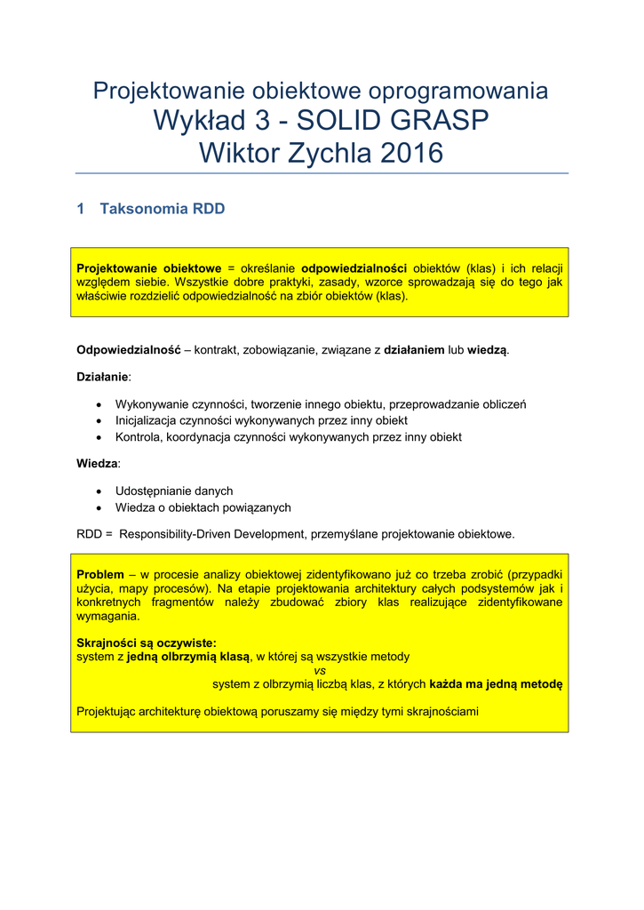 Wykład 3 - SOLID GRASP Wiktor Zychla 2016