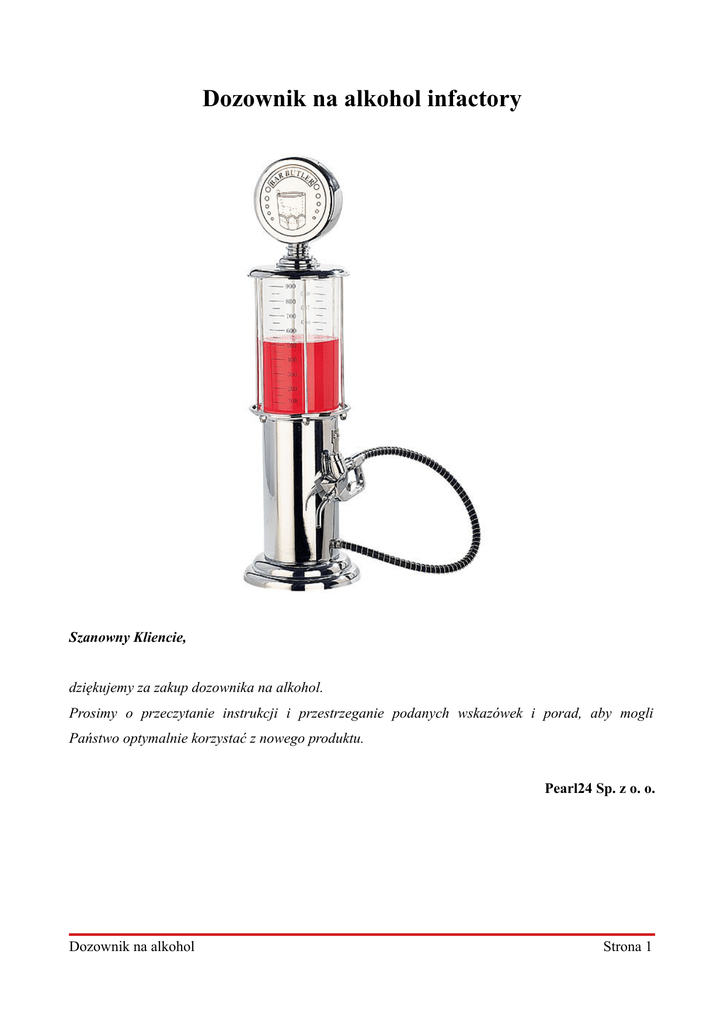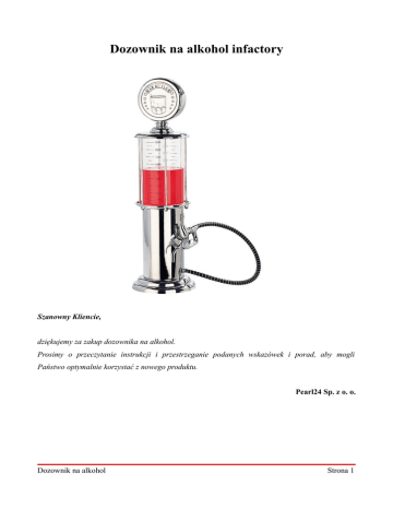 Dozownik na alkohol infactory Szanowny Kliencie, dziękujemy za zakup dozownika na alkohol. Prosimy o przeczytanie instrukcji i przestrzeganie podanych wskazówek i porad, aby mogli Państwo optymalnie korzystać z nowego produktu. Pearl24 Sp. z o. o. Dozownik na alkohol Strona 1 Zawartość zestawu: • Dozownik • Instrukcja obsługi. Przygotowanie Przed pierwszym użyciem należy wyczyścić produkt, poprzez wypełnienie go ciepłą wodą, a następnie naciśnięcie dźwigni. Zbiornik należy przetrzeć miękką ściereczką. Użytkowanie 1. Najpierw należy zdjąć górną nasadkę. 2. Należy napełnić zbiornik alkoholem. 3. Na górze należy ponownie umieścić nasadkę. Teraz można wlać alkohol do szklanek wkładając wąż do szklanki i naciskając dźwignię. Czyszczenie Aby zapewnić optymalną wydajność, należy regularnie czyścić dozownik. Dozownik należy wyczyścić w ciepłej wodzie (w razie potrzeby można dodać łagodnego środka do mycia). Następnie należy dokładnie przepłukać czystą wodą. Dozownika nie można myć w zmywarce. Nie należy używać agresywnych środków czyszczących. Dozownik na alkohol Strona 2 WAŻNE WSKAZÓWKI • Dozownik przeznaczony jest wyłącznie dla płynnych alkoholi (nie likierów). Zawartość alkoholu nie powinna przekraczać 60%. • Nie należy napełniać dozownika gęstymi lub gorącymi napojami. Bezpieczeństwo • Niniejsza instrukcja ma na celu zapoznanie Państwa z zasadami prawidłowego korzystania z produktu. Zaleca się przechowywanie instrukcji w łatwo dostępnym miejscu, aby w razie potrzeby mogli Państwo zweryfikować informacje. • Wszelkie modyfikacje produktu obniżają poziom jego bezpieczeństwa. UWAGA! Istnieje ryzyko obrażeń! • Nie należy rozkładać ani naprawiać urządzenia samodzielnie! • Zaleca się ostrożne obchodzenie się z produktem. Produkt może ulec uszkodzeniu w wyniku uderzenia, wstrząsów lub upadku nawet z niewielkiej wysokości. • Produkt należy trzymać z dala od wysokiej temperatury. • Wszelkie prawa do wprowadzania zmian technicznych oraz eliminacji błędów są zastrzeżone. Dozownik na alkohol Strona 3