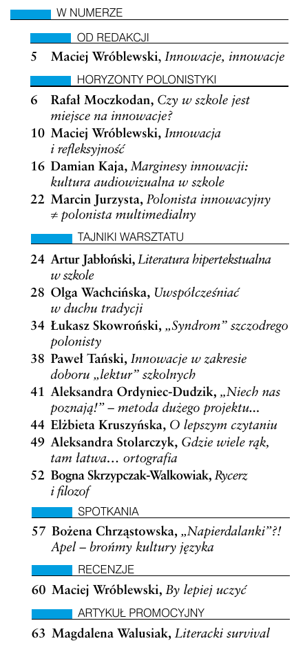 W NUMERZE OD REDAKCJI 5 Maciej Wróblewski, Innowacje, innowacje HORYZONTY POLONISTYKI 6 Rafał Moczkodan, Czy w szkole jest miejsce na innowacje? 10 Maciej Wróblewski, Innowacja i refleksyjność 16 Damian Kaja, Marginesy innowacji: kultura audiowizualna w szkole 22 Marcin Jurzysta, Polonista innowacyjny ≠ polonista multimedialny TAJNIKI WARSZTATU 24 Artur Jabłoński, Literatura hipertekstualna w szkole 28 Olga Wachcińska, Uwspółcześniać w duchu tradycji 34 Łukasz Skowroński, „Syndrom” szczodrego polonisty 38 Paweł Tański, Innowacje w zakresie doboru „lektur” szkolnych 41 Aleksandra Ordyniec-Dudzik, „Niech nas poznają!” – metoda dużego projektu... 44 Elżbieta Kruszyńska, O lepszym czytaniu 49 Aleksandra Stolarczyk, Gdzie wiele rąk, tam łatwa… ortografia 52 Bogna Skrzypczak-Walkowiak, Rycerz i filozof SPOTKANIA 57 Bożena Chrząstowska, „Napierdalanki”?! Apel – brońmy kultury języka RECENZJE 60 Maciej Wróblewski, By lepiej uczyć ARTYKUŁ PROMOCYJNY 63 Magdalena Walusiak, Literacki survival