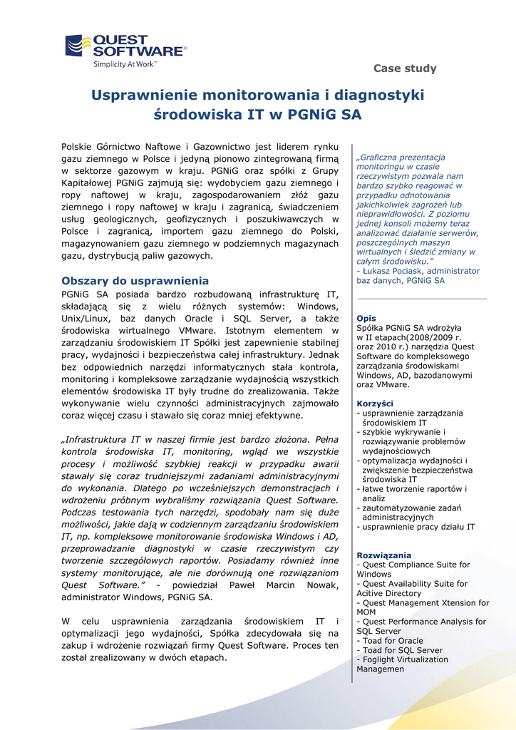 Case study Usprawnienie monitorowania i diagnostyki środowiska IT w PGNiG SA Polskie Górnictwo Naftowe i Gazownictwo jest liderem rynku gazu ziemnego w Polsce i jedyną pionowo zintegrowaną firmą w sektorze gazowym w kraju. PGNiG oraz spółki z Grupy Kapitałowej PGNiG zajmują się: wydobyciem gazu ziemnego i ropy naftowej w kraju, zagospodarowaniem złóż gazu ziemnego i ropy naftowej w kraju i zagranicą, świadczeniem usług geologicznych, geofizycznych i poszukiwawczych w Polsce i zagranicą, importem gazu ziemnego do Polski, magazynowaniem gazu ziemnego w podziemnych magazynach gazu, dystrybucją paliw gazowych. Obszary do usprawnienia PGNiG SA posiada bardzo rozbudowaną infrastrukturę IT, składającą się z wielu różnych systemów: Windows, Unix/Linux, baz danych Oracle i SQL Server, a także środowiska wirtualnego VMware. Istotnym elementem w zarządzaniu środowiskiem IT Spółki jest zapewnienie stabilnej pracy, wydajności i bezpieczeństwa całej infrastruktury. Jednak bez odpowiednich narzędzi informatycznych stała kontrola, monitoring i kompleksowe zarządzanie wydajnością wszystkich elementów środowiska IT były trudne do zrealizowania. Także wykonywanie wielu czynności administracyjnych zajmowało coraz więcej czasu i stawało się coraz mniej efektywne. „Infrastruktura IT w naszej firmie jest bardzo złożona. Pełna kontrola środowiska IT, monitoring, wgląd we wszystkie procesy i możliwość szybkiej reakcji w przypadku awarii stawały się coraz trudniejszymi zadaniami administracyjnymi do wykonania. Dlatego po wcześniejszych demonstracjach i wdrożeniu próbnym wybraliśmy rozwiązania Quest Software. Podczas testowania tych narzędzi, spodobały nam się duże możliwości, jakie dają w codziennym zarządzaniu środowiskiem IT, np. kompleksowe monitorowanie środowiska Windows i AD, przeprowadzanie diagnostyki w czasie rzeczywistym czy tworzenie szczegółowych raportów. Posiadamy również inne systemy monitorujące, ale nie dorównują one rozwiązaniom Quest Software.” - powiedział Paweł Marcin Nowak, administrator Windows, PGNiG SA. W celu usprawnienia zarządzania środowiskiem IT i optymalizacji jego wydajności, Spółka zdecydowała się na zakup i wdrożenie rozwiązań firmy Quest Software. Proces ten został zrealizowany w dwóch etapach. „Graficzna prezentacja monitoringu w czasie rzeczywistym pozwala nam bardzo szybko reagować w przypadku odnotowania jakichkolwiek zagrożeń lub nieprawidłowości. Z poziomu jednej konsoli możemy teraz analizować działanie serwerów, poszczególnych maszyn wirtualnych i śledzić zmiany w całym środowisku.” - Łukasz Pociask, administrator baz danych, PGNiG SA Opis Spółka PGNiG SA wdrożyła w II etapach(2008/2009 r. oraz 2010 r.) narzędzia Quest Software do kompleksowego zarządzania środowiskami Windows, AD, bazodanowymi oraz VMware. Korzyści - usprawnienie zarządzania środowiskiem IT - szybkie wykrywanie i rozwiązywanie problemów wydajnościowych - optymalizacja wydajności i zwiększenie bezpieczeństwa środowiska IT - łatwe tworzenie raportów i analiz - zautomatyzowanie zadań administracyjnych - usprawnienie pracy działu IT Rozwiązania - Quest Compliance Suite for Windows - Quest Availability Suite for Acitive Directory - Quest Management Xtension for MOM - Quest Performance Analysis for SQL Server - Toad for Oracle - Toad for SQL Server - Foglight Virtualization Managemen Case study Rozwiązania Quest Software Etap I Na przełomie 2008 i 2009 r. Polskie Górnictwo Naftowe i Gazownictwo SA zakupiło i wdrożyło dwa pakiety narzędzi informatycznych Quest Software przeznaczone do kompleksowego zarządzania środowiskiem Windows i Active Directory: Quest Compliance Suite for Windows (pakiet zawierający oprogramowanie Quest InTrust, Quest Reporter oraz Quest ChangeAuditor for Active Directory) do zbierania w trybie rzeczywistym szczegółowych informacji o infrastrukturze Windows i AD oraz Quest Availability Suite for Acitive Directory (pakiet dwóch narzędzi: Quest Spotlight on AD oraz Quest Recovery Manager for AD) do przeprowadzania w czasie rzeczywistym szczegółowej diagnostyki środowiska AD oraz backupu i zarządzania odzyskiwaniem danych AD. W celu rozszerzenia funkcjonalności o monitorowanie oraz proaktywne rozwiązywanie problemów występujących także w systemach nie-Windowsowych (Unix/Linux), Spółka zakupiła także Quest Management Xtension for MOM (Microsoft Operations Manager). „Wdrożone narzędzia są bardzo przydatne do monitorowania środowiska IT i wykonywania zadań administracyjnych. Są bardzo funkcjonalne - pozwalają odzyskiwać nawet pojedyncze elementy AD, a takiej funkcji nie oferuje nawet Microsoft. Poza tym przy ich pomocy można szybko naprawić i odzyskać zmienioną konfigurację, dane AD czy ustawienia DNS. Rozwiązania Quest Software uprościły i przyspieszyły tworzenie raportów, które mają bardzo praktyczną funkcję umożliwiającą nam wykonywanie wybranych czynności administracyjnych bezpośrednio z poziomu raportu.” - powiedział Paweł Marcin Nowak, administrator Windows, PGNiG SA. Istotny element infrastruktury IT w PGNiG SA stanowią także środowiska bazodanowe. Dlatego Spółka wdrożyła również narzędzia Quest Software usprawniające wykonywanie analiz i codziennych zadań administracyjnych w środowisku Oracle i SQL Server oraz do tworzenia i rozwoju aplikacji bazodanowych. Rozwiązania wdrożone w PGNiG to: Quest Performance Analysis for SQL Server do przeprowadzania szczegółowych analiz wydajności i kondycji bazy danych SQL Server oraz Toad for Oracle i Toad for SQL Server do zautomatyzowania czynności administracyjnych oraz zarządzania wydajnością środowiska Oracle i SQL Server. „Do wyboru i zakupu kolejnych narzędzi Quest Software przekonało nas to, że rozwiązania dla Windows i AD świetnie się u nas sprawdzają, a brakowało nam narzędzi do monitorowania środowiska bazo