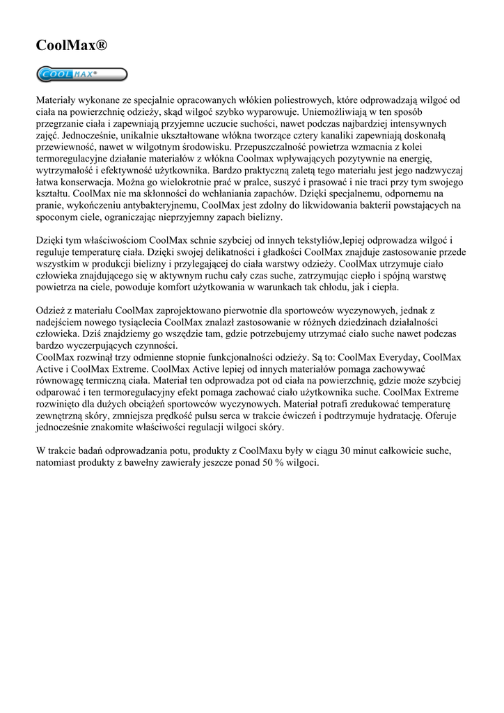 CoolMax® Materiały wykonane ze specjalnie opracowanych włókien poliestrowych, które odprowadzają wilgoć od ciała na powierzchnię odzieży, skąd wilgoć szybko wyparowuje. Uniemożliwiają w ten sposób przegrzanie ciała i zapewniają przyjemne uczucie suchości, nawet podczas najbardziej intensywnych zajęć. Jednocześnie, unikalnie ukształtowane włókna tworzące cztery kanaliki zapewniają doskonałą przewiewność, nawet w wilgotnym środowisku. Przepuszczalność powietrza wzmacnia z kolei termoregulacyjne działanie materiałów z włókna Coolmax wpływających pozytywnie na energię, wytrzymałość i efektywność użytkownika. Bardzo praktyczną zaletą tego materiału jest jego nadzwyczaj łatwa konserwacja. Można go wielokrotnie prać w pralce, suszyć i prasować i nie traci przy tym swojego kształtu. CoolMax nie ma skłonności do wchłaniania zapachów. Dzięki specjalnemu, odpornemu na pranie, wykończeniu antybakteryjnemu, CoolMax jest zdolny do likwidowania bakterii powstających na spoconym ciele, ograniczając nieprzyjemny zapach bielizny. Dzięki tym właściwościom CoolMax schnie szybciej od innych tekstyliów,lepiej odprowadza wilgoć i reguluje temperaturę ciała. Dzięki swojej delikatności i gładkości CoolMax znajduje zastosowanie przede wszystkim w produkcji bielizny i przylegającej do ciała warstwy odzieży. CoolMax utrzymuje ciało człowieka znajdującego się w aktywnym ruchu cały czas suche, zatrzymując ciepło i spójną warstwę powietrza na ciele, powoduje komfort użytkowania w warunkach tak chłodu, jak i ciepła. Odzież z materiału CoolMax zaprojektowano pierwotnie dla sportowców wyczynowych, jednak z nadejściem nowego tysiąclecia CoolMax znalazł zastosowanie w różnych dziedzinach działalności człowieka. Dziś znajdziemy go wszędzie tam, gdzie potrzebujemy utrzymać ciało suche nawet podczas bardzo wyczerpujących czynności. CoolMax rozwinął trzy odmienne stopnie funkcjonalności odzieży. Są to: CoolMax Everyday, CoolMax Active i CoolMax Extreme. CoolMax Active lepiej od innych materiałów pomaga zachowywać równowagę termiczną ciała. Materiał ten odprowadza pot od ciała na powierzchnię, gdzie może szybciej odparować i ten termoregulacyjny efekt pomaga zachować ciało użytkownika suche. CoolMax Extreme rozwinięto dla dużych obciążeń sportowców wyczynowych. Materiał potrafi zredukować temperaturę zewnętrzną skóry, zmniejsza prędkość pulsu serca w trakcie ćwiczeń i podtrzymuje hydratację. Oferuje jednocześnie znakomite właściwości regulacji wilgoci skóry. W trakcie badań odprowadzania potu, produkty z CoolMaxu były w ciągu 30 minut całkowicie suche, natomiast produkty z bawełny zawierały jeszcze ponad 50 % wilgoci.
