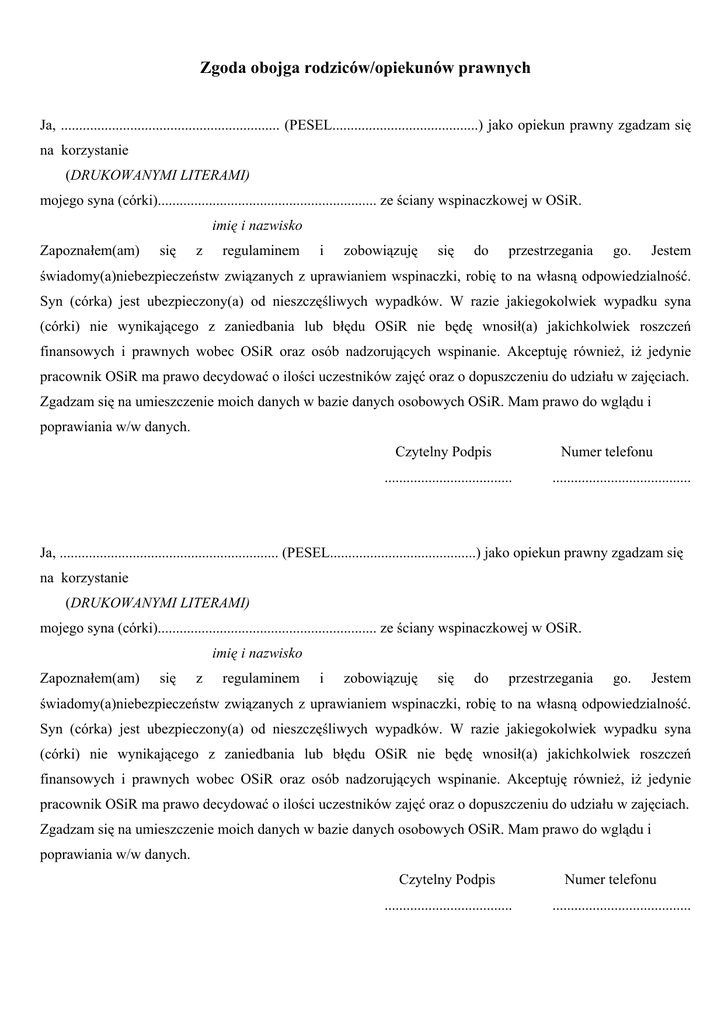 Zgoda obojga rodziców/opiekunów prawnych Ja, ............................................................ (PESEL........................................) jako opiekun prawny zgadzam się na korzystanie (DRUKOWANYMI LITERAMI) mojego syna (córki)............................................................ ze ściany wspinaczkowej w OSiR. imię i nazwisko Zapoznałem(am) się z regulaminem i zobowiązuję się do przestrzegania go. Jestem świadomy(a)niebezpieczeństw związanych z uprawianiem wspinaczki, robię to na własną odpowiedzialność. Syn (córka) jest ubezpieczony(a) od nieszczęśliwych wypadków. W razie jakiegokolwiek wypadku syna (córki) nie wynikającego z zaniedbania lub błędu OSiR nie będę wnosił(a) jakichkolwiek roszczeń finansowych i prawnych wobec OSiR oraz osób nadzorujących wspinanie. Akceptuję również, iż jedynie pracownik OSiR ma prawo decydować o ilości uczestników zajęć oraz o dopuszczeniu do udziału w zajęciach. Zgadzam się na umieszczenie moich danych w bazie danych osobowych OSiR. Mam prawo do wglądu i poprawiania w/w danych. Czytelny Podpis Numer telefonu ................................... ...................................... Ja, ............................................................ (PESEL........................................) jako opiekun prawny zgadzam się na korzystanie (DRUKOWANYMI LITERAMI) mojego syna (córki)............................................................ ze ściany wspinaczkowej w OSiR. imię i nazwisko Zapoznałem(am) się z regulaminem i zobowiązuję się do przestrzegania go. Jestem świadomy(a)niebezpieczeństw związanych z uprawianiem wspinaczki, robię to na własną odpowiedzialność. Syn (córka) jest ubezpieczony(a) od nieszczęśliwych wypadków. W razie jakiegokolwiek wypadku syna (córki) nie wynikającego z zaniedbania lub błędu OSiR nie będę wnosił(a) jakichkolwiek roszczeń finansowych i prawnych wobec OSiR oraz osób nadzorujących wspinanie. Akceptuję również, iż jedynie pracownik OSiR ma prawo decydować o ilości uczestników zajęć oraz o dopuszczeniu do udziału w zajęciach. Zgadzam się na umieszczenie moich danych w bazie danych osobowych OSiR. Mam prawo do wglądu i poprawiania w/w danych. Czytelny Podpis ................................... Numer telefonu ......................................