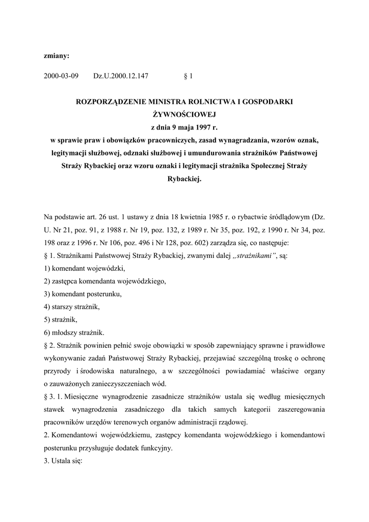 zmiany: 2000-03-09 Dz.U.2000.12.147 §1 ROZPORZĄDZENIE MINISTRA ROLNICTWA I GOSPODARKI śYWNOŚCIOWEJ z dnia 9 maja 1997 r. w sprawie praw i obowiązków pracowniczych, zasad wynagradzania, wzorów oznak, legitymacji słuŜbowej, odznaki słuŜbowej i umundurowania straŜników Państwowej StraŜy Rybackiej oraz wzoru oznaki i legitymacji straŜnika Społecznej StraŜy Rybackiej. Na podstawie art. 26 ust. 1 ustawy z dnia 18 kwietnia 1985 r. o rybactwie śródlądowym (Dz. U. Nr 21, poz. 91, z 1988 r. Nr 19, poz. 132, z 1989 r. Nr 35, poz. 192, z 1990 r. Nr 34, poz. 198 oraz z 1996 r. Nr 106, poz. 496 i Nr 128, poz. 602) zarządza się, co następuje: § 1. StraŜnikami Państwowej StraŜy Rybackiej, zwanymi dalej „straŜnikami”, są: 1) komendant wojewódzki, 2) zastępca komendanta wojewódzkiego, 3) komendant posterunku, 4) starszy straŜnik, 5) straŜnik, 6) młodszy straŜnik. § 2. StraŜnik powinien pełnić swoje obowiązki w sposób zapewniający sprawne i prawidłowe wykonywanie zadań Państwowej StraŜy Rybackiej, przejawiać szczególną troskę o ochronę przyrody i środowiska naturalnego, a w szczególności powiadamiać właściwe organy o zauwaŜonych zanieczyszczeniach wód. § 3. 1. Miesięczne wynagrodzenie zasadnicze straŜników ustala się według miesięcznych stawek wynagrodzenia zasadniczego dla takich samych kategorii zaszeregowania pracowników urzędów terenowych organów administracji rządowej. 2. Komendantowi wojewódzkiemu, zastępcy komendanta wojewódzkiego i komendantowi posterunku przysługuje dodatek funkcyjny. 3. Ustala się: 1) tabelę stanowisk, zaszeregowań i wymagań kwalifikacyjnych straŜników, stanowiącą załącznik nr 1 do rozporządzenia, 2) tabelę stawek dodatku funkcyjnego, określonych w relacji procentowej do najniŜszego miesięcznego wynagrodzenia zasadniczego w I kategorii zaszeregowania pracowników urzędów terenowych organów administracji rządowej, stanowiącą załącznik nr 2 do rozporządzenia. § 4. 1. StraŜnikowi moŜe być przyznany dodatek za uŜywanie własnego samochodu osobowego, motocykla lub motoroweru do celów słuŜbowych według zasad określonych przepisami szczególnymi. 2. StraŜnikowi pełniącemu w czasie wykonywania czynności słuŜbowych dodatkowo funkcję motorzysty łodzi motorowej przysługuje dodatek w wysokości do 10% miesięcznego wynagrodzenia zasadniczego. 3. StraŜnikowi pełniącemu w czasie wykonywania czynności słuŜbowych dodatkowo funkcję kierowcy samochodu słuŜbowego przysługuje dodatek w wysokości do 10% miesięcznego wynagrodzenia zasadniczego. 4. StraŜnikowi, któremu powierzono przewodnictwo psa słuŜbowego, przysługuje dodatek w wysokości do 5% miesięcznego wynagrodzenia zasadniczego. § 5. W ramach posiadanych środków na wynagrodzenia tworzy się fundusz premiowy; wysokość funduszu premiowego oraz zasady przyznawania premii określa zakładowy regulamin premiowania. § 6. 1. Tworzy się fundusz nagród, z przeznaczeniem na nagrody za szczególne osiągnięcia w pracy zawodowej, w wysokości 3% planowanych wynagrodzeń osobowych. 2. Fundusz nagród, o którym mowa w ust. 1, moŜe być podwyŜszany w ramach posiadanych środków na wynagrodzenia. § 7. 1. Do okresów pracy uprawniających do dodatku za wieloletnią pracę, określonego w art. 22 ust. 1 ustawy z dnia 16 września 1982 r. o pracownikach urzędów państwowych (Dz. U. Nr 31, poz. 214, z 1984 r. Nr 35, poz. 187, z 1988 r. Nr 19, poz. 132, z 1989 r. Nr 4, poz. 24, Nr 34, poz. 178 i 182, z 1990 r. Nr 20, poz. 121, z 1991 r. Nr 55, poz. 234, Nr 88, poz. 400 i Nr 95, poz. 425, z 1992 r. Nr 54, poz. 254 i Nr 90, poz. 451, z 1994 r. Nr 136, poz. 704, z 1995 r. Nr 132, poz. 640 oraz z 1996 r. Nr 89, poz. 402 i Nr 106, poz. 496), zwanej dalej „ustawą”, wlicza się wszystkie poprzednie zakończone okresy zatrudnienia, z zastrzeŜeniem ust. 3. 2. Do okresów pracy uprawniających do dodatku za wieloletnią pracę wlicza się takŜe inne okresy, jeŜeli z mocy odrębnych przepisów podlegają one wliczeniu do okresu pracy, od którego zaleŜą uprawnienia pracownicze. 3. W wypadku gdy praca w Państwowej StraŜy Rybackiej stanowi dodatkowe zatrudnienie, prawo do dodatku za wieloletnią pracę ustala się odrębnie dla kaŜdego stosunku pracy; do okresu dodatkowego zatrudnienia nie podlegają zaliczeniu okresy zatrudnienia podstawowego. 4. Dodatek za wieloletnią pracę przysługuje straŜnikowi za dni, za które otrzymuje wynagrodzenie, oraz za dni nieobecności w pracy z powodu niezdolności do pracy wskutek choroby bądź konieczności osobistego sprawowania opieki nad dzieckiem lub chorym członkiem rodziny, za które straŜnik otrzymuje z tego tytułu wynagrodzenie lub zasiłek z ubezpieczenia społecznego. 5. Dodatek za wieloletnią pracę jest wypłacany w terminie wypłaty wynagrodzenia: 1) począwszy od pierwszego dnia miesiąca następującego po miesiącu, w którym straŜnik nabył prawo do dodatku lub wyŜszej stawki dodatku, jeŜeli nabycie prawa nastąpiło w ciągu miesiąca, 2) za dany miesiąc, jeŜeli nabycie prawa do dodatku lub wyŜszej stawki dodatku nastąpiło pierwszego dnia miesiąca. § 8. 1. Do okresu pracy uprawniającego do nagrody jubileuszowej, określonej w art. 23 ust. 1 ustawy, wlicza się wszystkie poprzednie zakończone okresy zatrudnienia oraz inne okresy, jeŜeli z mocy odrębnych przepisów podlegają one wliczeniu do okresu pracy, od którego zaleŜą uprawnienia pracownicze. 2. W razie równoczesnego pozostawania więcej niŜ w jednym stosunku pracy, do okresu pracy uprawniającego do nagrody jubileuszowej wlicza się jeden z tych okresów. 3. StraŜnik nabywa prawo do nagrody jubileuszowej w dniu upływu okresu uprawniającego do tej nagrody. 4. StraŜnik jest obowiązany udokumentować swoje prawo do nagrody jubileuszowej, jeŜeli w jego aktach osobowych brak jest odpowiedniej dokumentacji. 5. Wypłata nagrody jubileuszowej powinna nastąpić niezwłocznie p