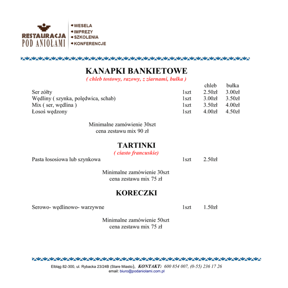 KANAPKI BANKIETOWE ( chleb tostowy, razowy, z ziarnami, bułka ) Ser zółty Wędliny ( szynka, polędwica, schab) Mix ( ser, wędlina ) Łosoś wędzony 1szt 1szt 1szt 1szt chleb 2.50zł 3.00zł 3.50zł 4.00zł 1szt 2.50zł 1szt 1.50zł Minimalne zamówienie 30szt cena zestawu mix 90 zł TARTINKI ( ciasto francuskie) Pasta łososiowa lub szynkowa Minimalne zamówienie 30szt cena zestawu mix 75 zł KORECZKI Serowo- wędlinowo- warzywne Minimalne zamówienie 50szt cena zestawu mix 75 zł Elbląg 82-300, ul. Rybacka 23/24B (Stare Miasto), KONTAKT: 600 email: [email protected] 854 007, (0-55) 236 17 26 bułka 3.00zł 3.50zł 4.00zł 4.50zł