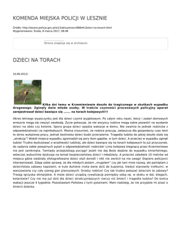 KOMENDA MIEJSKA POLICJI W LESZNIE Źródło: http://leszno.policja.gov.pl/w13/aktualnosci/68644,Dzieci-na-torach.html Wygenerowano: Środa, 8 marca 2017, 08:48 Strona znajduje się w archiwum. DZIECI NA TORACH 10.08.2012r. Kilka dni temu w Krzemieniewie doszło do tragicznego w skutkach wypadku drogowego. Zginęły dwie młode osoby. W trakcie czynności procesowych policyjny aparat zarejestrował dzieci bawiące się ….... na torach kolejowych!!! Okres letniego wypoczynku jest dla dzieci czymś wyjątkowym. Po całym roku nauki, lekcji i zadań domowych wreszcie mogą się cieszyć swobodą. Życie pokazuje, że nie wszyscy rodzice mogą sobie pozwolić na wysłanie dzieci na obóz czy kolonie. Spora grupa dzieci spędza wakacje w domu. Nie zwalnia to jednak rodziców z odpowiedzialności za najmłodszych. Można zrozumieć, że rodzice pracują, zwłaszcza dla gospodarzy czas letni to okres wytężonej pracy, jednak beztroska dzieci budzi przerażenie. Tragedia ludzka do jakiej doszło stała się „atrakcją”! Wokół miejsca wypadku zgromadził się pory tłum gapiów, w tym dzieci. A przecież w wypadku zginęli ludzie! Trudno dyskutować o wrażliwości ludzkiej, ale dzieci bawiące się na torach kolejowych to już przyczynek, do zadania sobie poważnych pytań o odpowiedzialność rodziców! Linia kolejowa biegnąca przez Krzemieniewo nie jest zamknięta. Tamtędy przejeżdżają pociągi! Jeżeli nie daj Boże dojdzie do wypadku śmiertelnego, wówczas wybuchnie dyskusja na temat bezpieczeństwa dzieci i młodzieży. A przecież zaledwie 10 metrów od miejsca gdzie siedziały sfotografowane dzieci stali dorośli i nikt nie zwrócił na nie uwagi! Dopiero policjanci interweniowali. Zdaję sobie sprawę, że dla młodych jestem „mugolem” czy jak tam mnie nazwą, ale pamiętam z dzieciństwa zabawy kapslami, w kule duńskie (nota bene dziś do kupienia, kiedyś stanowiły trofeum), w warszawianę czy cały szereg gier planszowych. Drodzy rodzice! Czy tak trudno pokazać dzieciom te zabawy? Trwają igrzyska olimpijskie. A może dzieci urządzą rywalizację pomiędzy sobą np. w skoku w dal, biegach, kolarstwie? Czy nie ma już dziś dla dzieci atrakcyjniejszych rzeczy niż śmierć i tragedia ludzka? Do końca wakacji jeszcze 4 tygodnie. Pozostawiam Państwa z tymi pytaniami. Mam nadzieję, że nie przyjdzie mi pisać o śmierci dziecka. Ocena: 0/5 (0) Tweetnij