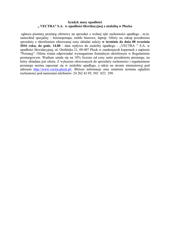 Syndyk masy upadłości „ VECTRA” S.A. w upadłości likwidacyjnej z siedzibą w Płocku ogłasza pisemny przetarg ofertowy na sprzedaż z wolnej ręki ruchomości upadłego , m.in. samochód specjalny - betonopompa, meble biurowe, laptop. Oferty na zakup przedmiotu sprzedaży z określeniem oferowanej ceny składać należy w terminie do dnia 08 września 2016 roku, do godz. 14.00 - data wpływu do siedziby upadłego - „VECTRA ” S.A. w upadłości likwidacyjnej, ul. Otolińska 21, 09-407 Płock w zamkniętych kopertach z napisem "Przetarg”. Oferta winna odpowiadać wymaganiom formalnym określonym w Regulaminie przetargowym. Wadium ustala się na 10% liczone od ceny netto przedmiotu przetargu, na który składana jest oferta. Z wykazem oferowanych do sprzedaży ruchomości i regulaminem przetargu można zapoznać się w siedzibie upadłego, a także na stronie internetowej pod adresem http://www.vectra-plock.pl/. Bliższe informacje oraz ustalenie terminu oględzin ruchomości pod numerami telefonów: 24 262 43 95; 502 022 290.