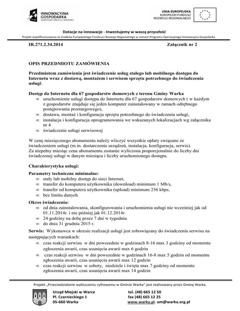 Projekt Dotacje na innowacje - Inwestujemy w waszą przyszłość Projekt współfinansowany ze środków Europejskiego Funduszu Rozwoju Regionalnego w ramach Programu Operacyjnego Innowacyjna Gospodarka IR.271.2.34.2014 Załącznik nr 2 OPIS PRZEDMIOTU ZAMÓWIENIA Przedmiotem zamówienia jest świadczenie usług stałego lub mobilnego dostępu do Internetu wraz z dostawą, montażem i serwisem sprzętu potrzebnego do świadczenia usługi: Dostęp do Internetu dla 67 gospodarstw domowych z terenu Gminy Warka • uruchomienie usługi dostępu do Internetu dla 67 gospodarstw domowych ( w każdym z gospodarstw znajduje się jeden komputer zainstalowany w ramach odrębnego postępowania przetargowego), • dostawa, montaż i konfiguracja sprzętu potrzebnego do świadczenia usługi, • instalacja i konfiguracja oprogramowania we wskazanych lokalizacjach wg załącznika nr 4 • świadczenie usługi serwisowej W cenę miesięcznego abonamentu należy wliczyć wszystkie opłaty związane ze świadczeniem usługi (m.in. dostarczenie urządzeń, instalacja, konfiguracja, serwis). Za niepełny miesiąc cena abonamentu zostanie wyliczona proporcjonalnie do liczby dni świadczonej usługi w danym miesiącu i liczby uruchomionego dostępu. Charakterystyka usługi: Parametry techniczne minimalne: • stały lub mobilny dostęp do sieci Internet, • transfer do komputera użytkownika (download) minimum 1 Mb/s, • transfer od komputera użytkownika (upload) minimum 256 kbps, • bez limitu danych Okres świadczenia: • od dnia zainstalowania, skonfigurowania i uruchomienia usługi nie wcześniej jak od 01.11.2014r. i nie później jak 01.12.2014r. • 24 godziny na dobę przez 7 dni w tygodniu • do dnia 31 grudnia 2015 r. Serwis: Wykonawca w okresie realizacji usługi jest zobowiązany do świadczenia serwisu na następujących warunkach: • czas reakcji serwisu w dni powszednie w godzinach 8-16 max 3 godziny od momentu zgłoszenia awarii, czas usunięcia awarii max 6 godzin • czas reakcji serwisu w dni powszednie w godzinach 16-8 max 5 godzin od momentu zgłoszenia awarii, czas usunięcia awarii max 12 godzin • czas reakcji serwisu w soboty, niedziele i święta max 7 godziny od momentu zgłoszenia awarii, czas usunięcia awarii max 14 godzin Projekt „Przeciwdziałanie wykluczeniu cyfrowemu w Gminie Warka” jest realizowany przez Gminę Warka. Urząd Miejski w Warce Pl. Czarnieckiego 1 05-660 Warka tel. (48) 665 12 50 fax (48) 665 12 25 www.warka.pl. [email protected] Projekt Dotacje na innowacje - Inwestujemy w waszą przyszłość Projekt współfinansowany ze środków Europejskiego Funduszu Rozwoju Regionalnego w ramach Programu Operacyjnego Innowacyjna Gospodarka Wykonawca zobowiązuje się do przyjmowania zgłoszeń Beneficjentów ostatecznych telefonicznie lub mailowo, przez 24 h na dobę. Pozostałe usługi: W przypadku zmiany instalacji lokalizacji łącza internetowego wykonawca na wniosek zamawiającego przeniesie usługę dostępu do internetu we wskazane miejsce. Czynność ta będzie wykonana w ciągu 3 dni, od dnia zgłoszenia bezpłatnie. Wraz z instalacją usługi dostępu do sieci internetowej w komputerach wykonawca obowiązany jest do zainstalowania oprogramowania kompatybilnego z systemem operacyjnym zainstalowanym w jednostce komputerowej spełniającego poniższe wymagania: • • • • wskazujący połączenia z siecią określający bieżącą wielkość przesyłu danych pobieranych i wysyłanych diagnozujący problemy z dostępem do sieci internetowej wraz z komunikatem wyświetlanym na ekranie monitora zabezpieczający dostęp do połączenia internetowego hasłem uniemożliwiającym korzystanie z sieci przez osoby trzecie, nie będące uczestnikami projektu Projekt „Przeciwdziałanie wykluczeniu cyfrowemu w Gminie Warka” jest realizowany przez Gminę Warka. Urząd Miejski w Warce Pl. Czarnieckiego 1 05-660 Warka tel. (48) 665 12 50 fax (48) 665 12 25 www.warka.pl. [email protected]