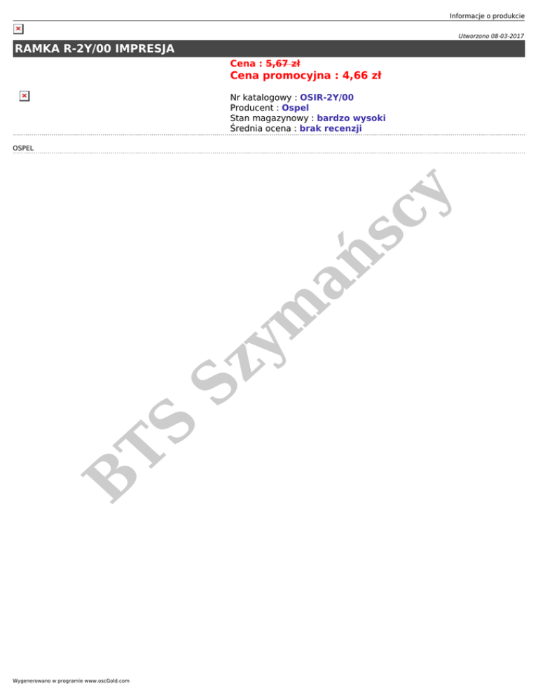 Informacje o produkcie Utworzono 08-03-2017 RAMKA R-2Y/00 IMPRESJA Cena : 5,67 zł Cena promocyjna : 4,66 zł Nr katalogowy : OSIR-2Y/00 Producent : Ospel Stan magazynowy : bardzo wysoki Średnia ocena : brak recenzji B TS Sz ym ań sc y OSPEL Wygenerowano w programie www.oscGold.com
