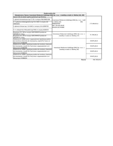 Osobna polisa dla: Ubezpieczony: Nazwa: Inwestycje Medyczne Łódzkiego (IMŁ) Sp. z o.o. z siedzibą w Łodzi ul. Okólnej 181, KRS Aparat USG do badań ogólnoszpitalnych typ Mindray 1. głowica konweksowa typ C7-3E nr seryjny PXB 49001108 2. 2. głowica endowaginalna typ V11-3WE nr seryjny LDJ 49001603 3. głowica liniowa typ L14-6WE nr seryjny LCA 41000759 Inwestycje Medyczne Łódzkiego (IMŁ) Sp. z o.o. Łodź ul. Okólna 181 KRS 0000507870 NIP: 726 265 40 60 REGON 101745880 175 000,00 zł Inwestycje Medyczne Łódzkiego (IMŁ) Sp. z o.o. z siedzibą w Łodzi ul. Okólnej 181 91 800,00 zł 4. 4. videoprinter Mitsubishi typ P93E nr seryjny 6030554 Respirator SV 300 nr seryjny GB52000030 producent MINDRAY Chiny Respirator SV 300 nr seryjny GB52000029 producent MINDRAY Chiny Platforma EV 1000A wraz z wyposażeniem (podstawa jezdna do monitora, klamerka do mocowania, czujnik Flo Trac) o nr fabrycznym EV080386 Platforma EV 1000A (podstawa jezdna do monitora, klamerka do mocowania, czujnik Flo Trac) wraz z wyposażeniem o nr fabrycznym EV080390 Platforma EV 1000A (podstawa jezdna do monitora, klamerka do mocowania, czujnik Flo Trac) wraz z wyposażeniem o nr fabrycznym EV080615 Platforma EV 1000A (podstawa jezdna do monitora, klamerka do mocowania, czujnik Flo Trac) wraz z wyposażeniem o nr fabrycznym EV080624 59 875,20 zł 59 875,20 zł Inwestycje Medyczne Łódzkiego (IMŁ) Sp. z o.o. z siedzibą w Łodzi ul. Okólnej 181 59 875,20 zł 59 875,20 zł Razem 506 300,80 zł