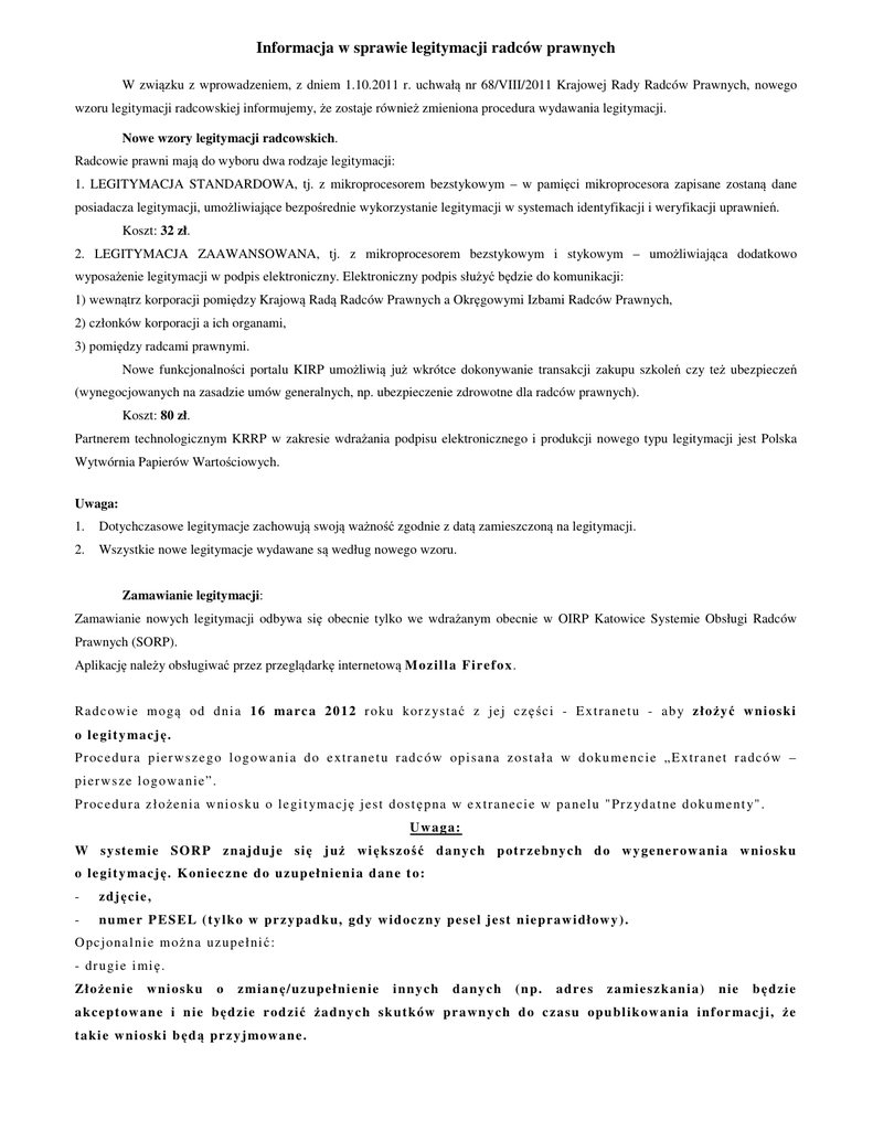 Informacja w sprawie legitymacji radców prawnych W związku z wprowadzeniem, z dniem 1.10.2011 r. uchwałą nr 68/VIII/2011 Krajowej Rady Radców Prawnych, nowego wzoru legitymacji radcowskiej informujemy, że zostaje również zmieniona procedura wydawania legitymacji. Nowe wzory legitymacji radcowskich. Radcowie prawni mają do wyboru dwa rodzaje legitymacji: 1. LEGITYMACJA STANDARDOWA, tj. z mikroprocesorem bezstykowym – w pamięci mikroprocesora zapisane zostaną dane posiadacza legitymacji, umożliwiające bezpośrednie wykorzystanie legitymacji w systemach identyfikacji i weryfikacji uprawnień. Koszt: 32 zł. 2. LEGITYMACJA ZAAWANSOWANA, tj. z mikroprocesorem bezstykowym i stykowym – umożliwiająca dodatkowo wyposażenie legitymacji w podpis elektroniczny. Elektroniczny podpis służyć będzie do komunikacji: 1) wewnątrz korporacji pomiędzy Krajową Radą Radców Prawnych a Okręgowymi Izbami Radców Prawnych, 2) członków korporacji a ich organami, 3) pomiędzy radcami prawnymi. Nowe funkcjonalności portalu KIRP umożliwią już wkrótce dokonywanie transakcji zakupu szkoleń czy też ubezpieczeń (wynegocjowanych na zasadzie umów generalnych, np. ubezpieczenie zdrowotne dla radców prawnych). Koszt: 80 zł. Partnerem technologicznym KRRP w zakresie wdrażania podpisu elektronicznego i produkcji nowego typu legitymacji jest Polska Wytwórnia Papierów Wartościowych. Uwaga: 1. Dotychczasowe legitymacje zachowują swoją ważność zgodnie z datą zamieszczoną na legitymacji. 2. Wszystkie nowe legitymacje wydawane są według nowego wzoru. Zamawianie legitymacji: Zamawianie nowych legitymacji odbywa się obecnie tylko we wdrażanym obecnie w OIRP Katowice Systemie Obsługi Radców Prawnych (SORP). Aplikację należy obsługiwać przez przeglądarkę internetową M oz il l a F ire f o x. Ra d c owi e m o gą od d n i a 1 6 ma rc a 2 0 1 2 r o ku kor z yst a ć z je j cz ę śc i - E x t ra ne t u - a b y z ł o ży ć w ni os ki o le gi t y ma cj ę. P r oc e d u r a p ier wsz e g o l o g ow a n i a d o e xtr a ne t u r ad c ów op i sa n a z ost ał a w d o ku m e nc ie „ E x tr a n et r a dc ó w – pi er w s ze l o g o wa n ie” . P r oc e d u r a z ł oże n ia w ni o sk u o le gi t yma c ję j est d ost ę p na w e x tr a ne ci e w pa n el u " Pr z yd a t ne d o ku me n t y" . Uw a g a: W sy st e mi e SOR P z n aj du j e si ę j uż wi ę ksz o ść d a ny c h p ot r z e bny c h d o w y ge ne r ow a ni a w ni o sku o le gi t y ma cj ę. K on iec z ne d o uz up eł ni en i a d an e t o: - zdj ę ci e , - nu me r P E S E L ( t y lk o w pr z y pa d ku, gdy w id oc zny pe se l j e st n ie pr aw i dł ow y ) . O pc jon a l n ie m oż n a uz u p eł ni ć : - dr u gi e i mi ę . Zł o że ni e w ni o sku o z mi a n ę/ uz upe ł ni en ie i nny ch d a ny c h (n p. a dre s z a mi e sz k an i a) nie bę dz ie a kce pt ow ane i n ie bę d zie r od zić ż a dny c h sk ut ków pr a wny ch d o c z a su opu bl ik ow ani a inf or ma cj i, że t a ki e w ni o ski b ęd ą pr z y j mow a ne . Status złożonego wniosku o legitymację można śledzić w Extranecie w panelu Legitymacje. Wniosek zostanie zaakceptowany po uiszczeniu opłaty za legitymację. Opłaty za legitymację należy dokonać na konto OIRP z adnotacją „OPŁATA ZA LEGITYMACJĘ” lub bezpośrednio w siedzibie Izby w godzinach: − pon. – czw.: 9.00 – 16.30, − pt.: 9.00 – 14.30. Przy odbiorze nowej legitymacji, radca, którego legitymacja utraciła ważność, obowiązany jest do jej zwrotu w siedzibie OIRP. OIRP Katowice
