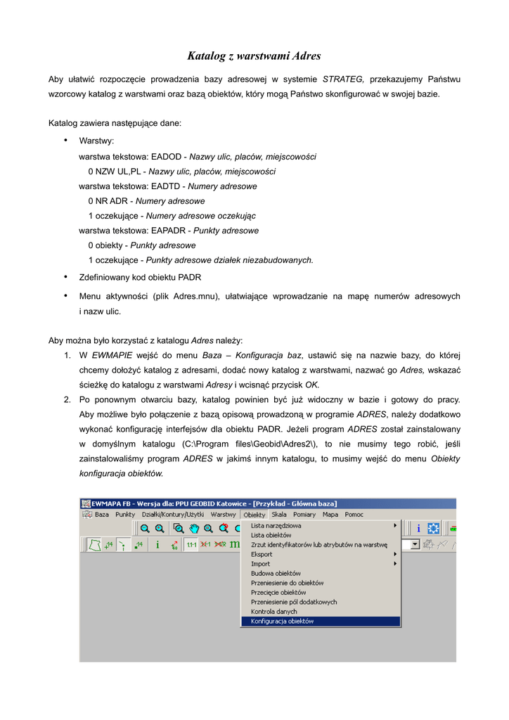 Katalog z warstwami Adres Aby ułatwić rozpoczęcie prowadzenia bazy adresowej w systemie STRATEG, przekazujemy Państwu wzorcowy katalog z warstwami oraz bazą obiektów, który mogą Państwo skonfigurować w swojej bazie. Katalog zawiera następujące dane: • Warstwy: warstwa tekstowa: EADOD - Nazwy ulic, placów, miejscowości 0 NZW UL,PL - Nazwy ulic, placów, miejscowości warstwa tekstowa: EADTD - Numery adresowe 0 NR ADR - Numery adresowe 1 oczekujące - Numery adresowe oczekując warstwa tekstowa: EAPADR - Punkty adresowe 0 obiekty - Punkty adresowe 1 oczekujące - Punkty adresowe działek niezabudowanych. • Zdefiniowany kod obiektu PADR • Menu aktywności (plik Adres.mnu), ułatwiające wprowadzanie na mapę numerów adresowych i nazw ulic. Aby można było korzystać z katalogu Adres należy: 1. W EWMAPIE wejść do menu Baza – Konfiguracja baz, ustawić się na nazwie bazy, do której chcemy dołożyć katalog z adresami, dodać nowy katalog z warstwami, nazwać go Adres, wskazać ścieżkę do katalogu z warstwami Adresy i wcisnąć przycisk OK. 2. Po ponownym otwarciu bazy, katalog powinien być już widoczny w bazie i gotowy do pracy. Aby możliwe było połączenie z bazą opisową prowadzoną w programie ADRES, należy dodatkowo wykonać konfigurację interfejsów dla obiektu PADR. Jeżeli program ADRES został zainstalowany w domyślnym katalogu (C:\Program files\Geobid\Adres2\), to nie musimy tego robić, jeśli zainstalowaliśmy program ADRES w jakimś innym katalogu, to musimy wejść do menu Obiekty konfiguracja obiektów. W oknie Wybierz katalog warstw: wybrać pozycję Adres (jeśli nie będzie tej pozycji, oznacza to że nie zostały wykonane czynności opisane w punkcie pierwszym, albo zostały wykonane źle) i wcisnąć OK. W oknie Konfiguracja obiektów w katalogu Adres, należy wcisnąć ikonę W oknie Konfiguracja interfejsów dla obiektu, należy zmienić ścieżkę C:\Program files\Geobid\Adres2\ na taką, w której został zainstalowany program ADRES. Po wykonaniu tych czynności i zatwierdzeniu konfiguracji przyciskiem OK, baza powinna być gotowa do pracy. Aby można było korzystać z menu aktywności Adres należy: 1. wejść do menu Baza – Konfiguracja 2. ustawić się na pozycji Warstwy – Menu Aktywności, przyciskiem przyciskiem dołożyć nowe menu, zmienić nazwę na Adres i wskazać ścieżkę do pliku z menu (powinien się on znajdować w katalogu Adres). 3. Po wciśnięciu OK, na ekranie powinna pojawić się listwa: Zawiera ona przyciski, przy pomocy których możemy w prosty sposób na odpowiednie warstwy wstawać elementy bazy adresowej.