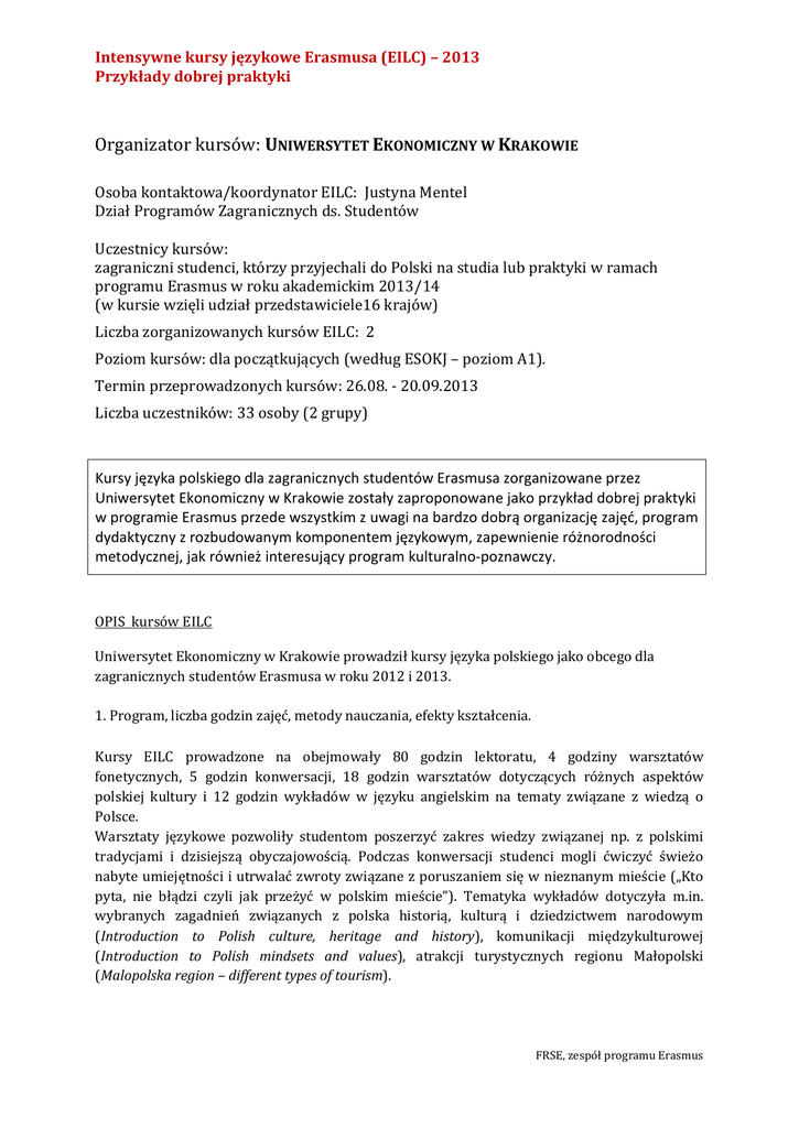 Intensywne kursy językowe Erasmusa (EILC) – 2013 Przykłady dobrej praktyki Organizator kursów: UNIWERSYTET EKONOMICZNY W KRAKOWIE Osoba kontaktowa/koordynator EILC: Justyna Mentel Dział Programów Zagranicznych ds. Studentów Uczestnicy kursów: zagraniczni studenci, którzy przyjechali do Polski na studia lub praktyki w ramach programu Erasmus w roku akademickim 2013/14 (w kursie wzięli udział przedstawiciele16 krajów) Liczba zorganizowanych kursów EILC: 2 Poziom kursów: dla początkujących (według ESOKJ – poziom A1). Termin przeprowadzonych kursów: 26.08. - 20.09.2013 Liczba uczestników: 33 osoby (2 grupy) Kursy języka polskiego dla zagranicznych studentów Erasmusa zorganizowane przez Uniwersytet Ekonomiczny w Krakowie zostały zaproponowane jako przykład dobrej praktyki w programie Erasmus przede wszystkim z uwagi na bardzo dobrą organizację zajęć, program dydaktyczny z rozbudowanym komponentem językowym, zapewnienie różnorodności metodycznej, jak również interesujący program kulturalno-poznawczy. OPIS kursów EILC Uniwersytet Ekonomiczny w Krakowie prowadził kursy języka polskiego jako obcego dla zagranicznych studentów Erasmusa w roku 2012 i 2013. 1. Program, liczba godzin zajęć, metody nauczania, efekty kształcenia. Kursy EILC prowadzone na obejmowały 80 godzin lektoratu, 4 godziny warsztatów fonetycznych, 5 godzin konwersacji, 18 godzin warsztatów dotyczących różnych aspektów polskiej kultury i 12 godzin wykładów w języku angielskim na tematy związane z wiedzą o Polsce. Warsztaty językowe pozwoliły studentom poszerzyć zakres wiedzy związanej np. z polskimi tradycjami i dzisiejszą obyczajowością. Podczas konwersacji studenci mogli ćwiczyć świeżo nabyte umiejętności i utrwalać zwroty związane z poruszaniem się w nieznanym mieście („Kto pyta, nie błądzi czyli jak przeżyć w polskim mieście”). Tematyka wykładów dotyczyła m.in. wybranych zagadnień związanych z polska historią, kulturą i dziedzictwem narodowym (Introduction to Polish culture, heritage and history), komunikacji międzykulturowej (Introduction to Polish mindsets and values), atrakcji turystycznych regionu Małopolski (Malopolska region – different types of tourism). FRSE, zespół programu Erasmus Intensywne kursy językowe Erasmusa (EILC) – 2013 Przykłady dobrej praktyki Stosowano przede wszystkim metodę komunikacyjną. Studenci poznawali struktury językowe na zajęciach, później zaś wykorzystywali je w praktyce – poza salą lekcyjną – na ulicy, w sklepie, na dworcu, w trakcie warsztatów. Studenci byli zobowiązani podejść do egzaminu połówkowego oraz końcowego. Wszyscy uczestnicy uzyskali pozytywna ocenę, a sześciu studentów zostało wyróżnionych za zaangażowanie i świetne rezultaty. 2. Kadra dydaktyczna Zajęcia dla obu kursów prowadziły trzy lektorki języka polskiego jako obcego, mające wykształcenie z dziedziny filologii polskiej i nauczania języka polskiego jako obcego oraz wieloletnie doświadczenie w nauczaniu obcokrajowców na krakowskich uczelniach i w szkołach językowych. Lektorki prowadziły zajęcia na zmianę, każda z dwóch grup miała więc kontakt z trzema nauczycielkami, z których jedna pełniła rolę lektorki wspomagającej. Do prowadzenia wykładów zaangażowano czterech nauczycieli akademickich UEK, znawców danej tematyki, oraz specjalistę z Urzędu Małopolskiego. 3. Program kulturalno-integracyjny Program obejmował zwiedzanie Krakowa, wizytę w Muzeum Etnograficznym, wycieczkę do Kopalni Soli w Wieliczce, Zakopanego, Oświęcimia oraz wycieczkę statkiem po Wiśle. Zorganizowano także m.in. „Eurodinner” – zajęcia mające na celu poznanie wszystkich uczestników kursów, ich tradycji i kultury poprzez przygotowywanie potraw narodowych; warsztaty tradycyjnego rzemiosła, na których studenci mieli okazję m.in. zapoznać się z tradycyjnymi ubiorami krakowskimi; „City Games” – zajęcia w terenie, organizowane przez studentów ESN, w trakcie których uczestnicy praktycznie wykorzystywali słownictwo poznane podczas zajęć. FRSE, zespół programu Erasmus
