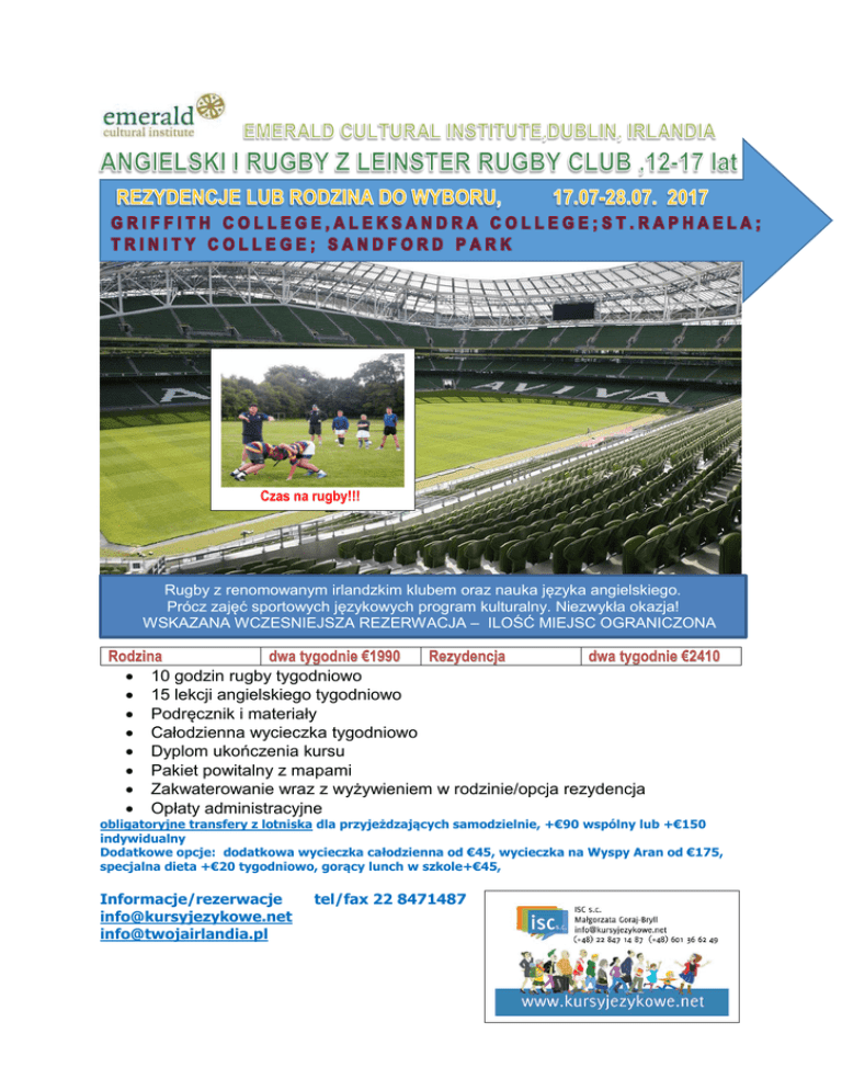 Czas na rugby!!! Rugby z renomowanym irlandzkim klubem oraz nauka języka angielskiego. Prócz zajęć sportowych językowych program kulturalny. Niezwykła okazja! WSKAZANA WCZESNIEJSZA REZERWACJA – ILOŚĆ MIEJSC OGRANICZONA Rodzina dwa tygodnie €1990 Rezydencja dwa tygodnie €2410 10 godzin rugby tygodniowo 15 lekcji angielskiego tygodniowo Podręcznik i materiały Całodzienna wycieczka tygodniowo Dyplom ukończenia kursu Pakiet powitalny z mapami Zakwaterowanie wraz z wyżywieniem w rodzinie/opcja rezydencja Opłaty administracyjne obligatoryjne transfery z lotniska dla przyjeżdzających samodzielnie, +€90 wspólny lub +€150 indywidualny Dodatkowe opcje: dodatkowa wycieczka całodzienna od €45, wycieczka na Wyspy Aran od €175, specjalna dieta +€20 tygodniowo, gorący lunch w szkole+€45, Informacje/rezerwacje [email protected] [email protected] tel/fax 22 8471487