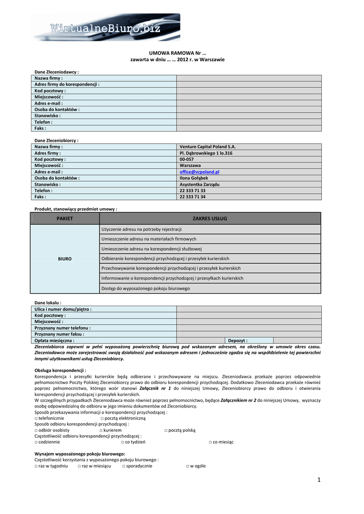 UMOWA RAMOWA Nr … zawarta w dniu … … 2012 r. w Warszawie Dane Zleceniodawcy : Nazwa firmy : Adres firmy do korespondencji : Kod pocztowy : Miejscowość : Adres e-mail : Osoba do kontaktów : Stanowisko : Telefon : Faks : Dane Zleceniobiorcy : Nazwa firmy : Adres firmy : Kod pocztowy : Miejscowość : Adres e-mail : Osoba do kontaktów : Stanowisko : Telefon : Faks : Venture Capital Poland S.A. Pl. Dąbrowskiego 1 lo.316 00-057 Warszawa [email protected] Ilona Gołąbek Asystentka Zarządu 22 333 71 33 22 333 71 34 Produkt, stanowiący przedmiot umowy : PAKIET ZAKRES USŁUG Użyczenie adresu na potrzeby rejestracji Umieszczenie adresu na materiałach firmowych Umieszczenie adresu na korespondencji służbowej BIURO Odbieranie korespondencji przychodzącej i przesyłek kurierskich Przechowywanie korespondencji przychodzącej i przesyłek kurierskich Informowanie o korespondencji przychodzącej i przesyłkach kurierskich Dostęp do wyposażonego pokoju biurowego Dane lokalu : Ulica i numer domu/piętro : Kod pocztowy : Miejscowość : Przyznany numer telefonu : Przyznany numer faksu : Opłata miesięczna : Depozyt : Zleceniobiorca zapewni w pełni wyposażoną powierzchnię biurową pod wskazanym adresem, na określony w umowie okres czasu. Zleceniodawca może zarejestrować swoją działalność pod wskazanym adresem i jednocześnie zgadza się na współdzielenie tej powierzchni innymi użytkownikami usług Zleceniobiorcy. Obsługa korespondencji : Korespondencja i przesyłki kurierskie będą odbierane i przechowywane na miejscu. Zleceniodawca przekaże poprzez odpowiednie pełnomocnictwo Poczty Polskiej Zleceniobiorcy prawo do odbioru korespondencji przychodzącej. Dodatkowo Zleceniodawca przekaże również poprzez pełnomocnictwo, którego wzór stanowi Załącznik nr 1 do niniejszej Umowy, Zleceniobiorcy prawo do odbioru i otwierania korespondencji przychodzącej i przesyłek kurierskich. W szczególnych przypadkach Zleceniodawca może również poprzez pełnomocnictwo, będące Załącznikiem nr 2 do niniejszej Umowy, wyznaczy osobę odpowiedzialną do odbioru w jego imieniu dokumentów od Zleceniobiorcy. Sposób przekazywania informacji o korespondencji przychodzącej : □ telefonicznie □ pocztą elektroniczną Sposób odbioru korespondencji przychodzącej : □ odbiór osobisty □ kurierem □ pocztą polską Częstotliwość odbioru korespondencji przychodzącej : □ codziennie □ co tydzień □ co miesiąc Wynajem wyposażonego pokoju biurowego: Częstotliwość korzystania z wyposażonego pokoju biurowego : □ raz w tygodniu □ raz w miesiącu □ sporadycznie □ w ogóle 1 DODATKOWE USŁUGI : Wynajem małej sali konferencyjnej (max.5 osób): Częstotliwość wynajmu małej sali konferencyjnej: □ raz w tygodniu □ raz w miesiącu □ sporadycznie Wynajem dużej sali konferencyjnej (max. 20 osób): Częstotliwość wynajmu dużej sali konferencyjnej: □ raz w tygodniu □ raz w miesiącu □ sporadycznie Szczegóły pakietu □ w ogóle □ w ogóle □ 6 miesięcy Okres obowiązywania Umowy Początek : □ 12 miesięcy RRRR-MM-DD Plan płatności : □ co roku z góry Opłata miesięczna Podatek lokalny Opłata łącznie Koniec : □ co 6 miesięcy z góry miesięczna RRRR-MM-DD □ co miesiąc z góry Opłata rejestracyjna + Podatek Depozyt (2 x opłata miesięczna) RAZEM Opłata początkowa łącznie Opłata miesięczna łącznie Adres do fakturowania : Nazwa : Adres firmy do korespondencji : Miejscowość : Kod pocztowy : Zleceniobiorca Zleceniodawca 2 1. 2. 3. 4. 1. 2. 3. 4. 5. 6. 7. 8. 9. 1. 2. 3. 4. 5. ZASADY I WARUNKI WSPÓŁPRACY §1 Przedmiot umowy Pakiet „Biuro” to usługa świadczona przez Venture Capital Poland S.A. („VCP”) uprawniająca Klienta do posługiwania się wskazanym w Umowie adresem jako adresem firmowym Klienta, uprawniająca do posługiwania się nim jako adresem rejestracyjnym siedziby Klienta i adresem korespondencyjnym, a także umożliwiająca odbiór korespondencji w imieniu Klienta. Niniejsze usługi obsługiwane będą zgodnie z instrukcjami Klienta, który ponosi odpowiedzialność za wszelkie związane z tym koszty operacyjne. VCP nie będzie przyjmować jakichkolwiek przedmiotów o wadze przekraczającej 5 kg, o którymkolwiek wymiarze przekraczającym 50 cm czy też o objętości większej niż 0,4 m 3 ani też przedmiotów zawierających jakiekolwiek materiały niebezpieczne, żywe lub ulegające rozkładowi, a także ma prawo według własnej decyzji zwracać nieodebrane przedmioty lub odmówić przyjęcia dowolnej ilości przedmiotów uznanych za nieracjonalne lub bezprawne. VCP nie gwarantuje i nie ponosi odpowiedzialności za jakiekolwiek usługi przewidziane niniejszym paragrafem. VCP zapewni dodatkowo możliwość z korzystania z sal konferencyjnych oraz wyposażonego pokoju biurowego za opłatą zgodną z cennikiem usług, stanowiącym Załącznik Nr 3 do niniejszej Umowy. Korzystanie wyposażonego pokoju biurowego może odbywać się wyłącznie pod wskazanym w Umowie adresem Klienta i nie może być przenoszone na inny adres. Z produktu korzystać mogą wyłącznie osoby wymienione w Umowie w normalnych godzinach pracy, w blokach 8-godzinnych. VCP ma prawo zażądać okazania dowodu tożsamości. Niniejsza umowa ma zastosowanie wyłącznie do osób wymienionych na jej pierwszej stronie, zaś VCP nie jest w żaden sposób zobowiązane do świadczenia tej usługi jakimkolwiek innym osobom ani też nie ponosi odpowiedzialności za jakąkolwiek otrzymaną korespondencję i rozmowy skierowane do innych osób. Dostęp do VCP możliwy jest w normalnych godzinach pracy, chyba, że umowa stanowi inaczej. §2 Czas trwania umowy Umowa ważna jest przez wskazany w niej okres, po upływie którego ulega automatycznemu przedłużeniu na kolejne okresy równe okresowi pierwotnemu, aż do rozwiązania przez jedną ze stron. Wszystkie takie okresy będą trwać do ostatniego dnia miesiąca, w którym dobiegłyby końca. 