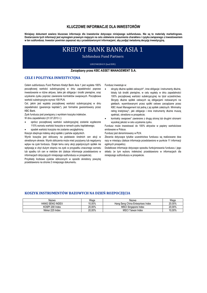 KLUCZOWE INFORMACJE DLA INWESTORÓW Niniejszy dokument zawiera kluczowe informacje dla inwestorów dotyczące niniejszego subfunduszu. Nie są to materiały marketingowe. Dostarczenie tych informacji jest wymogiem prawnym mającym na celu ułatwienie zrozumienia charakteru i ryzyka związanego z inwestowaniem w ten subfundusz. Inwestor powinien zapoznać się z przedstawionymi informacjami, aby podjąć świadomą decyzję inwestycyjną. KREDYT BANK BANK ASIA 1 Subfundusz Fund Partners LU0294028419 (kod ISIN) Zarządzany przez KBC ASSET MANAGEMENT S.A. CELE I POLITYKA INWESTYCYJNA Celem subfunduszu Fund Partners Kredyt Bank Asia 1 jest wypłata 100% początkowej wartości subskrypcyjnej w dniu zapadalności poprzez inwestowanie w różne aktywa, takie jak obligacje i środki pieniężne, oraz uzyskanie zysku poprzez zawieranie kontraktów swapowych. Początkowa wartość subskrypcyjna wynosi 100 PLN. Cel, jakim jest wypłata początkowej wartości subskrypcyjnej w dniu zapadalności (gwarancja kapitału*), jest formalnie gwarantowany przez KBC Bank. Zysk funduszu jest powiązany z wynikiem koszyka indeksów. W dniu zapadalności (31.07.2013 r.): oprócz początkowej wartości subskrypcyjnej zostanie wypłacone 110% wzrostu wartości koszyka w ramach zysku kapitałowego; spadek wartości koszyka nie zostanie uwzględniony. Koszyk obejmuje indeksy akcji spółek z państw azjatyckich. Wynik koszyka jest obliczany na podstawie średnich cen akcji w określonym okresie. Wynik obliczenia może mieć pozytywny lub negatywny wpływ na zysk funduszu. Dzięki temu ceny akcji pojedynczych spółek nie wpływają w zbyt dużym stopniu na zysk w przypadku znacznego wzrostu lub spadku ich cen w niektóre dni (dalsze informacje przedstawiono w informacjach dotyczących niniejszego subfunduszu w prospekcie). Przykłady liczbowe zysków obliczonych w sposób określony powyżej przedstawiono na stronie 2 niniejszego dokumentu. Fundusz inwestuje w: skrypty dłużne spółek celowych*, inne obligacje i instrumenty dłużne, lokaty lub środki pieniężne, w celu wypłaty w dniu zapadalności 100% początkowej wartości subskrypcyjnej na tytuł uczestnictwa. Skrypty dłużne spółek celowych są obligacjami notowanymi na giełdach, wyemitowanymi przez spółki celowe zarządzane przez KBC Asset Management lub jedną z jej spółek zależnych. Minimalny rating kredytowy*, jaki obligacje i inne instrumenty dłużne muszą spełniać, określono w prospekcie; kontrakty swapowe* zawierane z drugą stroną lub drugimi stronami wysokiej jakości w celu uzyskania zysku. Fundusz może inwestować do 100% aktywów w papiery wartościowe emitowane w Polsce. Fundusz jest denominowany w PLN. Zlecenia dotyczące tytułów uczestnictwa funduszu są realizowane dwa razy w miesiącu (dalsze informacje przedstawiono w punkcie 11 informacji ogólnych prospektu). Dodatkowe informacje dotyczące sposobu funkcjonowania funduszu i jego składu (w tym wyboru indeksów) przedstawiono w informacjach dla niniejszego subfunduszu w prospekcie. KOSZYK INSTRUMENTÓW BAZOWYCH NA DZIEŃ ROZPOCZĘCIA Nazwa HANG SENG INDEX KOSPI 200 Index Nikkei 225 Index Waga 10,00% 20,00% 20,00% Nazwa Hang Seng China Enterprises Index MSCI Singapore Index MSCI Taiwan Index Waga 20,00% 20,00% 10,00% SCENARIUSZE WYNIKÓW Poniższe przykłady wyjaśniają określone powyżej cele i politykę inwestycyjną. SCENARIUSZ Zmiana wartości koszyka (*) -10% Wówczas wynik w dniu zapadalności (przed odliczeniem opłat) wynosi: 0% (**) i jest doliczany do kapitału początkowego wynoszącego 100 PLN; w dniu zapadalności inwestor otrzymuje: Negatywny 100 + (0% x 100) = 100 PLN (0% średnio rocznie, przed odliczeniem podatków i opłat) Neutralny 15% 110% x 15% = 16,50% 100 + (16,50% x 100) = 116,50 PLN (2,56% średnio rocznie, przed odliczeniem podatków i opłat) Pozytywny 50% 110% x 50% = 55% 100 + (55% x 100) = 155 PLN (7,52% średnio rocznie, przed odliczeniem podatków i opłat) (*) Przy zastosowaniu formuły (wartość końcowa - wartość początkowa) / wartość początkowa (**) wynik ujemny nie będzie brany pod uwagę. Wartość inwestycji obliczona zgodnie z formułą określoną w przykładach może być wyższa lub niższa od wartości aktywów bazowych. Przedstawione scenariusze nie stanowią prognoz przyszłych oczekiwanych wyników, ani nie wskazują, który scenariusz jest najbardziej prawdopodobny. W przypadku sprzedania tytułów uczestnictwa przed dniem zapadalności wartość inwestycji jest obliczana na podstawie wartości rynkowej aktywów bazowych, a nie według formuły zastosowanej w przykładach. Oznacza to, że wartość inwestycji może wzrosnąć jak i zmniejszyć się, a inwestorzy mogą nie odzyskać zainwestowanej kwoty, w tym jeżeli tytuły uczestnictwa zostaną sprzedane przed dniem zapadalności. Dlaczego wskaźnik ryzyka i zysku dla niniejszego funduszu wynosi 1? PROFIL RYZYKA I ZYSKU Niższe ryzyko Wyższe ryzyko Potencjalnie niższy zysk 1 2 3 Potencjalnie wyższy zysk 4 5 6 7 Powyższa liczba wynika z danych historycznych i nie zawsze jest wiarygodnym wskaźnikiem ryzyka i zysku w przyszłości. Syntetyczny wskaźnik ryzyka i zysku jest regularnie weryfikowany i w związku z tym może wzrosnąć, jak i się zmniejszyć. Najniższa liczba nie oznacza, że inwestycja jest w całości pozbawiona ryzyka. Jednak wskazuje, że w porównaniu z wyższymi liczbami, produkt ten na ogół zapewni niższy, ale bardziej przewidywalny zysk. Liczba ta określa zysk, jaki fundusz może uzyskać, ale również związane z tym ryzyko. Im wyższa liczba, tym większy potencjalny zysk, ale również większa trudność związana z prognozowaniem tego zysku. Inwestor może nawet ponieść stratę. Liczbę obliczono dla inwestora dokonującego inwestycji w PLN. Liczba „1” wskazuje, że niniejszy fundusz jest jednym z obarczonych najmniejszym ryzykiem funduszy strukturyzowanych, które mają ustalony dzień zapadalności i oferują gwarancję