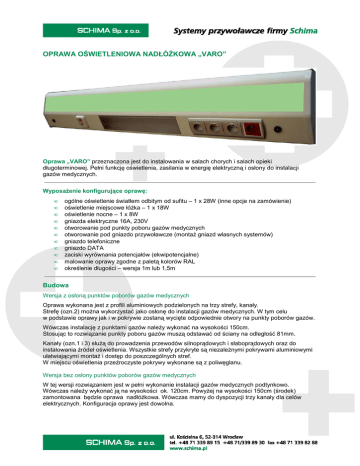 OPRAWA OŚWIETLENIOWA NADŁÓŻKOWA „VARO” Oprawa „VARO” przeznaczona jest do instalowania w salach chorych i salach opieki długoterminowej. Pełni funkcję oświetlenia, zasilania w energię elektryczną i osłony do instalacji gazów medycznych. Wyposażenie konfigurujące oprawę: • • • • • • • • • • • ogólne oświetlenie światłem odbitym od sufitu – 1 x 28W (inne opcje na zamówienie) oświetlenie miejscowe łóżka – 1 x 18W oświetlenie nocne – 1 x 8W gniazda elektryczne 16A, 230V otworowanie pod punkty poboru gazów medycznych otworowanie pod gniazdo przywoławcze (montaż gniazd własnych systemów) gniazdo telefoniczne gniazdo DATA zaciski wyrównania potencjałów (ekwipotencjalne) malowanie oprawy zgodne z paletą kolorów RAL określenie długości – wersja 1m lub 1,5m Budowa Wersja z osłoną punktów poborów gazów medycznych Oprawa wykonana jest z profili aluminiowych podzielonych na trzy strefy, kanały. Strefę (ozn.2) można wykorzystać jako osłonę do instalacji gazów medycznych. W tym celu w podstawie oprawy jak i w pokrywie zostaną wycięte odpowiednie otwory na punkty poborów gazów. Wówczas instalację z punktami gazów należy wykonać na wysokości 150cm. Stosując to rozwiązanie punkty poboru gazów muszą odstawać od ściany na odległość 81mm. Kanały (ozn.1 i 3) służą do prowadzenia przewodów silnoprądowych i słaboprądowych oraz do instalowania źródeł oświetlenia. Wszystkie strefy przykryte są niezależnymi pokrywami aluminiowymi ułatwiającymi montaż i dostęp do poszczególnych stref. W miejscu oświetlenia przeźroczyste pokrywy wykonane są z poliwęglanu. Wersja bez osłony punktów poborów gazów medycznych W tej wersji rozwiązaniem jest w pełni wykonanie instalacji gazów medycznych podtynkowo. Wówczas należy wykonać ją na wysokości ok. 120cm. Powyżej na wysokości 150cm (środek) zamontowana będzie oprawa nadłóżkowa. Wówczas mamy do dyspozycji trzy kanały dla celów elektrycznych. Konfiguracja oprawy jest dowolna. Charakterystyka Oferowane oprawy występują w dwóch długościach – 1m i 1,5m, oraz ich wielokrotnościach. Wyposażenie elektryczne oprawy dobierane jest indywidualnie zgodnie z życzeniem inwestora. Otwory montażowe dla instalacji elektrycznej i teletechnicznej wykonujemy zgodnie z sugestią instalatora-projektanta lub wykonujemy z prawej strony oprawy (patrząc od przodu) w górnym lub środkowym kanale (w górnym jeżeli zakrywamy instalację gazową). Dostępne są wersje opraw prawo i lewo stronne. Istnieje możliwość tworzenia opraw wielostanowiskowych, płynnie przechodzących nad wszystkimi łóżkami. Malowaniu poddane mogą być wszystkie kanały. Kolor należy wskazać z palety kolorów RAL. Przykładowy sposób malowania prezentuje poniższe zdjęcie. Strefy 1 i 3 są białe, malowana jest jedynie pokrywa przysłaniająca strefę 2. Zgodność z normami i przepisami: • • • PN-EN 60598-1:2009 PN-EN 60598-2-25:2000 PN-EN 12464-1:2004