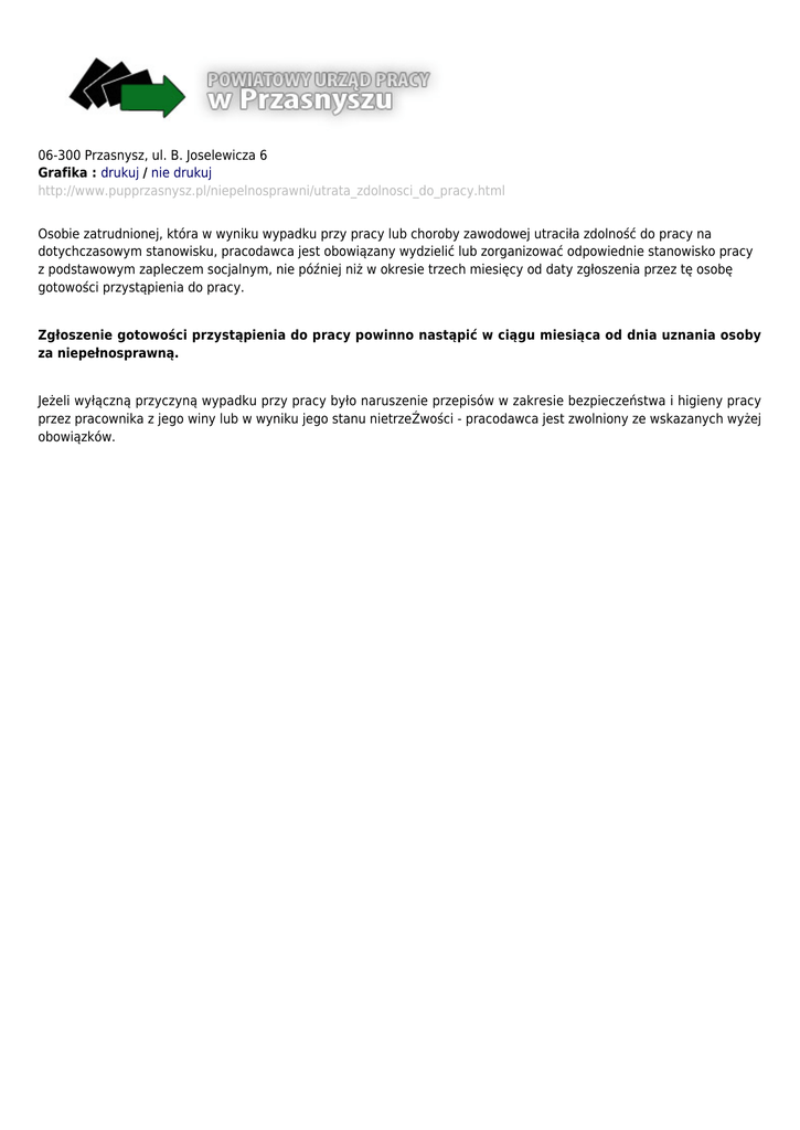 06-300 Przasnysz, ul. B. Joselewicza 6 Grafika : drukuj / nie drukuj http://www.pupprzasnysz.pl/niepelnosprawni/utrata_zdolnosci_do_pracy.html Osobie zatrudnionej, która w wyniku wypadku przy pracy lub choroby zawodowej utraciła zdolność do pracy na dotychczasowym stanowisku, pracodawca jest obowiązany wydzielić lub zorganizować odpowiednie stanowisko pracy z podstawowym zapleczem socjalnym, nie później niż w okresie trzech miesięcy od daty zgłoszenia przez tę osobę gotowości przystąpienia do pracy. Zgłoszenie gotowości przystąpienia do pracy powinno nastąpić w ciągu miesiąca od dnia uznania osoby za niepełnosprawną. Jeżeli wyłączną przyczyną wypadku przy pracy było naruszenie przepisów w zakresie bezpieczeństwa i higieny pracy przez pracownika z jego winy lub w wyniku jego stanu nietrzeŹwości - pracodawca jest zwolniony ze wskazanych wyżej obowiązków.