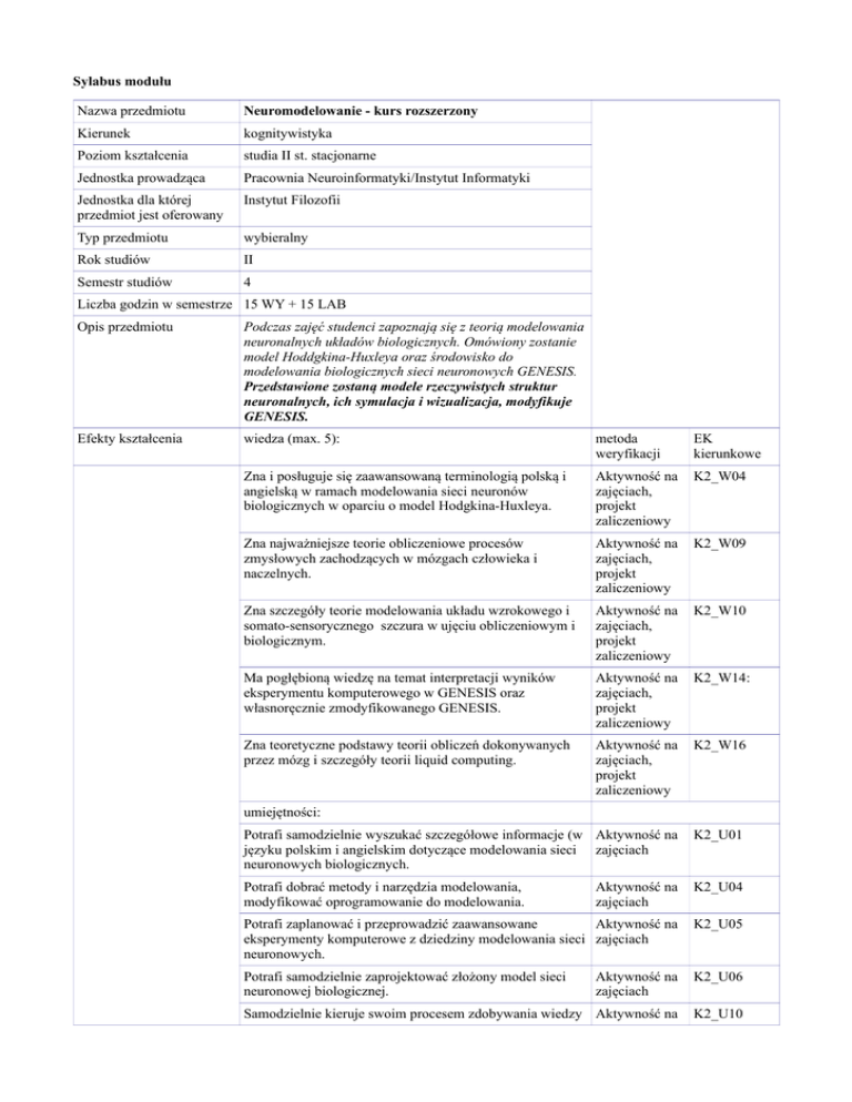 Sylabus modułu Nazwa przedmiotu Neuromodelowanie - kurs rozszerzony Kierunek kognitywistyka Poziom kształcenia studia II st. stacjonarne Jednostka prowadząca Pracownia Neuroinformatyki/Instytut Informatyki Jednostka dla której przedmiot jest oferowany Instytut Filozofii Typ przedmiotu wybieralny Rok studiów II Semestr studiów 4 Liczba godzin w semestrze 15 WY + 15 LAB Opis przedmiotu Podczas zajęć studenci zapoznają się z teorią modelowania neuronalnych układów biologicznych. Omówiony zostanie model Hoddgkina-Huxleya oraz środowisko do modelowania biologicznych sieci neuronowych GENESIS. Przedstawione zostaną modele rzeczywistych struktur neuronalnych, ich symulacja i wizualizacja, modyfikuje GENESIS. Efekty kształcenia wiedza (max. 5): metoda weryfikacji EK kierunkowe Zna i posługuje się zaawansowaną terminologią polską i angielską w ramach modelowania sieci neuronów biologicznych w oparciu o model Hodgkina-Huxleya. Aktywność na zajęciach, projekt zaliczeniowy K2_W04 Zna najważniejsze teorie obliczeniowe procesów zmysłowych zachodzących w mózgach człowieka i naczelnych. Aktywność na zajęciach, projekt zaliczeniowy K2_W09 Zna szczegóły teorie modelowania układu wzrokowego i somato-sensorycznego szczura w ujęciu obliczeniowym i biologicznym. Aktywność na zajęciach, projekt zaliczeniowy K2_W10 Ma pogłębioną wiedzę na temat interpretacji wyników eksperymentu komputerowego w GENESIS oraz własnoręcznie zmodyfikowanego GENESIS. Aktywność na zajęciach, projekt zaliczeniowy K2_W14: Zna teoretyczne podstawy teorii obliczeń dokonywanych przez mózg i szczegóły teorii liquid computing. Aktywność na zajęciach, projekt zaliczeniowy K2_W16 Potrafi samodzielnie wyszukać szczegółowe informacje (w Aktywność na języku polskim i angielskim dotyczące modelowania sieci zajęciach neuronowych biologicznych. K2_U01 Potrafi dobrać metody i narzędzia modelowania, modyfikować oprogramowanie do modelowania. Aktywność na zajęciach K2_U04 Potrafi zaplanować i przeprowadzić zaawansowane Aktywność na eksperymenty komputerowe z dziedziny modelowania sieci zajęciach neuronowych. K2_U05 Potrafi samodzielnie zaprojektować złożony model sieci neuronowej biologicznej. Aktywność na zajęciach K2_U06 Samodzielnie kieruje swoim procesem zdobywania wiedzy Aktywność na K2_U10 umiejętności: i umiejętności w zakresie modelowania sieci neuronowych biologicznych. Korzysta z forów internetowych. zajęciach Kompetencje społeczne: Współpracuje w zespołach studenckich i wirtualnych. 2 3 Literatura G. M. Wójcik, Modelowanie i eksploracja sieci neuronów biologicznych w GENESIS, Lublin: Instytut Informatyki UMCS, 2012 Punkty ECTS 3 Ogólna forma zaliczenia Zaliczenie z oceną Warunki zaliczenia 1. Obecność na zajęciach min 85% 2. aktywność na zajęciach 3. projekt zaliczeniowy Język wykładowy polski Koordynator przedmiotu Dr hab. Grzegorz M. Wójcik Dodatkowe informacje Np. adres strony internetowej kursu Aktywność na zajęciach