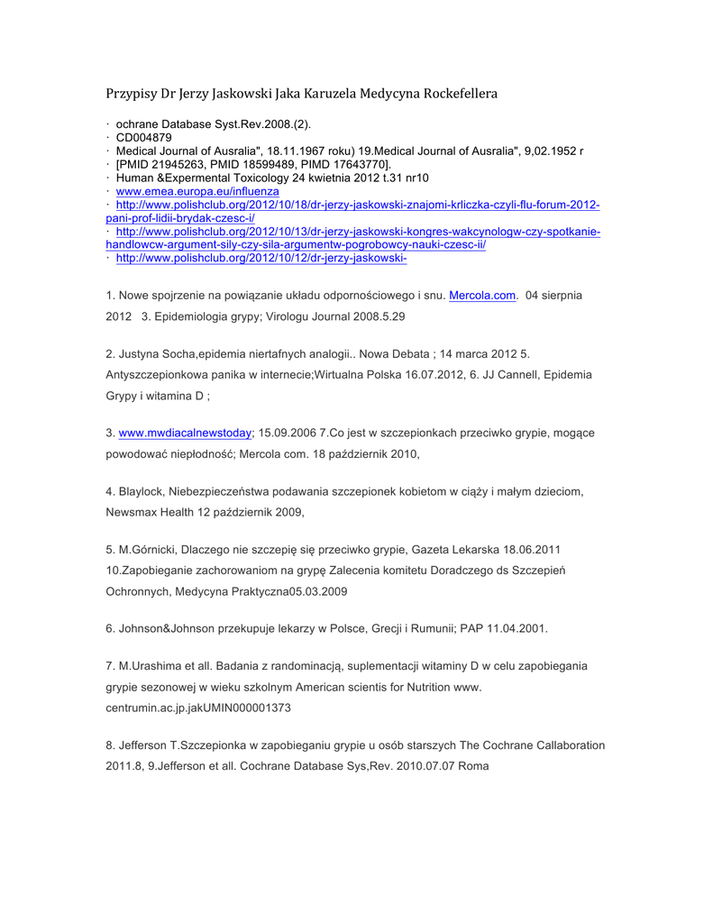 Przypisy Dr Jerzy Jaskowski Jaka Karuzela Medycyna Rockefellera · ochrane Database Syst.Rev.2008.(2). · CD004879 · Medical Journal of Ausralia", 18.11.1967 roku) 19.Medical Journal of Ausralia", 9,02.1952 r · [PMID 21945263, PMID 18599489, PIMD 17643770]. · Human &Expermental Toxicology 24 kwietnia 2012 t.31 nr10 · www.emea.europa.eu/influenza · http://www.polishclub.org/2012/10/18/dr-jerzy-jaskowski-znajomi-krliczka-czyli-flu-forum-2012pani-prof-lidii-brydak-czesc-i/ · http://www.polishclub.org/2012/10/13/dr-jerzy-jaskowski-kongres-wakcynologw-czy-spotkaniehandlowcw-argument-sily-czy-sila-argumentw-pogrobowcy-nauki-czesc-ii/ · http://www.polishclub.org/2012/10/12/dr-jerzy-jaskowski1. Nowe spojrzenie na powiązanie układu odpornościowego i snu. Mercola.com. 04 sierpnia 2012 3. Epidemiologia grypy; Virologu Journal 2008.5.29 2. Justyna Socha,epidemia niertafnych analogii.. Nowa Debata ; 14 marca 2012 5. Antyszczepionkowa panika w internecie;Wirtualna Polska 16.07.2012, 6. JJ Cannell, Epidemia Grypy i witamina D ; 3. www.mwdiacalnewstoday; 15.09.2006 7.Co jest w szczepionkach przeciwko grypie, mogące powodować niepłodność; Mercola com. 18 październik 2010, 4. Blaylock, Niebezpieczeństwa podawania szczepionek kobietom w ciąży i małym dzieciom, Newsmax Health 12 październik 2009, 5. M.Górnicki, Dlaczego nie szczepię się przeciwko grypie, Gazeta Lekarska 18.06.2011 10.Zapobieganie zachorowaniom na grypę Zalecenia komitetu Doradczego ds Szczepień Ochronnych, Medycyna Praktyczna05.03.2009 6. Johnson&Johnson przekupuje lekarzy w Polsce, Grecji i Rumunii; PAP 11.04.2001. 7. M.Urashima et all. Badania z randominacją, suplementacji witaminy D w celu zapobiegania grypie sezonowej w wieku szkolnym American scientis for Nutrition www. centrumin.ac.jp.jakUMIN000001373 8. Jefferson T.Szczepionka w zapobieganiu grypie u osób starszych The Cochrane Callaboration 2011.8, 9.Jefferson et all. Cochrane Database Sys,Rev. 2010.07.07 Roma 10. Connell JJ et all. Epidemiologia grypy a witamina D. Epidemiol.Infect.2006.grudzień,134,1149-40 11.Immunologia Trop.J.Med.2011;2011,706304 maj05, 12. Smith S et all. Szczepionki w zapobieganiu grypie u zdrowych dzieci, Cochrane Database Syst.Rev.2008.(2). CD004879 13. Medical Journal of Ausralia", 18.11.1967 roku) 19.Medical Journal of Ausralia", 9,02.1952 r 14 -18 [PMID 21945263, PMID 18599489, PIMD 17643770]. 19. Human &Expermental Toxicology 24 kwietnia 2012 t.31 nr10 20. www.emea.europa.eu/influenza 21. http://www.polishclub.org/2012/10/18/dr-jerzy-jaskowski-znajomi-krliczka-czyli-flu-forum-2012pani-prof-lidii-brydak-czesc-i/ 22. http://www.polishclub.org/2012/10/13/dr-jerzy-jaskowski-kongres-15.wakcynologw-czyspotkanie-handlowcw-argument-sily-czy-sila-argumentw-pogrobowcy-nauki-czesc-ii/ 23.http://www.polishclub.org/2012/10/12/dr-jerzy-jaskowski-kongres-wakcynologw-czy-spotkaniehandlowcw-argument-sily-czy-sila-argumentw-pogrobowcy-nauki-czesc-i/